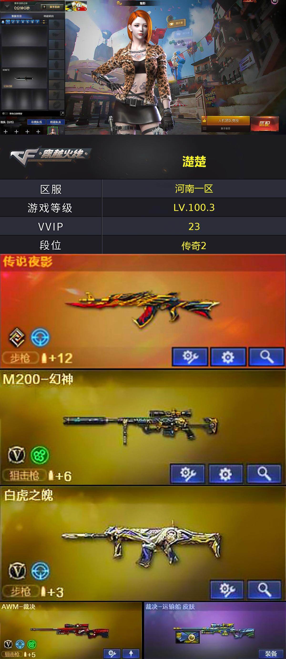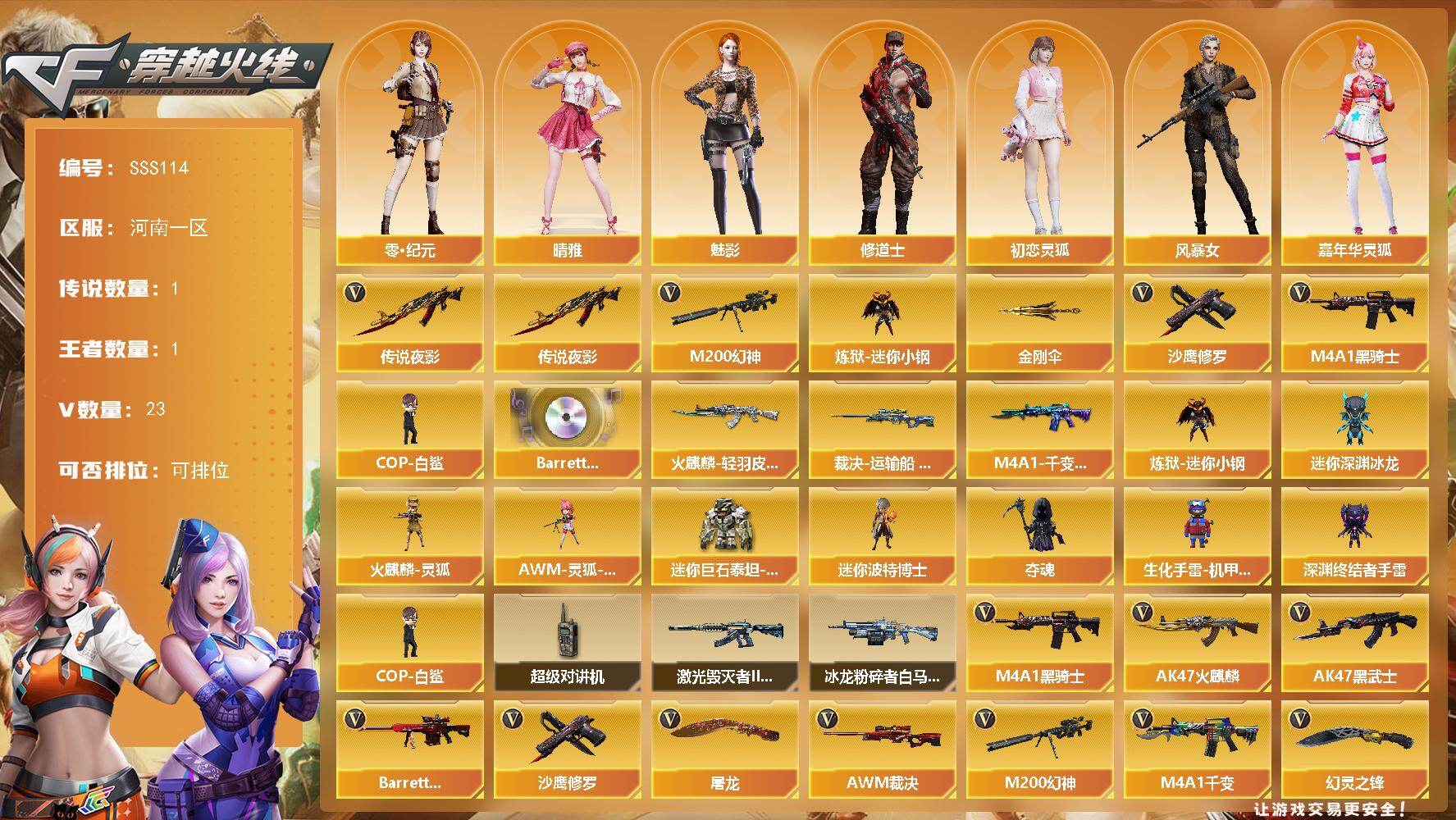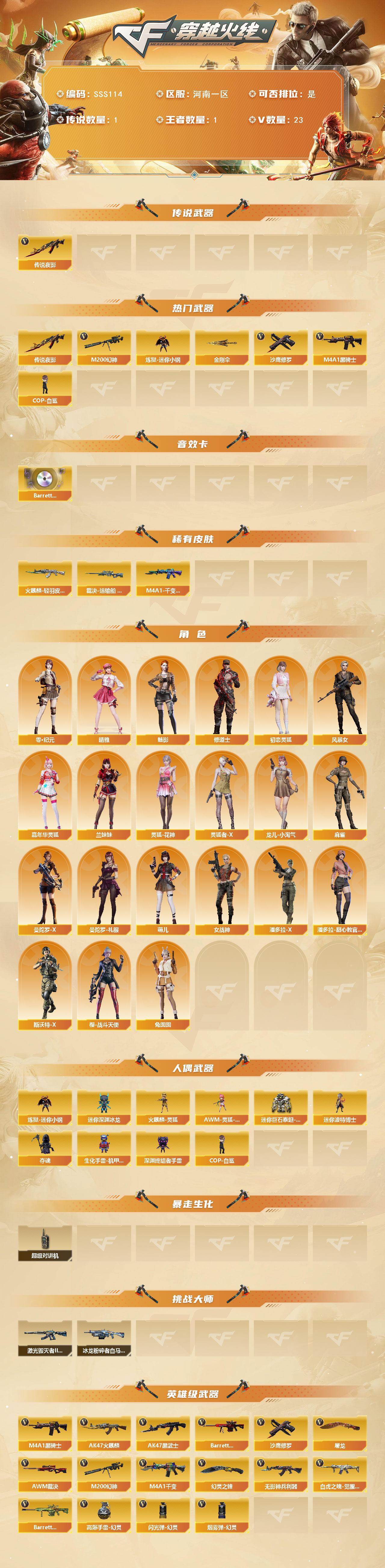 [17423782]河南一区-27V-1王者武器数-0炫金武器数 【传说武器】:传说夜影 【热门武器】:传说夜影,M200-幻神,炼狱-迷你小钢,M4A1-黑骑士,COP-白鲨,沙鹰-修罗,金刚伞 【音效卡】:Barrett-碧霄极光音效卡 【皮肤】:裁决-运输船 皮肤,火麒麟-轻羽皮肤,M4A1-千变-孔明皮肤 【角色】:魅影,晴雅,零·纪元,修道士,初恋灵狐,风暴女,嘉年华灵狐,兰妹妹,灵狐-花神,灵狐者-X,龙儿-小淘气,麻雀,曼陀罗-X,曼陀罗-礼服,萌儿,女战神,潘多拉-X,潘多拉-甜心教官,斯沃特-X,兔囡囡,樱-战斗天使 【人偶武器】:COP-白鲨,火麒麟-灵狐,炼狱-迷你小钢,AWM-灵狐-15周年嘉年华*2,迷你深渊冰龙,迷你波特博士,夺魂,生化手雷-机甲核心*2,深渊终结者手雷*2,迷你巨石泰坦-魔花研究所 【暴走生化】:超级对讲机 【挑战大师】:冰龙粉碎者-白马银枪,激光毁灭者III-白马银枪 【英雄级武器】:M4A1-千变,AK47-火麒麟,M4A1-黑骑士,AK47-黑武士,无影-神兵利器,白虎之魄-觉醒版,机械迷城-穹宇,Barrett-极光,AWM-裁决,M200-幻神,沙鹰-修罗,屠龙,幻灵之锋,高爆手雷-幻灵*2,闪光弹-幻灵*2,烟雾弹-幻灵*2,Barrett-碧霄极光 【道具】:BS战队炫彩背包,云山科技背包,炫彩背包-诺拉,女皇终结者-魔龙之吻,救世主-黑桃战神,绿色巨人,灵魂忍者,变异宝贝,迷雾幽灵,夺命之镰*2,防化服*3,金色流光-枪王排位*2,星辰流光-枪王排位,流光-鎏金之域,流光-再燃火线,枪王排位28赛季金色流光,枪王排位29赛季金色流光,防弹头盔*4,防弹衣*4,C4工具钳*4,手雷包*4 【特殊枪械】:1黑骑士