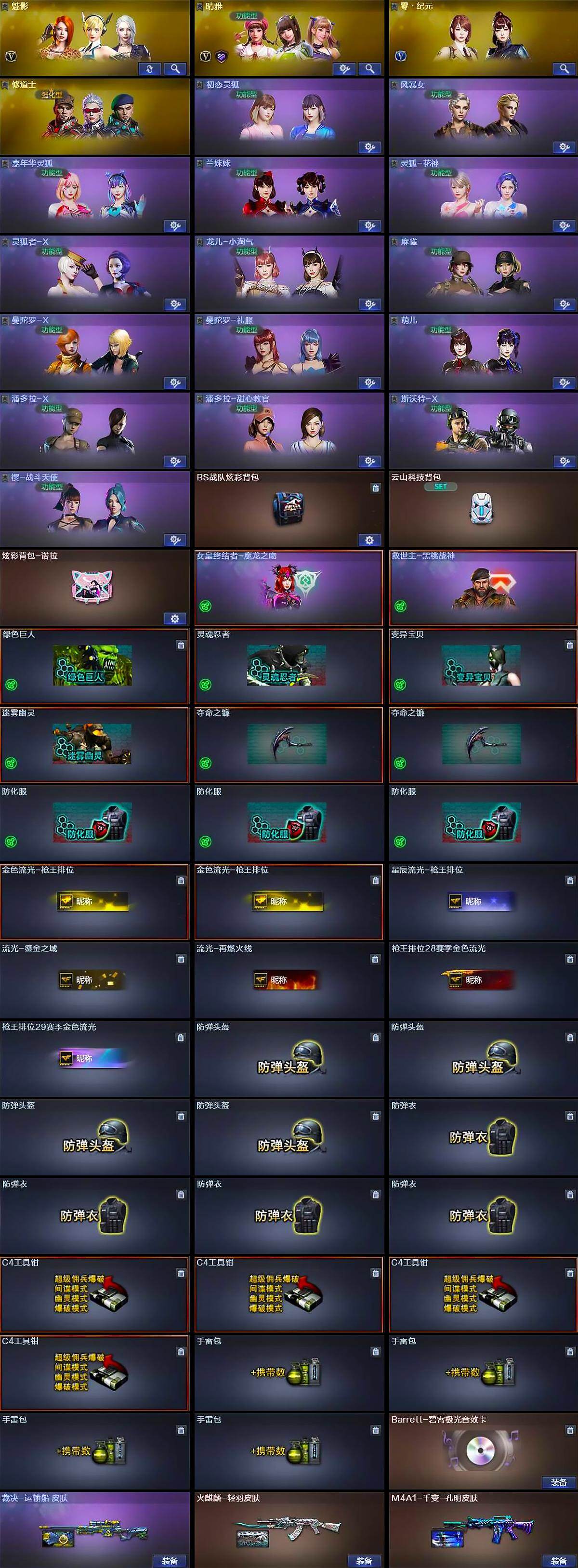 【道具】:BS战队炫彩背包,云山科技背包,炫彩背包-诺拉,女皇终结者-魔龙之吻,救世主-黑桃战神,绿色巨人,灵魂忍者,变异宝贝,迷雾幽灵,夺命之镰*2,防化服*3,金色流光-枪王排位*2,星辰流光-枪王排位,流光-鎏金之域,流光-再燃火线,枪王排位28赛季金色流光,枪王排位29赛季金色流光,防弹头盔*4,防弹衣*4,C4工具钳*4,手雷包*4