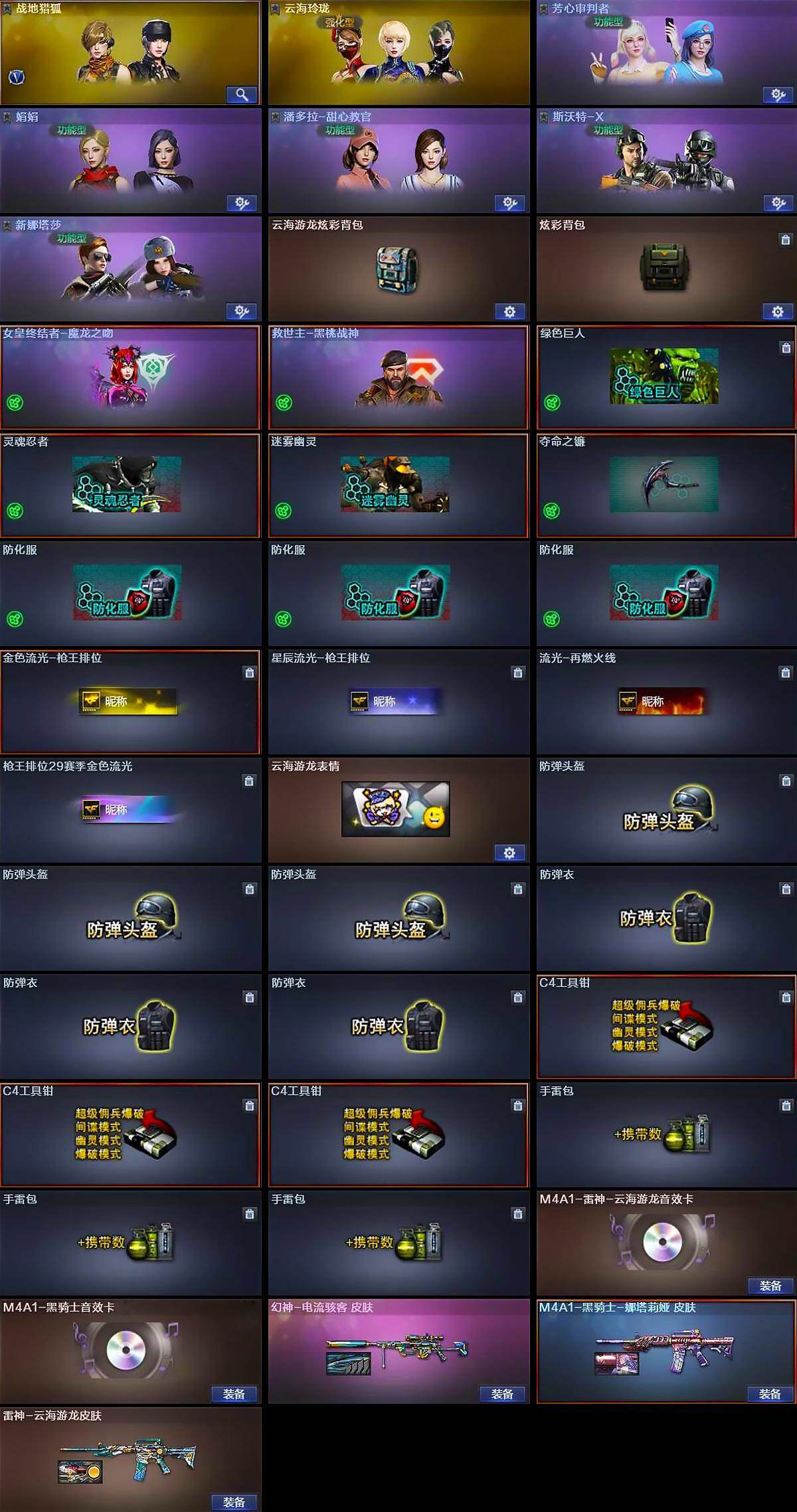 【道具】:云海游龙炫彩背包,炫彩背包,女皇终结者-魔龙之吻,救世主-黑桃战神,绿色巨人,灵魂忍者,迷雾幽灵,夺命之镰,防化服*3,金色流光-枪王排位,星辰流光-枪王排位,流光-再燃火线,枪王排位29赛季金色流光,云海游龙表情,防弹头盔*3,防弹衣*3,C4工具钳*3,手雷包*3