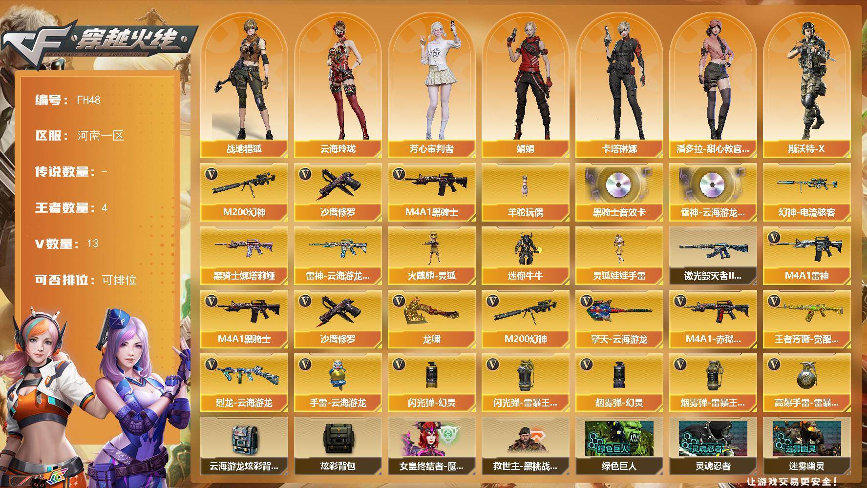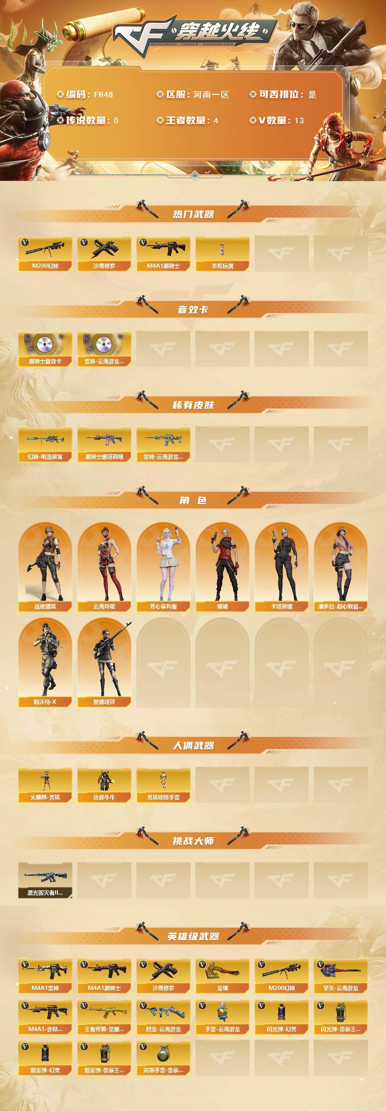 [17424179]河南一区-15V-4王者武器数-0炫金武器数 【热门武器】:M200-幻神,M4A1-黑骑士,羊驼玩偶,沙鹰-修罗*2 【音效卡】:M4A1-雷神-云海游龙音效卡,M4A1-黑骑士音效卡 【皮肤】:幻神-电流骇客 皮肤,雷神-云海游龙皮肤,M4A1-黑骑士-娜塔莉娅 皮肤 【角色】:战地猎狐,云海玲珑,芳心审判者,娟娟,卡塔琳娜,潘多拉-甜心教官,斯沃特-X,新娜塔莎 【人偶武器】:火麒麟-灵狐,迷你牛牛,灵狐娃娃手雷 【挑战大师】:激光毁灭者III-白马银枪 【英雄级武器】:M4A1-雷神,M4A1-黑骑士,王者芳薇-觉醒版,机械迷城-穹宇,M200-幻神,烈龙-云海游龙,沙鹰-修罗*2,龙啸,擎天-云海游龙,手雷-云海游龙,高爆手雷-雷暴王者,闪光弹-幻灵,闪光弹-雷暴王者,烟雾弹-幻灵,烟雾弹-雷暴王者,M4A1-赤狱骑士 【道具】:云海游龙炫彩背包,炫彩背包,女皇终结者-魔龙之吻,救世主-黑桃战神,绿色巨人,灵魂忍者,迷雾幽灵,夺命之镰,防化服*3,金色流光-枪王排位,星辰流光-枪王排位,流光-再燃火线,枪王排位29赛季金色流光,云海游龙表情,防弹头盔*3,防弹衣*3,C4工具钳*3,手雷包*3 【特殊枪械】:1黑骑士