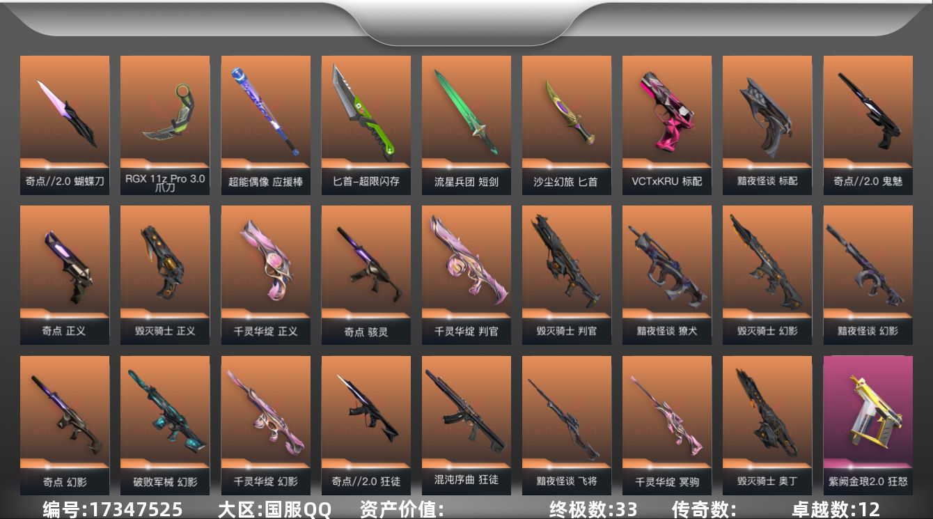 [17347525]【套装】:千灵华绽套装,奇点//2.0套装,黯夜怪谈套装,毁灭骑士套装,回火礼包:奇点套装,掠影套装 【英雄】:炼狱,维斯,暮蝶,壹决,铁臂,捷风,雷兹,幽影,不死鸟,贤者,猎枭,蝰蛇,零,芮娜,奇乐,尚勃勒,霓虹,斯凯,夜露,星礈,K/O,盖可,黑梦,钢锁 【近战 武器】:近战武器-RGX 11z Pro//3.0 爪刀,近战武器-超能偶像 应援棒,近战武器-超限闪存 匕首,近战武器-毁灭战斧,近战武器-流星兵团 短剑,近战武器-落英飞旋,近战武器-奇点//2.0 蝴蝶刀,近战武器-沙尘幻旅 匕首,近战武器-圣石匕首,近战武器-夜刃诡镰,近战武器-夜之蝴蝶,近战武器-影刃,近战武器-紫金爪刀 【标配】:标配-黯夜怪谈,标配-超能偶像,标配-荒土机兵,标配-浮光跃金,标配-战术熊与伙伴们,标配-最终庇护 【VCT手枪】:标配-VCT x KRÜ 【短炮】:短跑-纤云弄巧 【狂怒】:狂怒-紫阙金琅//2.0,狂怒-聚合之力,狂怒-萌彩剪影,狂怒-逆冲蛮牛,狂怒-战术熊与伙伴们 【鬼魅】:鬼魅-奇点//2.0,鬼魅-灵魂冲击,鬼魅-流星兵团,鬼魅-采蜜小蜂队,鬼魅-光导纤维,鬼魅-胡桃狂想,鬼魅-模拟赫兹 【正义】:正义-毁灭骑士,正义-奇点,正义-千灵华绽,正义-掠影,正义-超限闪存,正义-沙尘幻旅,正义-复古浪潮,正义-纤云弄巧 【蜂刺】:蜂刺-超限闪存,蜂刺-胡桃狂想,蜂刺-聚合之力,蜂刺-纤云弄巧 【骇灵】:骇灵-奇点,骇灵-荒土机兵,骇灵-流星兵团,骇灵-沙尘幻旅,骇灵-浮光跃金 【雄鹿】:雄鹿-模拟赫兹,雄鹿-逆冲蛮牛 【判官】:判官-毁灭骑士,判官-千灵华绽,判官-超能偶像,判官-采蜜小蜂队,判官-萌彩剪影,判官-纳米打击x 【獠犬】:獠犬-黯夜怪谈,獠犬-采蜜小蜂队,獠犬-胡桃狂想,獠犬-模拟赫兹,獠犬-逆冲蛮牛 【戍卫】:戍卫-掠影,戍卫-紫阙金琅,戍卫-超能偶像,戍卫-浮光跃金,戍卫-萌彩剪影,戍卫-逆冲蛮牛,戍卫-战术熊与伙伴们 【幻影】:幻影-黯夜怪谈,幻影-毁灭骑士,幻影-破败军械,幻影-奇点,幻影-千灵华绽,幻影-侦察力量,幻影-超限闪存,幻影-聚合之力 【狂徒】:狂徒-混沌序曲,狂徒-奇点//2.0,狂徒-掠影,狂徒-盖亚的复仇,狂徒-紫阙金琅,狂徒-超能偶像,狂徒-流星兵团,狂徒-沙尘幻旅 【飞将】:飞将-黯夜怪谈,飞将-沙尘幻旅,飞将