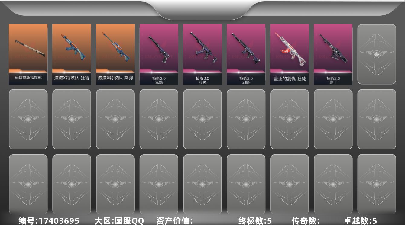 - [16055518]广东四区-65V-0王者-0炫金 【热门武器】:QBZ03-金色蔷薇,修罗-古蛇迷踪,M200-竞技荣光,白虎-电玩蓝兔,M4A1-黑骑士,RPK-盘龙,加特林-炼狱,沙鹰-修罗*3,炽芒蝶刃,炽芒蝶刃-破浪逐光 皮肤 【音效卡】:烈火-动感闪耀 音效卡,M4A1-黑骑士音效卡 【皮肤】:金色蔷薇-纸灯龙皮肤,金色蔷薇-破浪逐光 皮肤,裁决-羽掣 皮肤,雷神-源计划2.0专属 皮肤,火麒麟-心动糖果,毁灭-战神张飞,毁灭-黑大圣皮肤,黑骑士-暗月,无影-能量核心*2,死神-秘银,战神-紫绶金章皮肤,战神-流金岁月皮肤,AK47-B-常胜将军-刘备,天龙-秘银,修罗-能量核心,天神-暗月,屠龙-破浪逐光 皮肤,炽芒蝶刃-破浪逐光 皮肤 【角色】:电竞教官-云悠悠,蛇隐宗,奇洋探员,乔伊教练,修道士,云海玲珑,暗夜-X,初恋灵狐,电竞少女,芳心审判者,飞虎队-X,风暴女,虎妞,嘉年华灵狐,娟娟,灵狐者-X,龙儿-小淘气,麻雀,曼陀罗-礼服,玫瑰花神,潘多拉-X,潘多拉-甜心教官,潜龙队-X,青霞仙子,蛇姬,斯沃特-X,铁骑荣耀,兔囡囡,新娜塔莎,雪莉杨,樱-战斗天使,影武者-X,智影 【人偶武器】:天龙-曼陀罗,AWM-灵狐-15周年嘉年华,迷你牛魔王,迷你波特博士,夺魂,迷你牛牛,迷你生化手雷,生化手雷-机甲核心,深渊终结者手雷,迷你艾比,迷你超能女侍,迷你巨石泰坦-魔花研究所 【暴走生化】:超级对讲机 【挑战大师】:激光毁灭者III-白马银枪,神圣爆裂者-末日III 【英雄级武器】:AK47-火麒麟,M4A1-黑龙,M4A1-雷神,M4A1-黑骑士,M4A1-死神,无影-神兵利器,黑武士-锦绣游龙,超新星-热带奇洋,QBZ03-金色蔷薇,烈火-动感闪耀,AK-47-猩红传说*4,AK47-B-战神,黑骑士-海王,白虎-电玩蓝兔,AWM-天龙,Barrett-毁灭,AWM-裁决,M200-竞技荣光,RPK-盘龙,加特林-炼狱,沙鹰-修罗*3,柯尔特-竞技荣光,天神-动感闪耀,修罗-古蛇迷踪,屠龙,龙啸,擎天,麒麟刺*2,擎天-竞技荣光,炽芒蝶刃,屠龙-动感闪耀,龙啸-热带奇洋,高爆手雷-雷霆,高爆手雷-竞技荣光*6,手雷-动感闪耀,手雷-云海游龙,手雷-热带奇洋,高爆手雷-古蛇迷踪,闪光弹-雷霆,闪光弹-竞技荣光*6,烟雾弹-雷霆,烟雾弹-竞技荣光*8,烟雾弹-古蛇