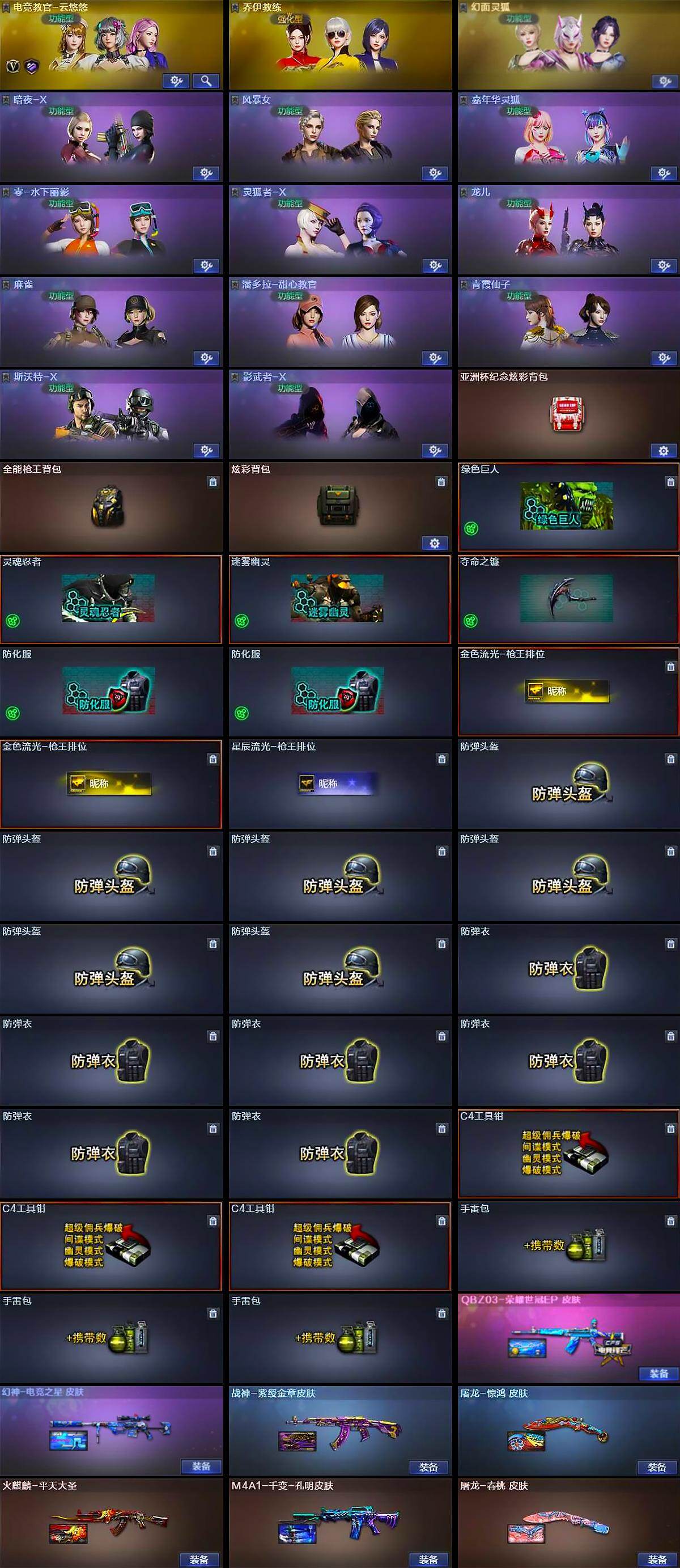 【道具】:亚洲杯纪念炫彩背包,全能枪王背包,炫彩背包,绿色巨人,灵魂忍者,迷雾幽灵,夺命之镰,防化服*2,金色流光-枪王排位*2,星辰流光-枪王排位,防弹头盔*6,防弹衣*6,C4工具钳*3,手雷包*3