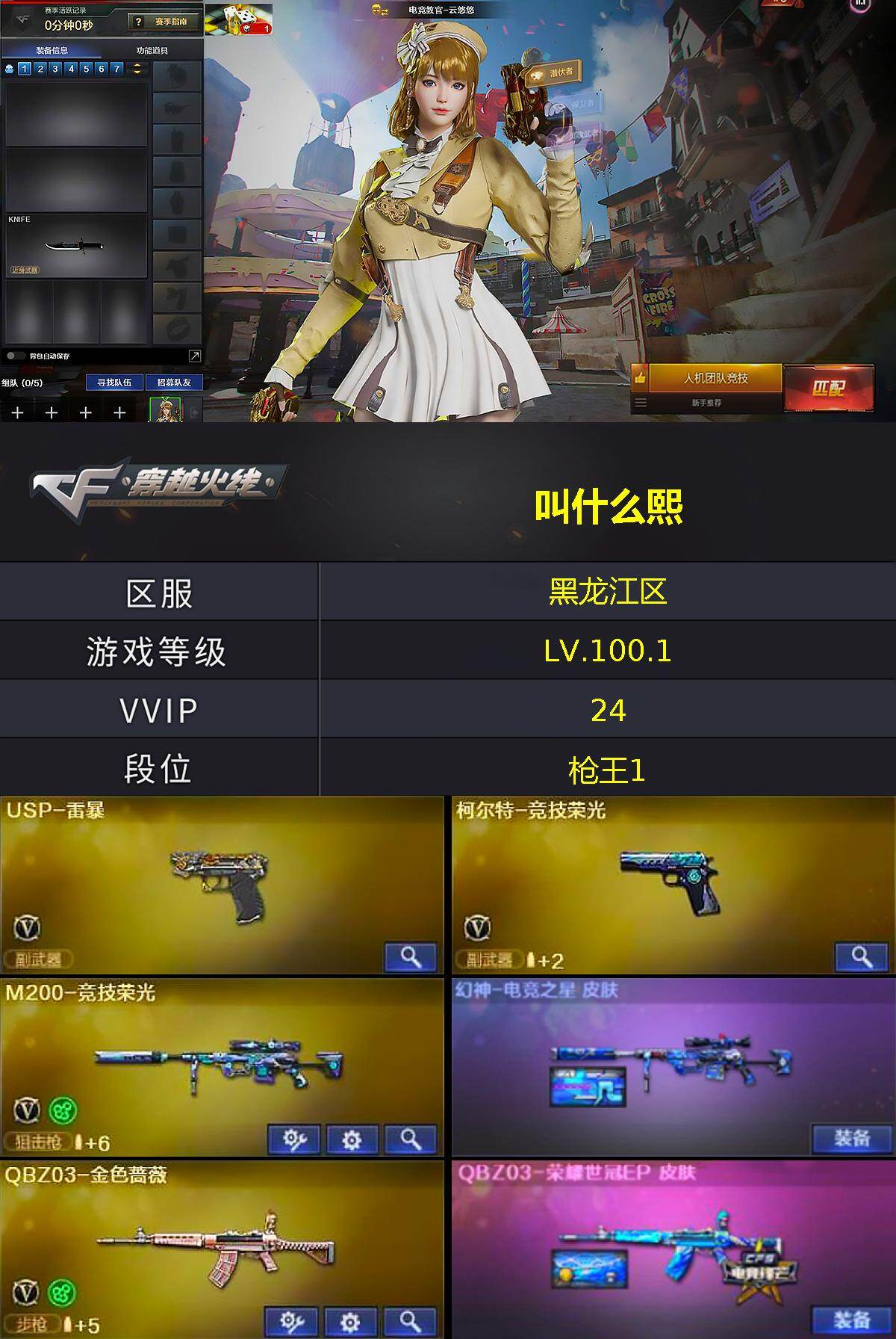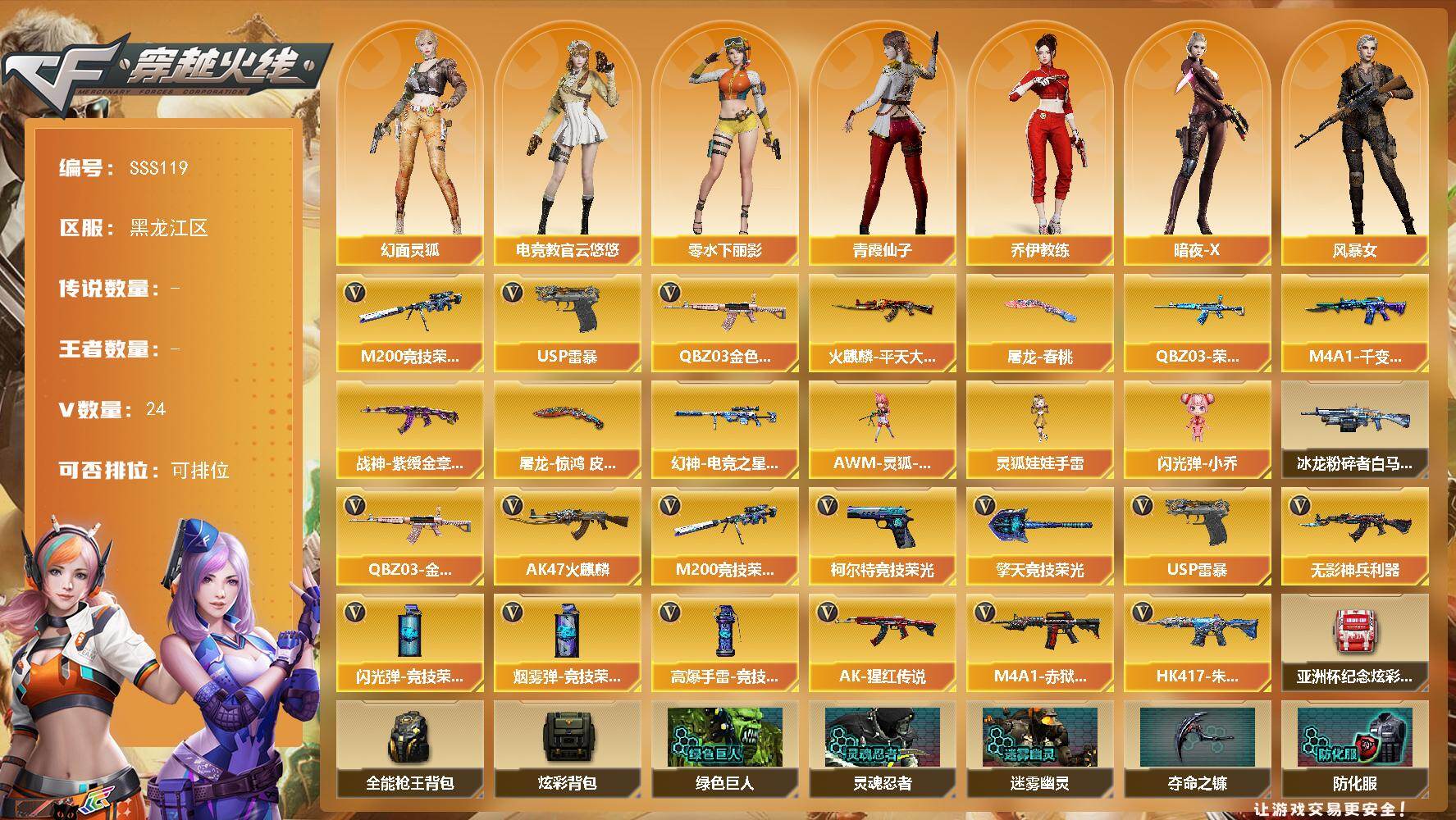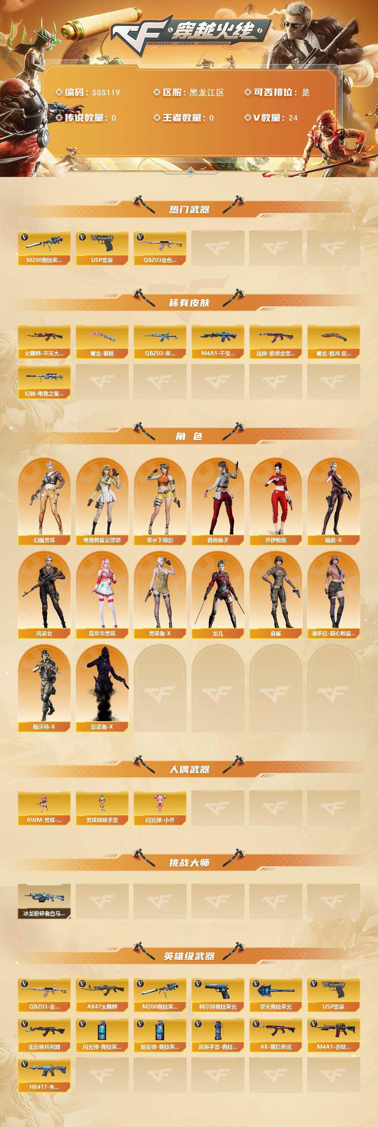 [17424690]黑龙江区-26V-0王者武器数-0炫金武器数 【热门武器】:QBZ03-金色蔷薇,M200-竞技荣光,USP-雷暴 【皮肤】:幻神-电竞之星 皮肤,QBZ03-荣耀世冠EP 皮肤,火麒麟-平天大圣,M4A1-千变-孔明皮肤,战神-紫绶金章皮肤,屠龙-春桃 皮肤,屠龙-惊鸿 皮肤 【角色】:电竞教官-云悠悠,乔伊教练,幻面灵狐,暗夜-X,风暴女,嘉年华灵狐,零-水下丽影,灵狐者-X,龙儿,麻雀,潘多拉-甜心教官,青霞仙子,斯沃特-X,影武者-X 【人偶武器】:AWM-灵狐-15周年嘉年华,闪光弹-小乔,灵狐娃娃手雷 【挑战大师】:冰龙粉碎者-白马银枪 【英雄级武器】:AK47-火麒麟,无影-神兵利器,QBZ03-金色蔷薇,AK-47-猩红传说*2,HK417-朱雀-电竞之星,机械迷城-穹宇,M200-竞技荣光,USP-雷暴,柯尔特-竞技荣光,擎天-竞技荣光,高爆手雷-竞技荣光*2,闪光弹-竞技荣光*3,烟雾弹-竞技荣光*2,M4A1-赤狱骑士 【道具】:亚洲杯纪念炫彩背包,全能枪王背包,炫彩背包,绿色巨人,灵魂忍者,迷雾幽灵,夺命之镰,防化服*2,金色流光-枪王排位*2,星辰流光-枪王排位,防弹头盔*6,防弹衣*6,C4工具钳*3,手雷包*3 【特殊枪械】: