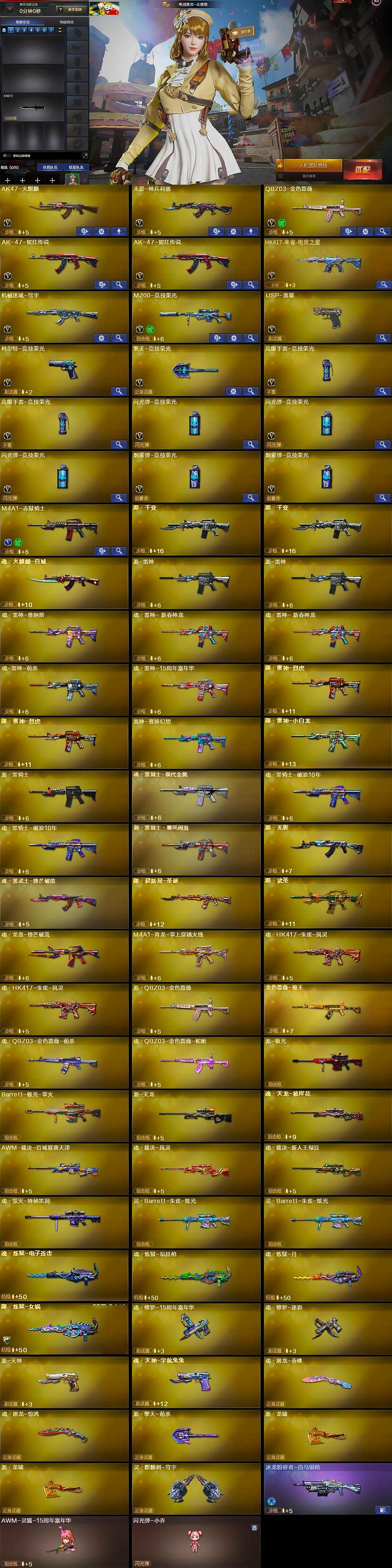 【英雄级武器】:AK47-火麒麟,无影-神兵利器,QBZ03-金色蔷薇,AK-47-猩红传说*2,HK417-朱雀-电竞之星,机械迷城-穹宇,M200-竞技荣光,USP-雷暴,柯尔特-竞技荣光,擎天-竞技荣光,高爆手雷-竞技荣光*2,闪光弹-竞技荣光*3,烟雾弹-竞技荣光*2,M4A1-赤狱骑士