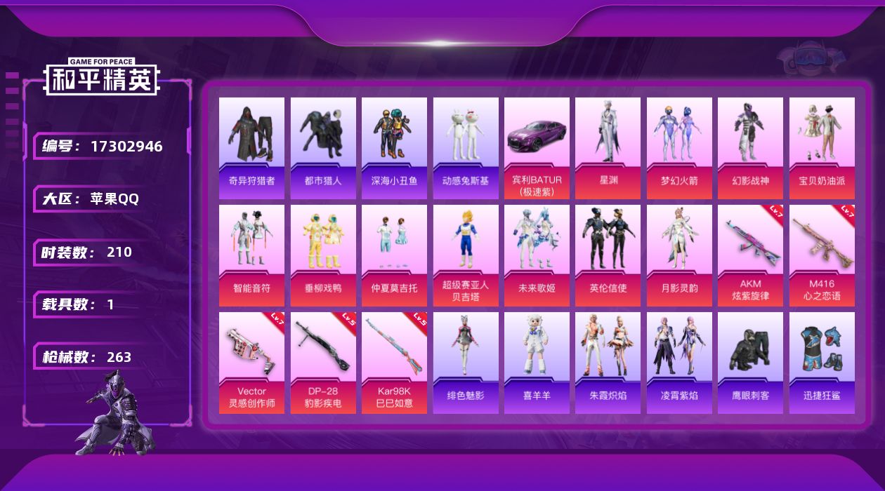 [17302946]苹果 手Q-11粉装-6特效枪-1载具-5粉色飞行器-85641热力值-10王牌印记-210套装-263枪皮 【热门品类】:粉装-梦幻火箭,套装-浪漫天命,套装-都市猎人,套装-深海小丑鱼,套装-小丑鱼,套装-奇异狩猎者,角色-军刀雅典娜,套装-动感兔斯基人偶服,角色-2B战斗服款,套装-龟仙人,套装-暗影哥特 【粉色套装】:粉装-幻影战神,粉装-宝贝奶油派,粉装-梦幻火箭,粉装-智能音符,粉装-垂柳戏鸭,粉装-仲夏莫吉托,超级赛亚人-贝吉塔,粉装-未来歌姬,粉装-英伦信使,角色-月影灵韵,角色-星渊 【粉色枪皮等级】:AKM-炫紫旋律(七级),M416-心之恋语(七级),Vector-灵感创作师(七级),Kar98K-巳巳如意(五级),DP-28-豹影疾电(五级) 【粉色载具】:宾利BATUR(极速紫) 【粉色枪皮】:AKM-炫紫旋律,M416-心之恋语,Vector-灵感创作师,Kar98K-巳巳如意,Mk14-福马献瑞,DP-28-豹影疾电 【粉色飞行器】:炫彩糖果飞行器,梦幻火箭飞行器,太空嘟嘟飞行器,幻海精灵飞行器 【粉色降落伞】:极限特训降落伞,幻影战神降落伞,甜心宝贝降落伞,至尊龙雀降落伞,梦幻火箭降落伞,星之信仰降落伞,童趣迷兔降落伞,环太平洋降落伞,绒雪飘舞降落伞,垂柳戏鸭降落伞,太空嘟嘟降落伞,歌者泠鸢降落伞,暗夜鎏金降落伞,第五大道降落伞,龙珠超降落伞,黄族统领降落伞,超新星降落伞,精灵梦叶罗丽降落伞,鬼刀降落伞,异瞳寒姬降落伞,炫彩糖果降落伞 【稀有套装】:套装-龟仙人,套装-巳巳如意,套装-炫彩糖果,套装-马上有钱,角色-多纳泰罗,套装-火种守卫者,套装-糖糖葫芦,套装-青团波波,套装-朱霞炽焰,套装-凌霄紫焰,玩偶服-喜羊羊,角色-绯色魅影,套装-雨过天青,套装-红釉青花 【稀有枪皮】:AUG-冰晶雪宝,AKM-墨染幽兰,AKM-彩虹符号,AKM-影袭,AKM-星之信仰,AKM-星兔领航员,AKM-灼热熔岩,AKM-环太平洋,AKM-破晓战魂,AKM-缤纷海域,AKM-萌趣颜团子,AKM-虎虎生威,AKM-霓虹街区,AKM-龙的传人,M16A4-夜灯,M16A4-幻世战舞者,M16A4-甜心亚梦,SCAR-L-夜灯,SCAR-L-幽秘魅影,SCAR-L-浪客战士,SCAR-L-玉兔迎春,SCAR-L-甜蜜旋律,SCAR-L-甜蜜誓约,S