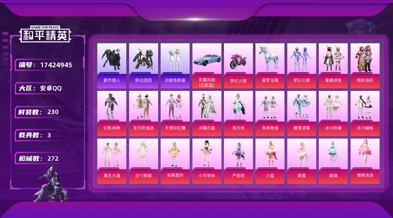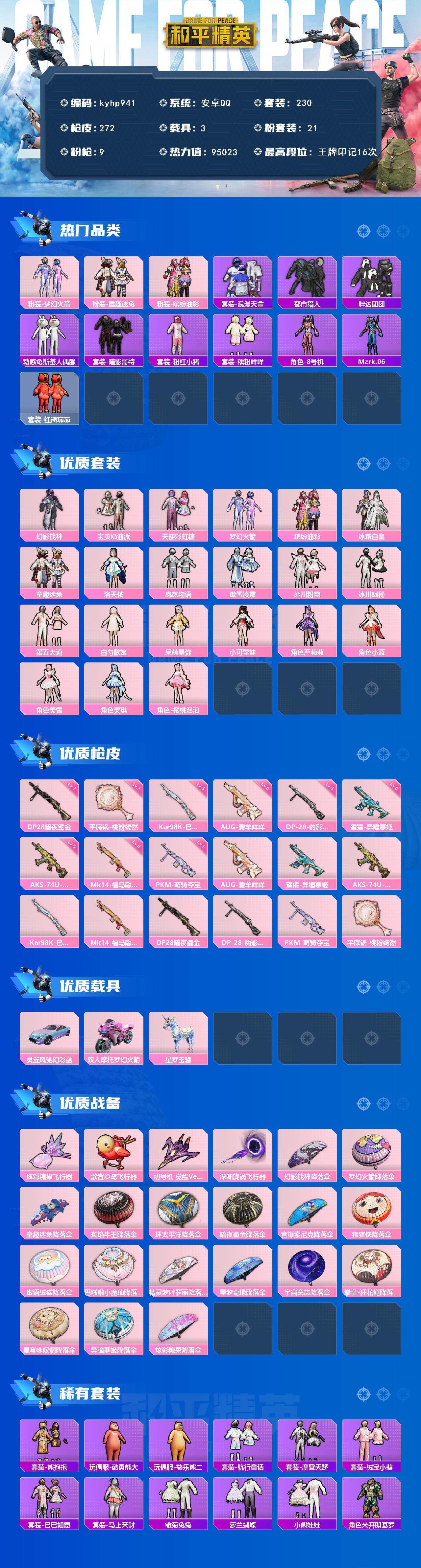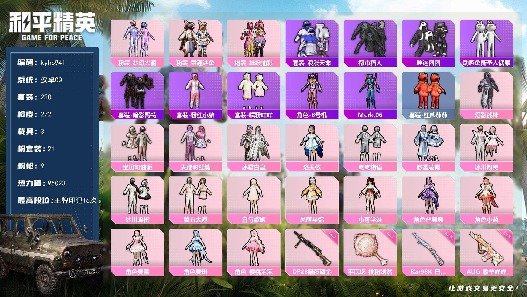 [17424945]安卓 手Q-21粉装-9特效枪-3载具-4粉色飞行器-95023热力值-16王牌印记-230套装-272枪皮