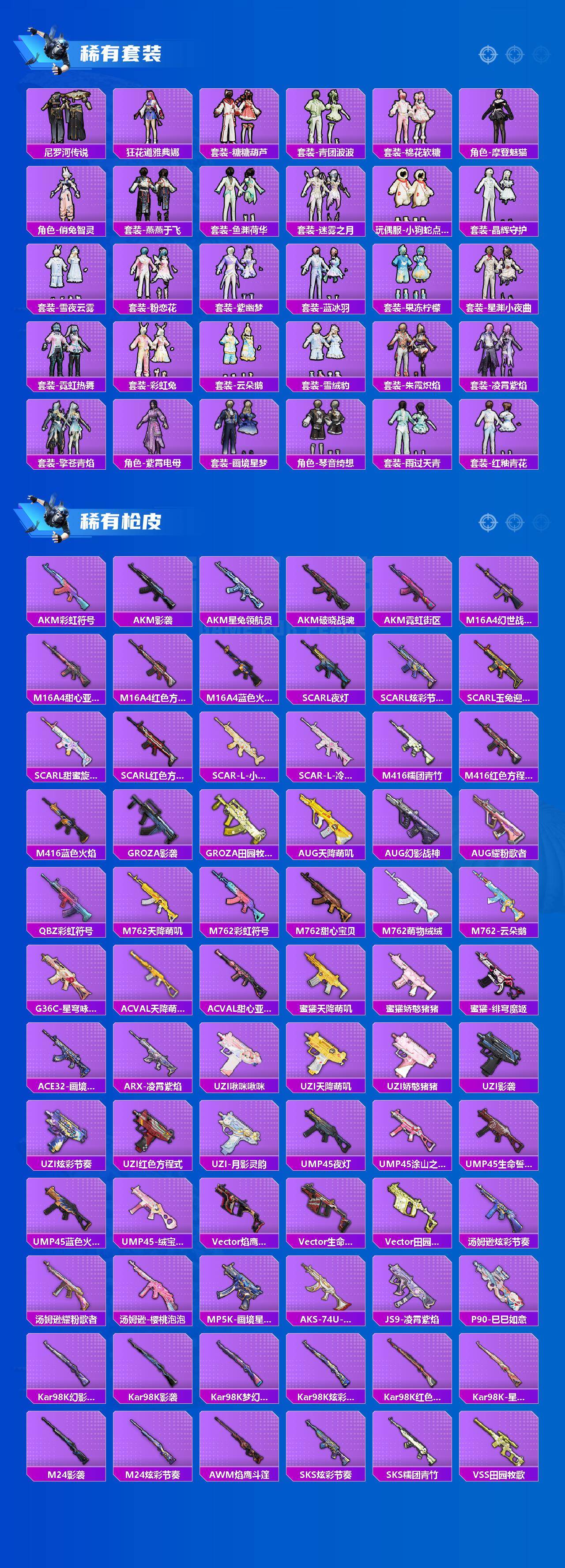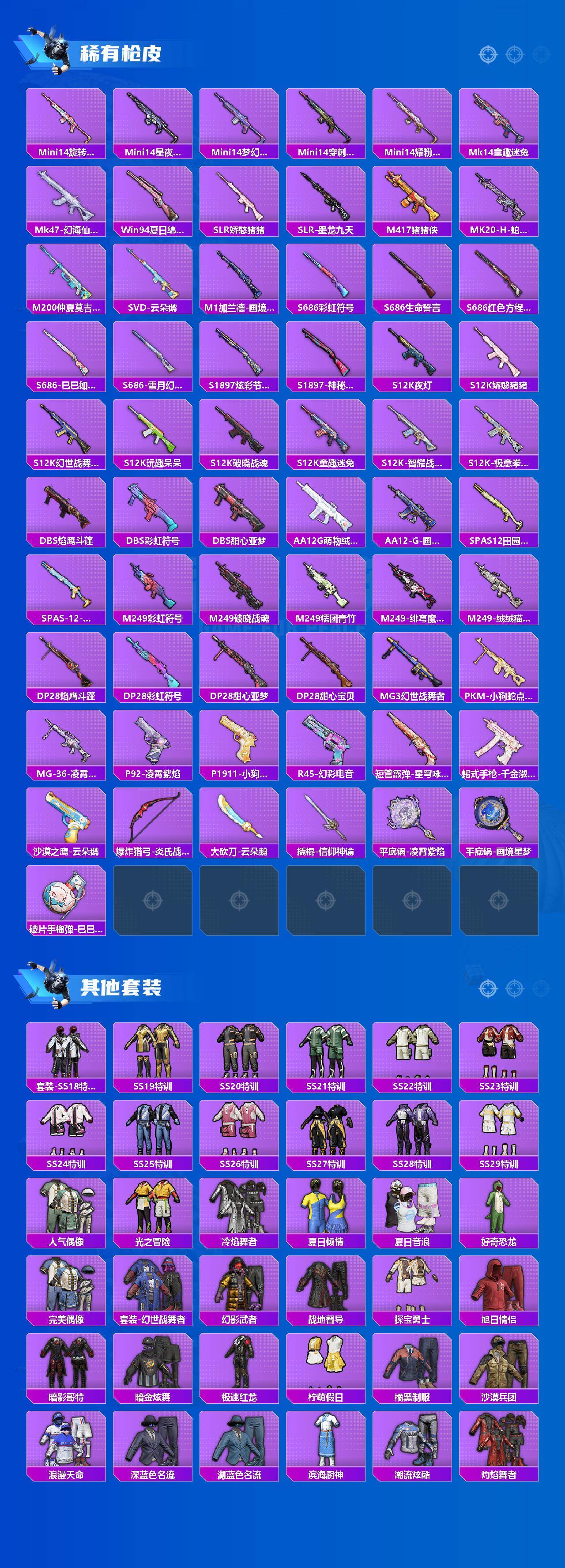 - [17920092]安卓 手Q-3粉装-12特效枪-0载具-1粉色飞行器-59913热力值-5王牌印记-118套装-215枪皮 【热门品类】:套装-龟仙人,角色-Mark.06 【粉色套装】:角色-月影灵韵,粉装-幻彩电音,角色-异瞳寒姬 【粉色枪皮等级】:M416-电玩时刻(五级),GROZA-镜光银凌(五级),AUG-暖羊咩咩(五级),M762-青锋波束(五级),ACE32-萌骑漫游(五级),UMP45-量子极限(五级),AKS-74U-森灵之息(五级),Kar98K-巳巳如意(五级),Mk14-甜梦熊击(五级),莫辛纳甘-未来领航者(三级),MK12-雪月幻音(三级),DP-28-豹影疾电(五级) 【粉色枪皮】:M416-电玩时刻,GROZA-镜光银凌,AUG-暖羊咩咩,M762-青锋波束,ACE32-萌骑漫游,UMP45-量子极限,AKS-74U-森灵之息,Kar98K-巳巳如意,Mk14-甜梦熊击,莫辛纳甘-未来领航者,MK12-雪月幻音,DP-28-豹影疾电 【粉色飞行器】:炫彩糖果飞行器 【粉色降落伞】:星之彼岸降落伞,江南烟雨降落伞,精灵梦叶罗丽降落伞,初号机 觉醒Ver.降落伞,英伦信使降落伞,未来领航者降落伞,临安公主降落伞,智耀战神降落伞,幻彩电音降落伞,异瞳寒姬降落伞,炫彩糖果降落伞 【稀有套装】:套装-龟仙人,套装-绒宝小鹅,套装-巳巳如意,套装-雪国风尚,套装-炫彩糖果,套装-雏菊兔兔,套装-萝兰蝴蝶,套装-小熊娃娃,套装-火种守卫者,套装-糖糖葫芦,套装-青团波波,套装-棉花软糖,角色-摩登魅猫,角色-俏兔智灵,套装-燕燕于飞,套装-鱼渊荷华,套装-粉恋花,套装-紫幽梦,套装-蓝冰羽,套装-星渊小夜曲,套装-霓虹热舞,套装-彩虹兔,套装-云朵鹅,套装-雪绒豹,套装-朱霞炽焰,套装-凌霄紫焰,套装-擎苍青焰,角色-绯色魅影,角色-紫俏灵猫,套装-书海巡游,套装-画境星梦,套装-琴音绮想,套装-雨过天青,套装-红釉青花 【稀有枪皮】:AKM-彩虹符号,AKM-星之彼岸,AKM-破晓战魂,AKM-霓虹街区,M16A4-千金淑猫,SCAR-L-夜灯,SCAR-L-玉兔迎春,SCAR-L-红色方程式,SCAR-L-冷漠罗丽,M416-糯团青竹,AUG-天降萌叽,AUG-耀粉歌者,QBZ-彩虹符号,M762-云朵鹅,G36C-星穹咏叹调,蜜獾-天降萌叽,蜜獾-青瓷战
