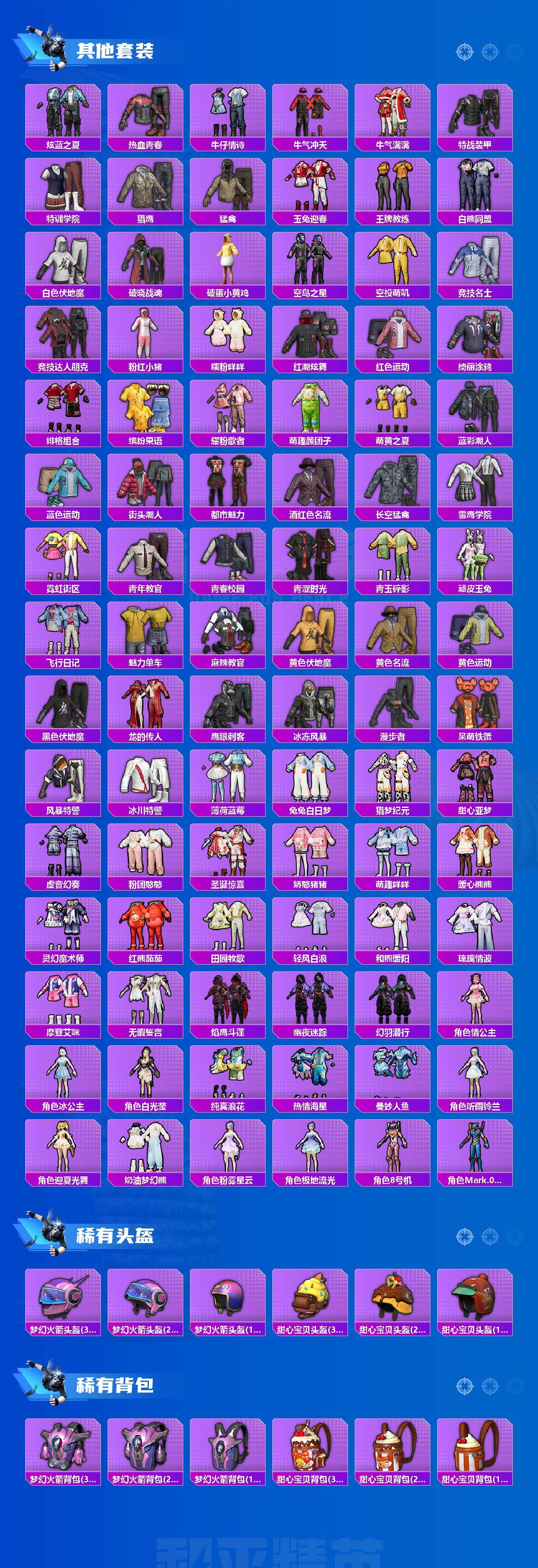 【稀有套装】:套装-熊抱抱,玩偶服-酷勇熊大,玩偶服-憨乐熊二,套装-航行童话,套装-摩登天骄,套装-绒宝小鹅,套装-巳巳如意,套装-炫彩糖果,套装-马上来财,套装-雏菊兔兔,套装-萝兰蝴蝶,套装-小熊娃娃,角色-米开朗基罗,套装-尼罗河传说,角色-狂花道·雅典娜,套装-糖糖葫芦,套装-青团波波,套装-棉花软糖,角色-摩登魅猫,角色-俏兔智灵,套装-燕燕于飞,套装-鱼渊荷华,套装-迷