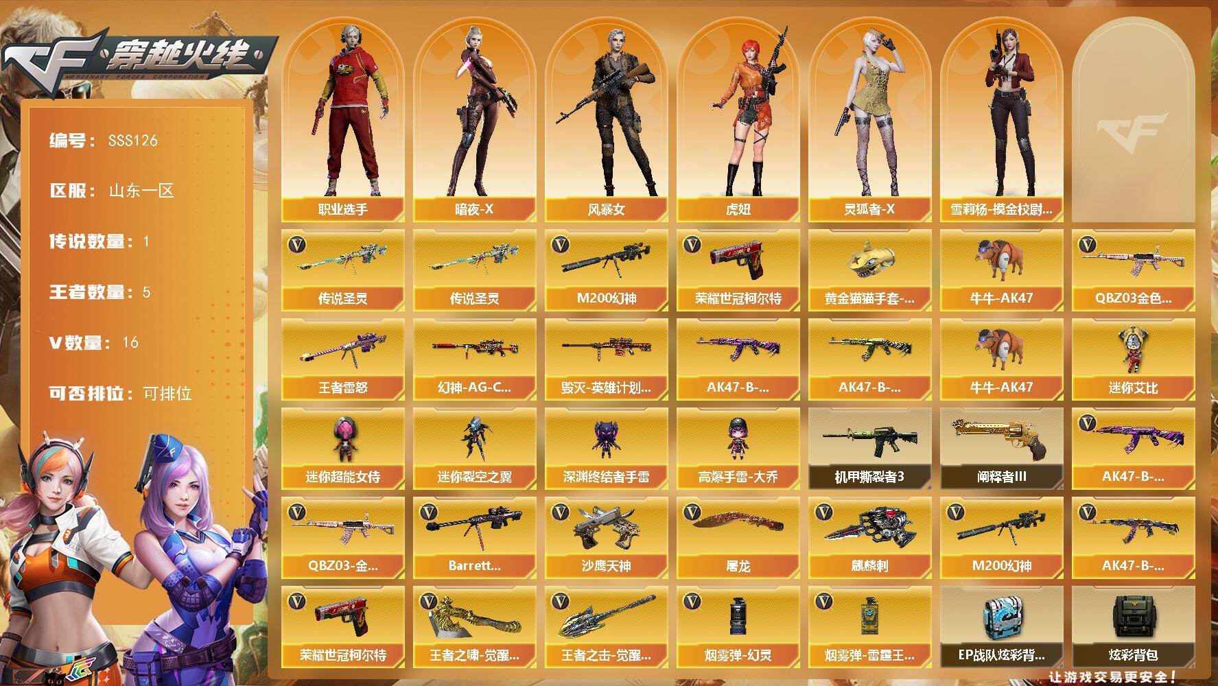【角色】:暗夜-X,风暴女*2,虎妞,灵狐者-X,雪莉杨-摸金校尉,职业选手