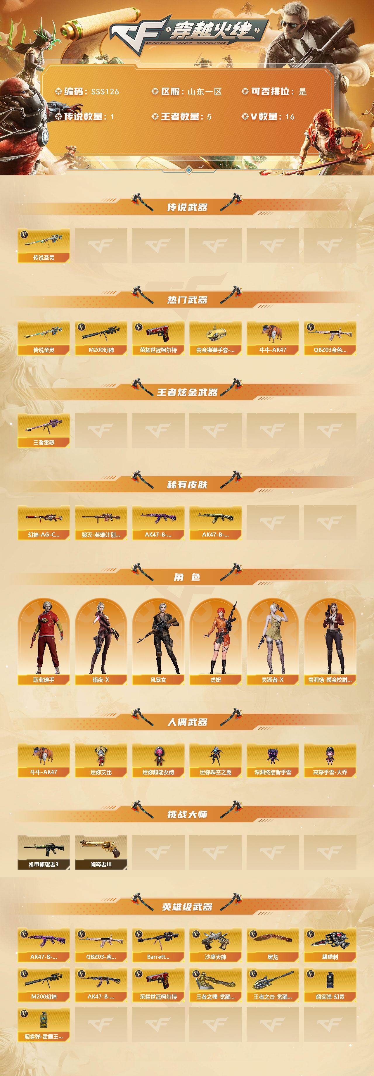 - [16327997]山东一区-20V-0王者-0炫金 【热门武器】:沙鹰-修罗*2 【皮肤】:雷神-机甲刑天皮肤,战神-紫绶金章皮肤,AWM-天龙-传奇70KG,AWM-天龙-传奇白鲨 【角色】:暗夜-X,风暴女,兰-海滩派对,龙儿-小淘气,潘多拉-甜心教官,斯沃特-X,铁骑荣耀,樱-战斗天使 【人偶武器】:迷你裂空之翼,迷你波特博士,生化手雷-机甲核心,迷你艾比 【暴走生化】:超级对讲机 【挑战大师】:神圣爆裂者III,机甲撕裂者III,阐释者III 【英雄级武器】:AK47-火麒麟,M4A1-雷神,AK47-无影,AK-47-猩红传说,AWM-天龙,沙鹰-修罗*2,柯尔特-竞技荣光,屠龙,擎天,擎天-竞技荣光,高爆手雷-竞技荣光,闪光弹-竞技荣光,烟雾弹-幻灵,烟雾弹-竞技荣光 【道具】:战舰背包,超级背包,绿色巨人,灵魂忍者,迷雾幽灵,夺命之镰,防化服*2,枪王排位29赛季金色流光,防弹头盔*5,防弹衣*5,C4工具钳*5,手雷包*5 【特殊枪械】: