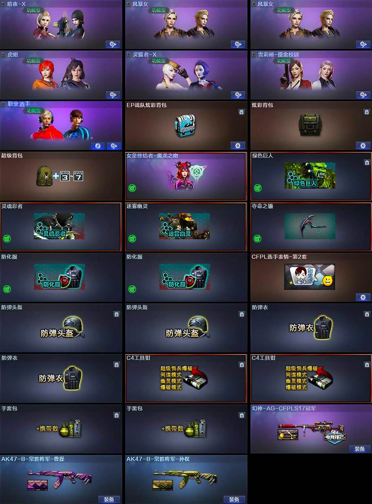 【道具】:EP战队炫彩背包,炫彩背包,超级背包,女皇终结者-魔龙之吻,绿色巨人,灵魂忍者,迷雾幽灵,夺命之镰,防化服*2,CFPL选手表情-第2套,防弹头盔*2,防弹衣*2,C4工具钳*2,手雷包*2