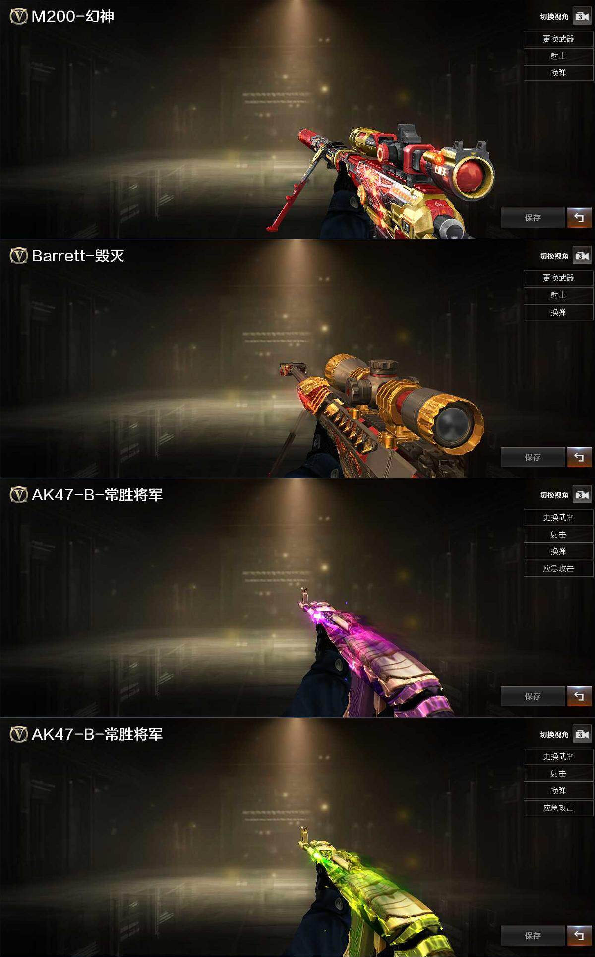 【英雄级武器】:QBZ03-金色蔷薇,AK47-B-战神,AK47-B-常胜将军,Barrett-毁灭,M200-幻神,沙鹰-天神,荣耀世冠-柯尔特,屠龙,麒麟刺,王者之啸-觉醒版,王者之击-觉醒版*2,烟雾弹-幻灵,烟雾弹-雷霆王者-觉醒版