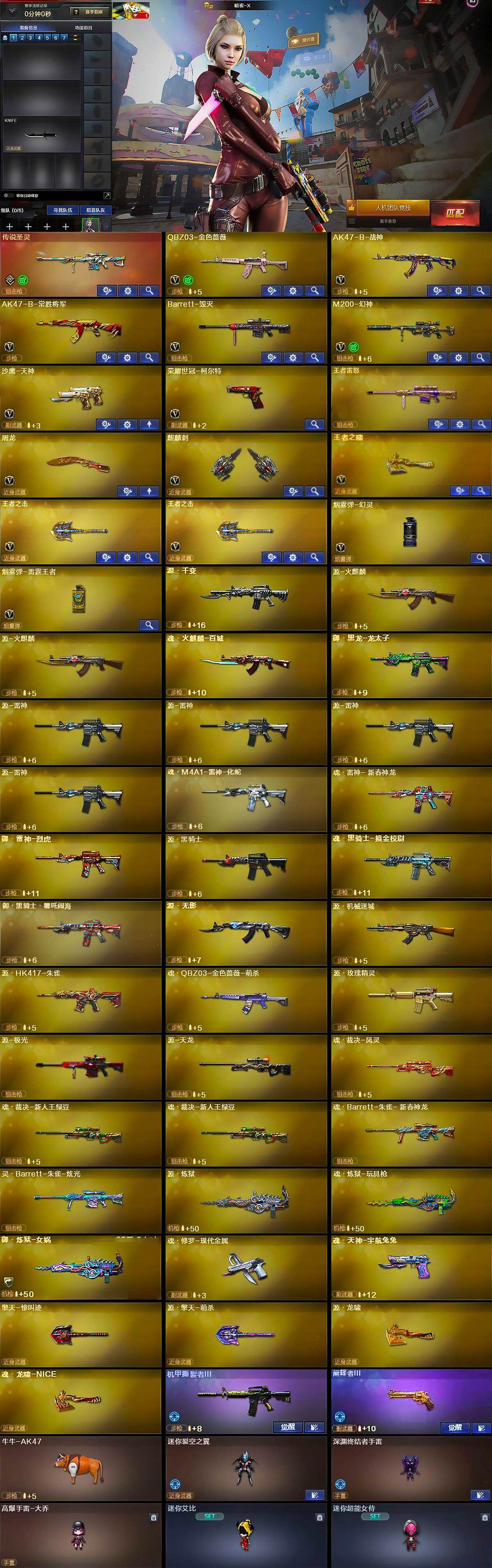 - [12658919]河南一区-88V-14王者-4炫金 【热门武器】:Scar Light-白虎,M200-竞技荣光*2,死亡之眼,荣耀世冠-雷神,M4A1-黑骑士,加特林-炼狱,MK5-炽火炎龙,USP-雷暴,金刚伞 【王者炫金武器】:炫金天龙,炫金千变,炫金毁灭,炫金雷神 【音效卡】:AK47-火麒麟音效卡,M4A1-黑龙音效卡,M4A1-黑骑士音效卡,Barrett-毁灭音效卡,N9语音包 【稀有皮肤】:雷神-虎将,火麒麟-冠军之心,火麒麟-盘古,火麒麟-荣耀世冠AG,火麒麟-心动糖果,毁灭耀金皮肤,毁灭-星空,毁灭-黑大圣皮肤,AWM-天龙-传奇70KG,AWM-天龙-传奇白鲨*2,屠龙-荣耀世冠AG 【角色】:王者葵-惊若翩鸿,王者凌霄,凌霄,电竞教官-云悠悠,蜀雪,职业选手,甜心偶像 【人偶武器】:MK5-炽火炎龙,天龙-曼陀罗,火麒麟-灵狐,巴雷特-零-水下丽影,AWM-灵狐-15周年嘉年华*2,M37-葵,迷你深渊冰龙*2,迷你艾比,迷你巨石泰坦-魔花研究所,迷你牛魔王,迷你波特博士,夺魂,迷你生化手雷,灵狐娃娃手雷,生化手雷-机甲核心,深渊终结者手雷,闪光弹-小乔,闪光弹-貂蝉,高爆手雷-大乔 【暴走生化】:死亡之眼,超级对讲机 【挑战大师】:神圣爆裂者-末日III,VEPR-12-金魔,激光毁灭者III-白马银枪,冰龙粉碎者-白马银枪 【英雄级武器】:QBZ03-云龙,M200-竞技荣光*2,柯尔特-竞技荣光*2,擎天-竞技荣光*3,高爆手雷-竞技荣光*7,烟雾弹-竞技荣光*7,闪光弹-竞技荣光*7,M4A1-夜魔,破空枪刃-夜魔,马来剑-夜魔,USP-雷暴,荣耀世冠-雷神,Scar Light-白虎,无影-神兵利器,M4A1-雷神,M4A1-黑龙,M4A1-黑骑士,M4A1-死神,加特林-炼狱,AK47-无影,AK47-火麒麟*2,AK12-天启,AWM-天龙,Barrett-毁灭,Barrett-极光,M4A1-猎神,麒麟刺,龙啸*2,屠龙*2,擎天-云海游龙 【特殊枪械】:1白虎,1黑骑士,1炼狱