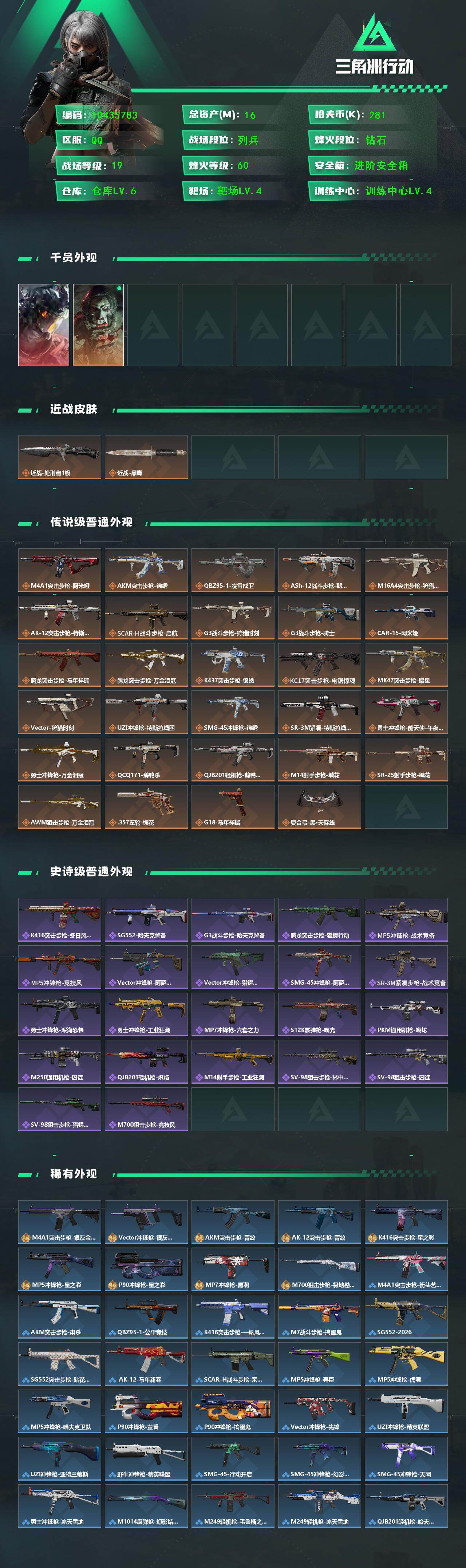 [17425951]【10435783】16m总资产-281k哈伏币-60烽火等级-钻石-19战场等级-列兵 【干员外观】:威龙-凌霄戍卫,红狼-电锯惊魂 【近战皮肤】:近战-处刑者1级,近战-黑鹰 【传说外观】:M4A1突击步枪-阿米娅,AKM突击步枪-锦绣,QBZ95-1突击步枪-凌霄戍卫,ASh-12战斗步枪-鹅鸭杀,M16A4突击步枪-狩猎时刻,AK-12突击步枪-特斯拉线圈,SCAR-H战斗步枪-启航,G3战斗步枪-狩猎时刻,G3战斗步枪-骑士,CAR-15突击步枪-阿米娅,腾龙突击步枪-马年祥瑞,腾龙突击步枪-万金泪冠,K437突击步枪-锦绣,KC17突击步枪-电锯惊魂,MK47突击步枪-暗星,Vector冲锋枪-狩猎时刻,UZI冲锋枪-特斯拉线圈,SMG-45冲锋枪-锦绣,SR-3M紧凑突击步枪-特斯拉线圈,勇士冲锋枪-能天使-午夜邮差,勇士冲锋枪-万金泪冠,QCQ171冲锋枪-鹅鸭杀,QJB201轻机枪-鹅鸭杀,M14射手步枪-缄花,SR-25射手步枪-缄花,AWM狙击步枪-万金泪冠,.357左轮-缄花,G18-马年祥瑞,复合弓-黑·天际线 【史诗外观】:K416突击步枪-冬日风情,SG552突击步枪-哈夫克警备,G3战斗步枪-哈夫克警备,腾龙突击步枪-猎鳄行动,MP5冲锋枪-战术竞备,MP5冲锋枪-竞技风,P90冲锋枪-紧急戒备,Vector冲锋枪-阿萨拉文明,Vector冲锋枪-猎鳄行动,SMG-45冲锋枪-阿萨拉特攻,SR-3M紧凑突击步枪-战术竞备,勇士冲锋枪-深海恐惧,勇士冲锋枪-工业狂潮,MP7冲锋枪-六套之力,S12K霰弹枪-曙光,PKM通用机枪-蝮蛇,M250通用机枪-囚徒,QJB201轻机枪-炽焰,QJB201轻机枪-Old Habits,M14射手步枪-工业狂潮,SV-98狙击步枪-林中猎手,SV-98狙击步枪-囚徒,SV-98狙击步枪-猎鳄行动,M700狙击步枪-竞技风 【稀有外观】:M4A1突击步枪-银灰金属,Vector冲锋枪-银灰金属,AKM突击步枪-青纹,AK-12突击步枪-青纹,K416突击步枪-星之彩,MP5冲锋枪-星之彩,P90冲锋枪-星之彩,MP7冲锋枪-黑潮,M700狙击步枪-极地勘察队,M4A1突击步枪-街头艺术,AKM突击步枪-肃杀,QBZ95-1突击步枪-公平竞技,K416突击步枪-一帆风顺,M7战斗步枪-捣蛋鬼,SG55