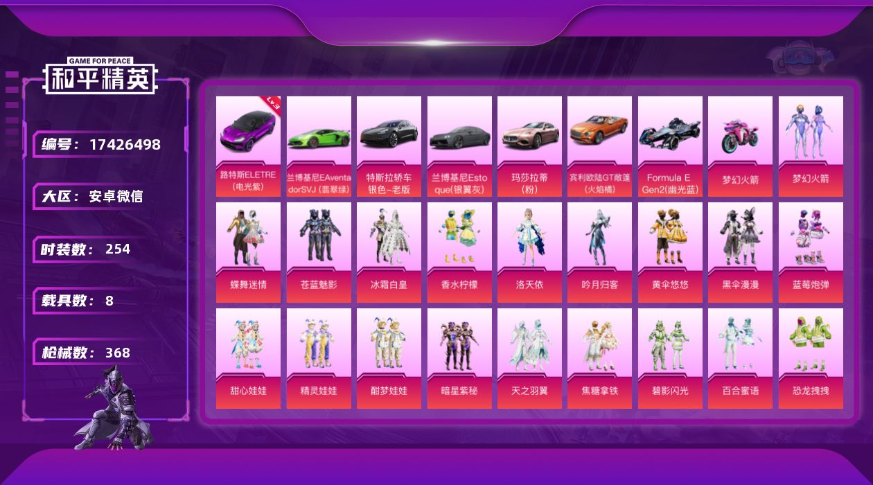 [17426498]【1768】安卓 微信-33粉装-28特效枪-8载具-10粉色飞行器-154330热力值-18王牌印记-254套装-368枪皮 【红色载具】:路特斯ELETRE(电光紫)(三级) 【热门品类】:粉装-梦幻火箭,角色-军刀雅典娜,套装-龟仙人,套装-浪漫波比,套装-粉红小猪 【粉色套装】:粉装-蝶舞迷情,粉装-梦幻火箭,粉装-苍蓝魅影,粉装-冰霜白皇,粉装-香水柠檬,角色-洛天依,粉装-吟月归客,粉装-黄伞悠悠,粉装-黑伞漫漫,粉装-蓝莓炮弹,粉装-甜心娃娃,粉装-精灵娃娃,粉装-酣梦娃娃,粉装-暗星紫秘,粉装-天之羽翼,粉装-焦糖拿铁,粉装-碧影闪光,粉装-百合蜜语,粉装-恐龙拽拽,粉装-闪耀律动,粉装-橘柚倾心,粉装-冷魅冰骑,粉装-赤焰黑爵,粉装-紫电风暴,粉装-筑梦精灵,粉装-甜梦小狐,粉装-妙趣可丽,女娲后裔-赵灵儿,粉装-冰川红玫,粉装-海螺星光,粉装-未来歌姬,角色-脉冲星,角色-绯穹魔姬 【粉色枪皮等级】:AKM-梦之光华(一级),AKM-百合蜜语(七级),SCAR-L-青春物语(一级),SCAR-L-甜梦小狐(七级),M416-心之恋语(六级),GROZA-焦糖拿铁(五级),AUG-妙趣可丽(五级),M762-甜心娃娃(四级),M762-冷魅冰骑(一级),ACE32-萌骑漫游(四级),UZI-筑梦精灵(五级),UMP45-恐龙拽拽(六级),Vector-红伞翩翩(五级),Vector-飒粉甜心(一级),AKS-74U-森灵之息(五级),Kar98K-伏魔团(三级),Kar98K-绿意幻情(一级),Kar98K-巳巳如意(一级),M24-暗星紫秘(四级),AWM-橘柚倾心(四级),SKS-碧影闪光(三级),Mk14-福马献瑞(一级),SLR-暗夜玫瑰(一级),MK20-H-海螺星光(四级),M249-蓝莓炮弹(四级),DP-28-幻梦音符(二级),DP-28-千金淑猫(五级),MG3-洛神天依(五级) 【粉色载具】:路特斯ELETRE(电光紫),特斯拉Model 3(冷光银),兰博基尼Aventador SVJ(翡翠绿),兰博基尼Estoque(银翼灰),玛莎拉蒂Ghibli(粉),宾利欧陆GT敞篷(火焰橘),Formula E Gen2(幽光蓝),双人摩托-梦幻火箭,僚机-萌兔起飞 【粉色枪皮】:AKM-梦之光华,AKM-百合蜜语,SCAR-L-青