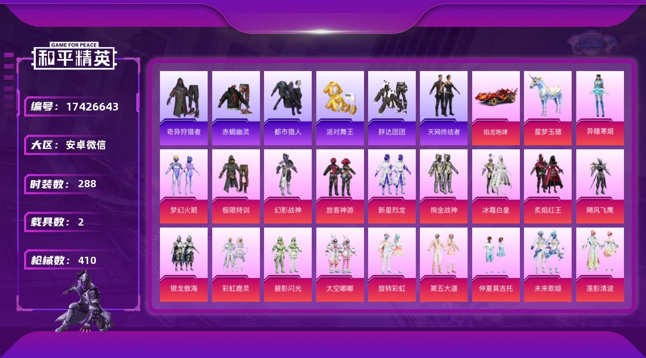 [17426643]【1769】安卓 微信-27粉装-26特效枪-2载具-11粉色飞行器-143285热力值-21王牌印记-288套装-410枪皮