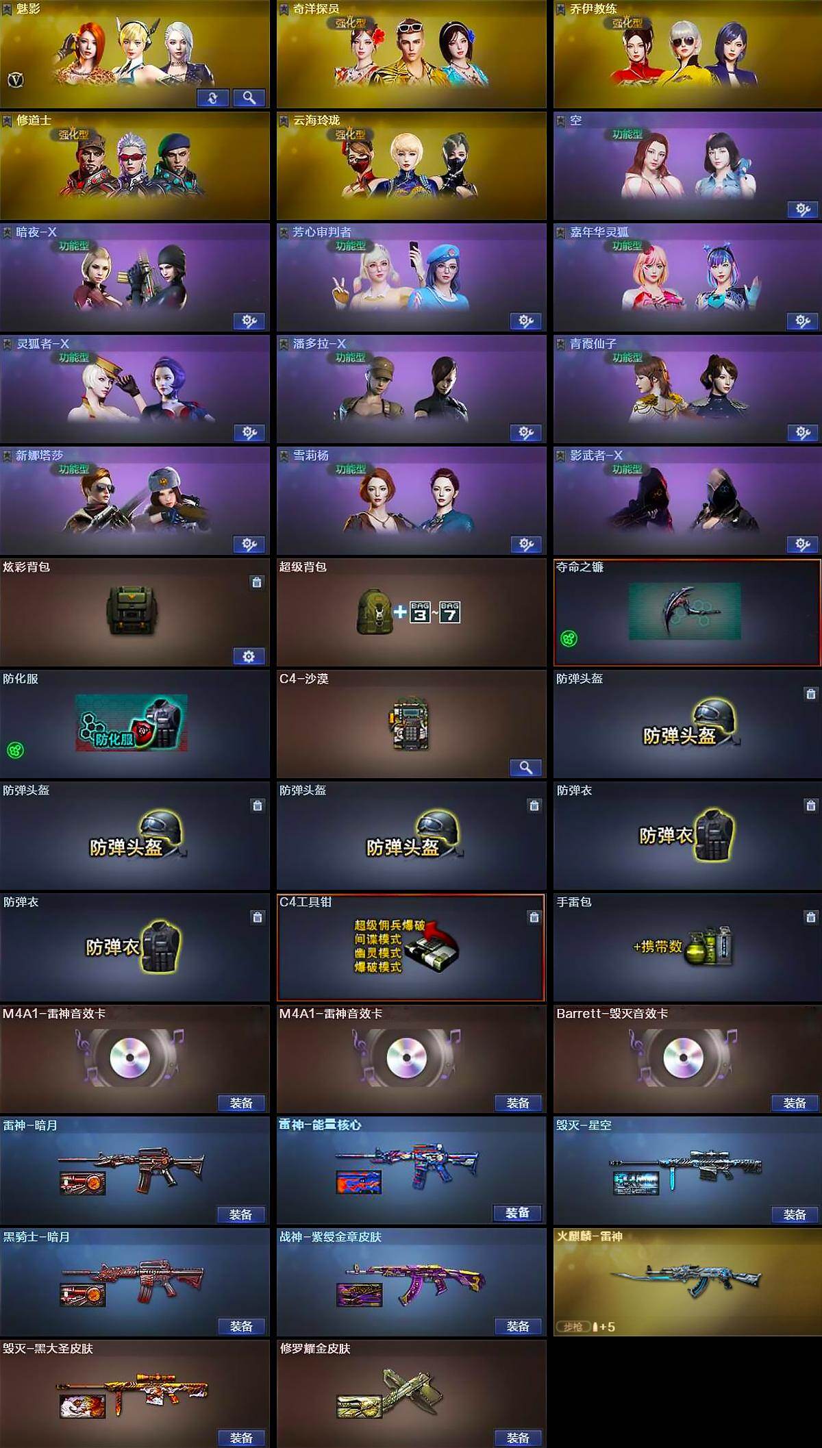 【道具】:炫彩背包,超级背包,夺命之镰,防化服,C4-沙漠,防弹头盔*3,防弹衣*2,C4工具钳,手雷包