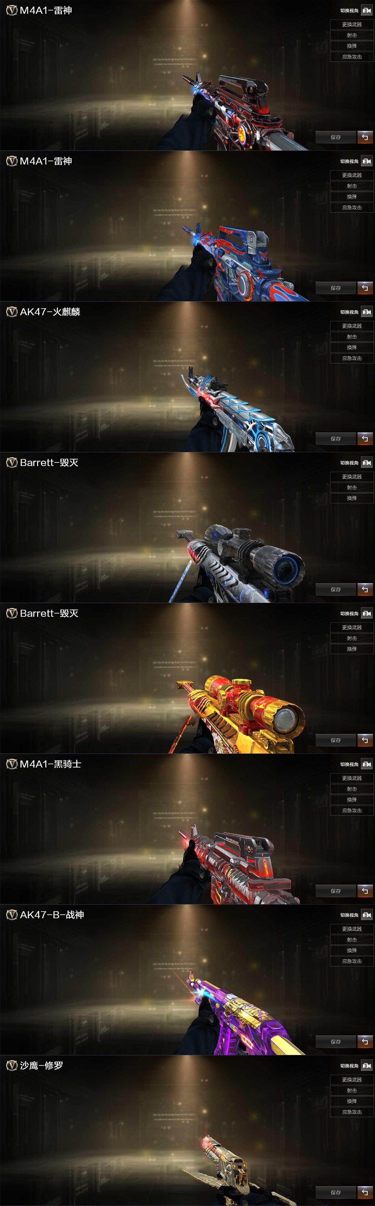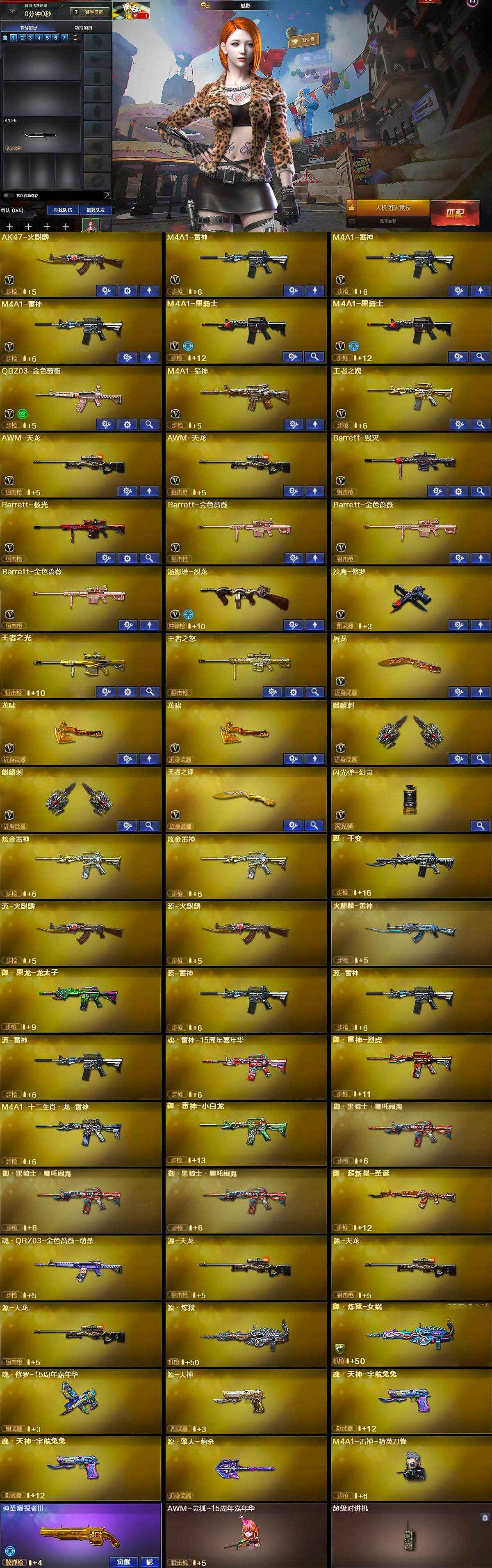【英雄级武器】:AK47-火麒麟,M4A1-雷神*3,M4A1-黑骑士*2,QBZ03-金色蔷薇,M4A1-猎神,王者之魄-觉醒版,AWM-天龙*2,Barrett-毁灭,Barrett-极光,Barrett-金色蔷薇*3,汤姆逊-烈龙,沙鹰-修罗,屠龙,龙啸*2,麒麟刺*2,王者之锋-觉醒版,闪光弹-幻灵