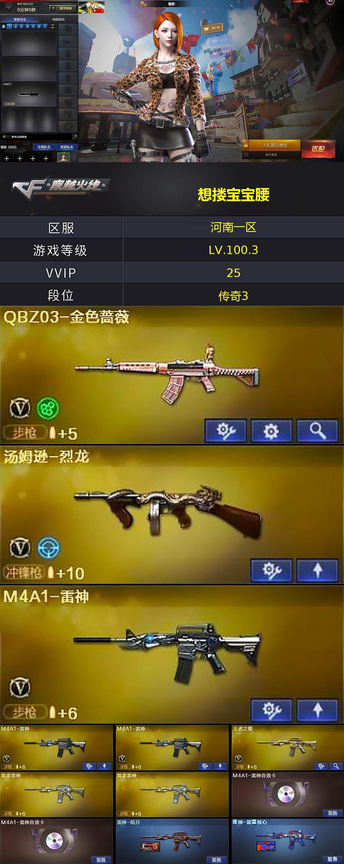 [17426729]【ky6251】河南一区-27V-4王者武器数-2炫金武器数 【热门武器】:QBZ03-金色蔷薇,M4A1-黑骑士*2,汤姆逊-烈龙,沙鹰-修罗 【王者炫金武器】:王者之光,王者之怒,炫金雷神*2 【音效卡】:M4A1-雷神音效卡*2,Barrett-毁灭音效卡 【皮肤】:雷神-暗月,雷神-能量核心,火麒麟-雷神,毁灭-星空,毁灭-黑大圣皮肤,黑骑士-暗月,战神-紫绶金章皮肤,修罗耀金皮肤 【角色】:魅影,奇洋探员,乔伊教练,修道士,云海玲珑,空,暗夜-X,芳心审判者,嘉年华灵狐,灵狐者-X,潘多拉-X,邱刚敖,青霞仙子,新娜塔莎,雪莉杨,影武者-X 【人偶武器】:M4A1-雷神-精英刀锋,AWM-灵狐-15周年嘉年华 【暴走生化】:超级对讲机 【挑战大师】:神圣爆裂者III 【英雄级武器】:AK47-火麒麟,M4A1-雷神*3,M4A1-黑骑士*2,QBZ03-金色蔷薇,M4A1-猎神,王者之魄-觉醒版,AWM-天龙*2,Barrett-毁灭,Barrett-极光,Barrett-金色蔷薇*3,汤姆逊-烈龙,沙鹰-修罗,屠龙,龙啸*2,麒麟刺*2,王者之锋-觉醒版,闪光弹-幻灵 【道具】:炫彩背包,超级背包,夺命之镰,防化服,C4-沙漠,防弹头盔*3,防弹衣*2,C4工具钳,手雷包 【特殊枪械】:2黑骑士,1烈龙