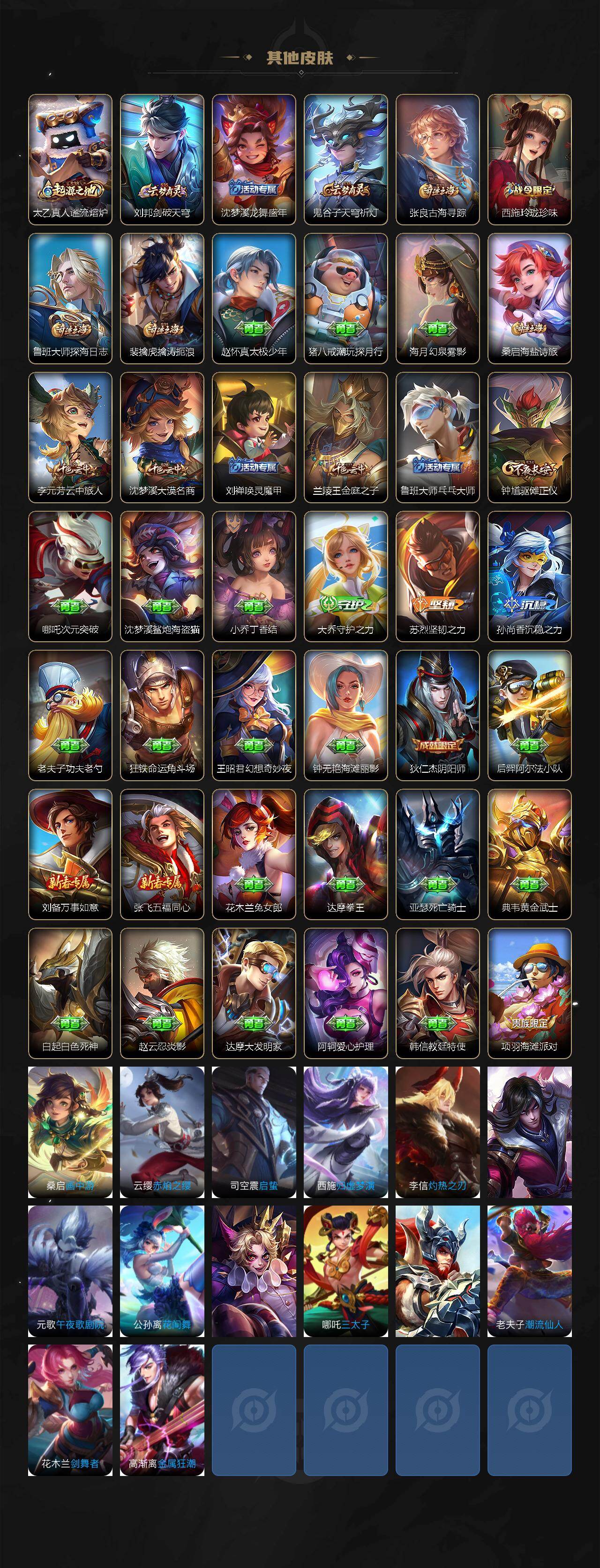 【其他皮肤】:蚩奼极光幻客,艾琳鹤鸣心笺,亚瑟荣光之誓,鬼谷子克喵,莱西奥踏浪烽翎,空空儿戏梦巡演,庄周锦麟游梦,孙策百相守梦,甄姬逆浪荇歌,白起死霸装,钟馗虚灵犬护,西施雪境奇遇,太乙真人谧流熔炉,刘邦剑破天穹,沈梦溪龙舞盛年,鬼谷子天穹祈灯,张良古海寻踪,西施玲珑珍味,鲁班大师探海日志,裴擒虎擒涛扼浪,赵怀真太极少年,猪八戒潮玩探月行,海月幻泉雾影,桑启海盐诗旅,李元芳云中旅人,沈梦溪大漠名商,刘禅唤灵魔甲,兰陵王金庭之子,鲁班大师乓乓大师,钟馗驱傩正仪,哪吒次元突破,沈梦溪鲨炮海盗猫,小乔丁香结,大乔守护之力,苏烈坚韧之力,孙尚香沉稳之力,老夫子功夫老勺,狂铁命运角斗场,王昭君幻想奇妙夜,钟无艳海滩丽影,狄仁杰阴阳师,后羿阿尔法小队,刘备万事如意,张飞五福同心,花木兰兔女郎,达摩拳王,亚瑟死亡骑士,典韦黄金武士,白起白
