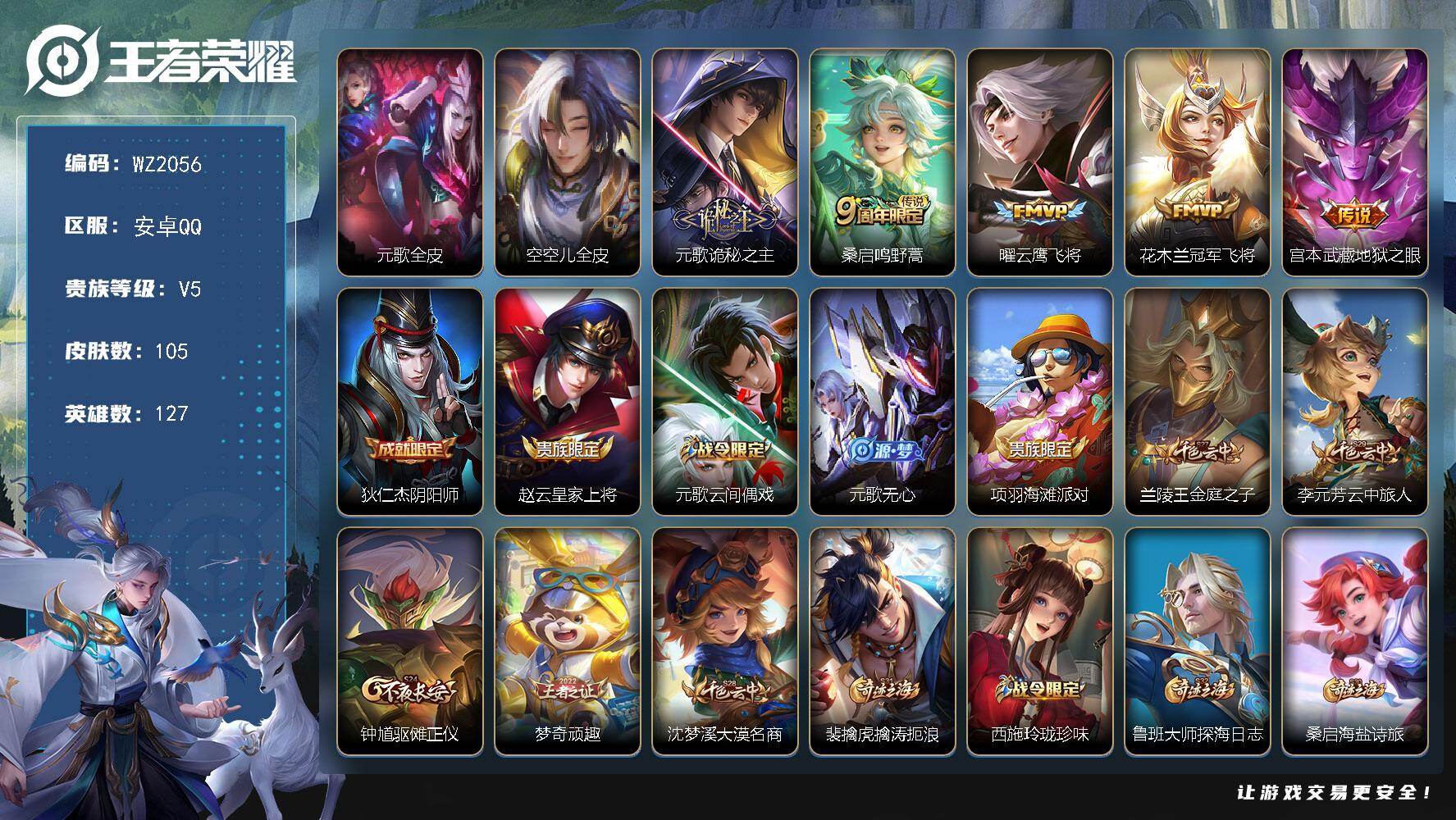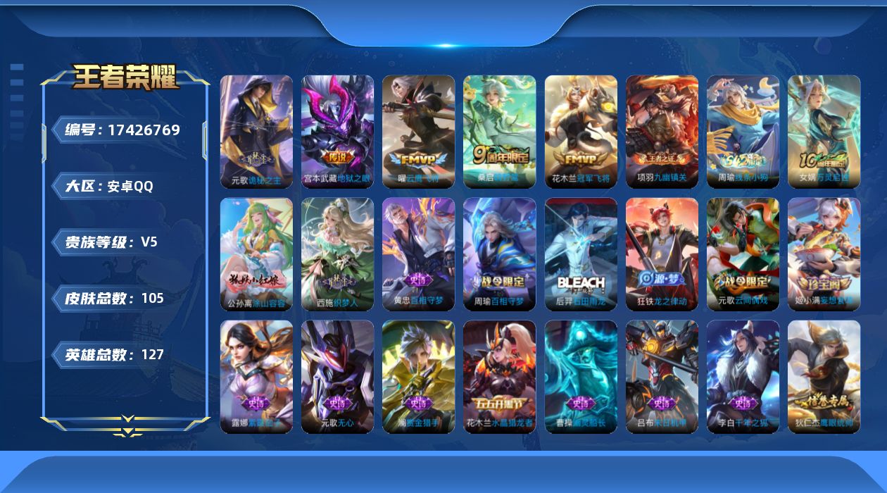 [17426769]安卓Q-105皮肤-5传说-31史诗 【英雄全皮】:元歌全皮,空空儿全皮 【传说皮肤】:元歌诡秘之主,桑启鸣野蒿,曜云鹰飞将,花木兰冠军飞将,宫本武藏地狱之眼 【限定皮肤】:狄仁杰阴阳师,赵云皇家上将,元歌云间偶戏,元歌无心,项羽海滩派对,兰陵王金庭之子,李元芳云中旅人,钟馗驱傩正仪,梦奇顽趣,沈梦溪大漠名商,裴擒虎擒涛扼浪,西施玲珑珍味,鲁班大师探海日志,桑启海盐诗旅,张良古海寻踪,鬼谷子天穹祈灯,姬小满妄想食味,沈梦溪龙舞盛年,刘邦剑破天穹 【赛季限定】:钟馗驱傩正仪,兰陵王金庭之子,沈梦溪大漠名商,李元芳云中旅人,桑启海盐诗旅,裴擒虎擒涛扼浪,鲁班大师探海日志,张良古海寻踪,鬼谷子天穹祈灯,刘邦剑破天穹,太乙真人谧流熔炉,钟馗虚灵犬护,甄姬逆浪荇歌,亚瑟荣光之誓,梦奇顽趣,项羽九幽镇关 【战令限定】:元歌云间偶戏,西施玲珑珍味,周瑜百相守梦,孙策百相守梦,周瑜线条小狗 【史诗皮肤】:周瑜线条小狗,项羽九幽镇关,女娲万灵启世,公孙离涂山容容,西施织梦人,黄忠百相守梦,周瑜百相守梦,后羿石田雨龙,狂铁龙之律动,弈星万物之道,姬小满妄想食味,梦奇顽趣,元歌无心,澜赏金猎手,西施诗语江南,元歌云间偶戏,狄仁杰鹰眼统帅,阿轲节奏热浪,程咬金功夫厨神,百里守约特工魅影,雅典娜冰冠公主,花木兰水晶猎龙者,吕布末日机甲,李白千年之狐,曹操幽灵船长,妲己魅力维加斯,嬴政摇滚巨星,孙尚香水果甜心,宫本武藏鬼剑武藏,王昭君偶像歌手,赵云皇家上将,露娜紫霞仙子 【其他皮肤】:蚩奼极光幻客,艾琳鹤鸣心笺,亚瑟荣光之誓,鬼谷子克喵,莱西奥踏浪烽翎,空空儿戏梦巡演,庄周锦麟游梦,孙策百相守梦,甄姬逆浪荇歌,白起死霸装,钟馗虚灵犬护,西施雪境奇遇,太乙真人谧流熔炉,刘邦剑破天穹,沈梦溪龙舞盛年,鬼谷子天穹祈灯,张良古海寻踪,西施玲珑珍味,鲁班大师探海日志,裴擒虎擒涛扼浪,赵怀真太极少年,猪八戒潮玩探月行,海月幻泉雾影,桑启海盐诗旅,李元芳云中旅人,沈梦溪大漠名商,刘禅唤灵魔甲,兰陵王金庭之子,鲁班大师乓乓大师,钟馗驱傩正仪,哪吒次元突破,沈梦溪鲨炮海盗猫,小乔丁香结,大乔守护之力,苏烈坚韧之力,孙尚香沉稳之力,老夫子功夫老勺,狂铁命运角斗场,王昭君幻想奇妙夜,钟无艳海滩丽影,狄仁杰阴阳师,后羿阿尔法小队,刘备万事如意,张飞五福同心,花木兰兔女郎,达摩拳王,亚瑟死亡骑士,典韦黄金武士,白起白
