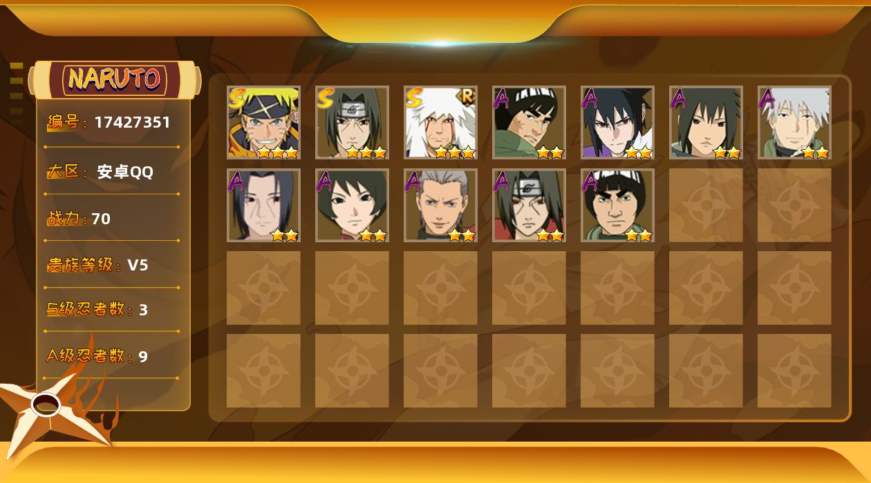 【S级忍者】:宇智波鼬「须佐能乎」(3星),自来也「舞之豪杰」(3星),漩涡鸣人·宇智波佐助(3星)
