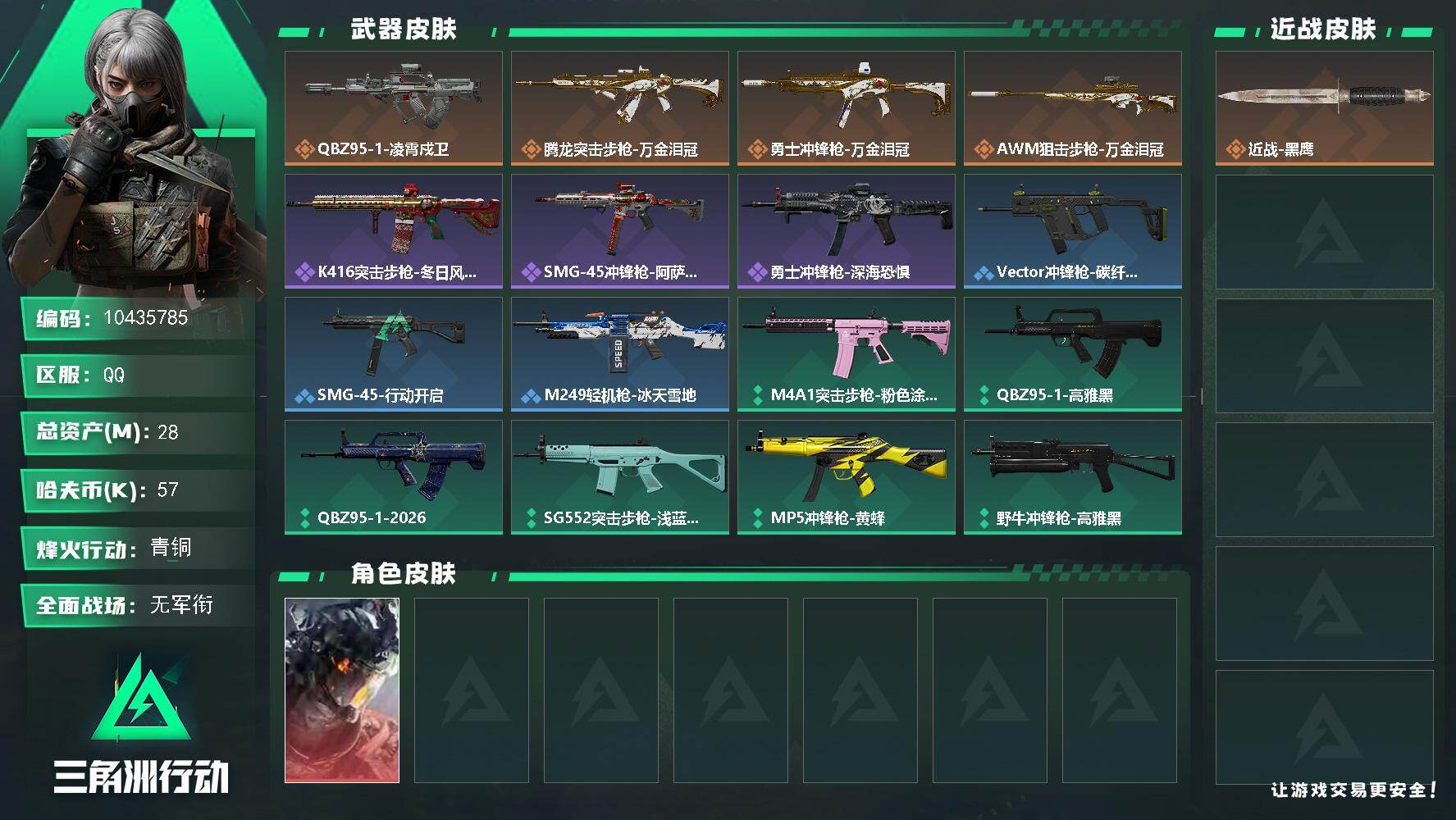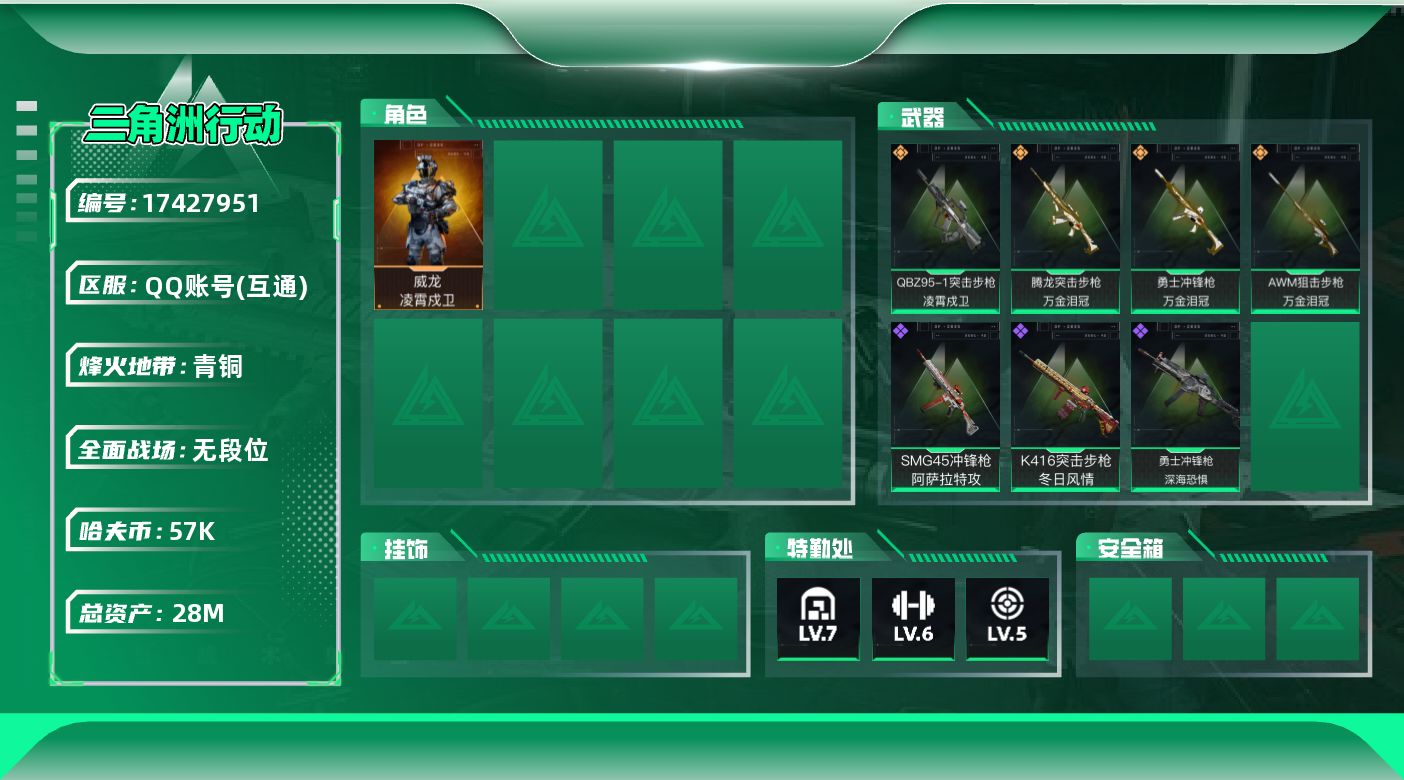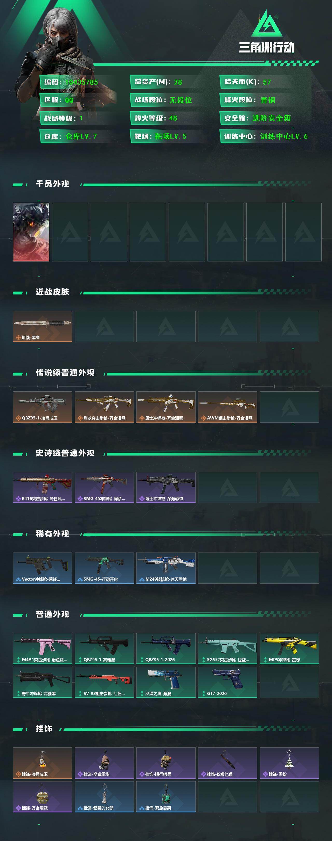 [17427951]【10435785】28m总资产-57k哈伏币-48烽火等级-青铜-1战场等级-无军衔 【干员外观】:威龙-凌霄戍卫 【近战皮肤】:近战-黑鹰 【传说外观】:QBZ95-1突击步枪-凌霄戍卫,腾龙突击步枪-万金泪冠,勇士冲锋枪-万金泪冠,AWM狙击步枪-万金泪冠 【史诗外观】:K416突击步枪-冬日风情,SMG-45冲锋枪-阿萨拉特攻,勇士冲锋枪-深海恐惧 【稀有外观】:Vector冲锋枪-碳纤维,SMG-45冲锋枪-行动开启,M249轻机枪-冰天雪地 【普通外观】:M4A1突击步枪-粉色涂装,QBZ95-1突击步枪-高雅黑,QBZ95-1突击步枪-2026,M7战斗步枪-黑巧甜心,SG552突击步枪-浅蓝涂装,CAR-15突击步枪-狂欢,MP5冲锋枪-黄蜂,野牛冲锋枪-高雅黑,勇士冲锋枪-磐石,PKM通用机枪-变色龙,SV-98狙击步枪-红色涂装,沙漠之鹰-海浪,G17-2026 【挂饰】:挂饰-凌霄戍卫,挂饰-崩岩重炮*5,挂饰-暗行哨兵*7,挂饰-仪典匕首,挂饰-雪松,挂饰-万金泪冠,挂饰-起舞的女郎,挂饰-紧急撤离*28