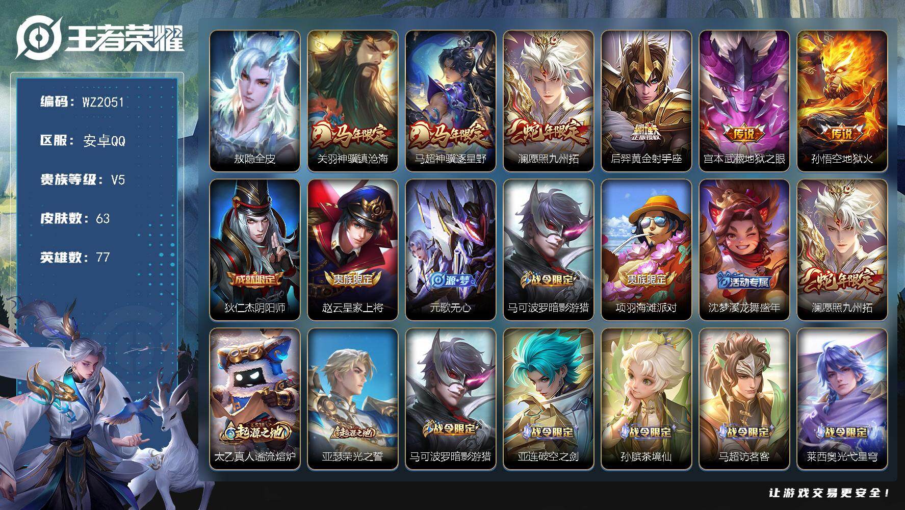 - [17303025]【特价出售/店主推荐,打野19段,2市标】安卓Q-V9-至尊星耀IV段位-128英雄-370皮肤-1星传说-2典藏皮肤-34传说-109史诗 【英雄全皮】:孙权全皮,狂铁全皮,猪八戒全皮,夏洛特全皮,司空震全皮,戈娅全皮 【荣耀典藏】:李白鸣剑曳影,铠银白咏叹调 【传说皮肤】:后羿神树通天,司空震愿照山河定,典韦战鼓燎原,孙策乘龙淬吴钩,赵云乘龙铭钟鼎,云缨鹤归松栖,东皇太一灼幽烈阳,诸葛亮鹤羽星尊,亚瑟追逃游戏,夏洛特浮生妄,项羽无限倾心,李信山海炽霜斩,吕布怒海麟威,李白诗剑行,狄仁杰神器狴犴令,百里守约碎云,马超无双飞将,蔡文姬花朝如约,王昭君乞巧织情,西施游龙清影,周瑜音你心动,小乔音你心动,铠绛天战甲,镜炽阳神光,虞姬启明星使,曜云鹰飞将,刘备时之恋人,貂蝉猫影幻舞,干将莫邪久胜战神,虞姬云霓雀翎,达摩黄金狮子座,后羿黄金射手座,宫本武藏地狱之眼,孙悟空地狱火 【限定皮肤】:狄仁杰阴阳师,赵云皇家上将,赵云引擎之心,嬴政优雅恋人,钟无艳王者之锤,钟无艳超时空战士,扁鹊奇幻香踪,白起夜都怪侠,芈月重明,芈月白晶晶,吕布猎兽之王,吕布御风骁将,元歌云间偶戏,元歌无心,夏侯惇朔风刀,甄姬游园惊梦,甄姬落雪兰心,典韦岱宗,狄仁杰魔术师,狄仁杰神器狴犴令,达摩沙漠行僧,项羽海滩派对,项羽无限倾心,王昭君午后时光,兰陵王金庭之子,亚瑟追逃游戏,孙悟空美猴王,孙悟空至尊宝,孙悟空孙行者,李元芳匿光侦查者,李元芳云中旅人,虞姬启明星使,钟馗驱傩正仪,杨戬潮玩骑兵,蔡文姬繁星吟游,鬼谷子原初探秘者,鬼谷子五谷丰年,诸葛亮鹤羽星尊,黄忠烈魂,铠青龙志,苏烈千军破阵,弈星混沌棋,沈梦溪大漠名商,沈梦溪匿光破解者,明世隐疑决卦,明世隐吟游魔法,裴擒虎天狼狩猎者,裴擒虎李小龙,裴擒虎擒涛扼浪,狂铁御狮,狂铁电玩高手,米莱狄御霄,云中君纤云弄巧,李信山海炽霜斩,盾山御銮,猪八戒西部大镖客,猪八戒猪悟能,嫦娥拒霜思,嫦娥暖冬兔眠,西施玲珑珍味,鲁班大师探海日志,桑启海盐诗旅,夏洛特浮生妄,暃星界游侠,戈娅驭风魔法,艾琳流音漫舞,赵怀真鹤归松栖,云缨鹤归松栖,司空震地狱燃心,阿古朵江河有灵,张良古海寻踪,蒙犽百解令,蒙恬荣光圣徽,高渐离燃音魔法,妲己灵卜魔法,鬼谷子天穹祈灯,伽罗琥珀纪元,孙策乘龙淬吴钩,赵云乘龙铭钟鼎,沈梦溪龙舞盛年,鲁班七号蔬乡物语,李元芳蔬乡物语 【年限皮肤】:孙
