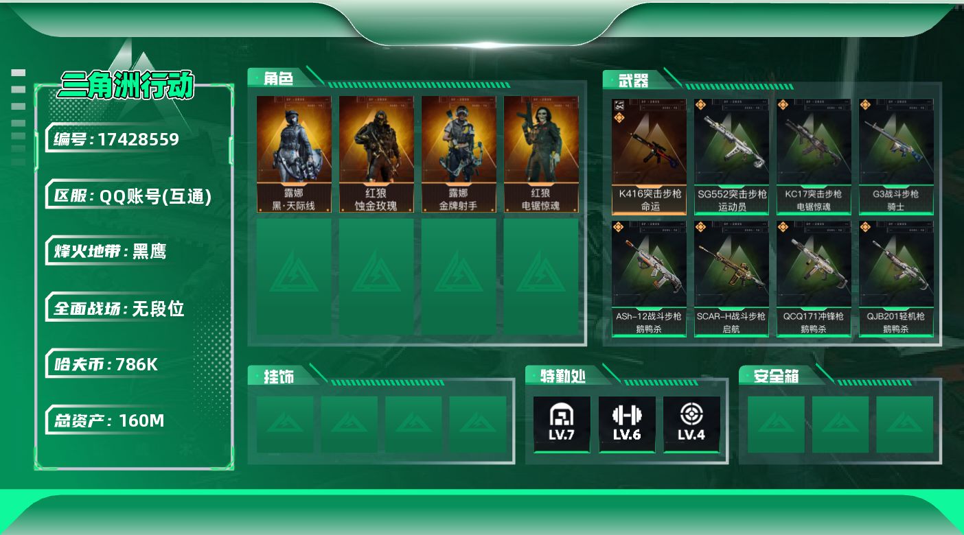 [17428559]【特价出售/店主推荐】160m总资产-786k哈伏币-60烽火等级-黑鹰-2战场等级-无军衔 【干员外观】:红狼-蚀金玫瑰,露娜-黑·天际线,红狼-电锯惊魂,露娜-金牌射手 【近战皮肤】:近战-黑鹰 【典藏外观】:K416突击步枪-命运 【传说外观】:M4A1突击步枪-蚀金玫瑰,M4A1突击步枪-阿米娅,ASh-12战斗步枪-鹅鸭杀,SG552突击步枪-运动员,AK-12突击步枪-特斯拉线圈,SCAR-H战斗步枪-启航,G3战斗步枪-骑士,CAR-15突击步枪-阿米娅,腾龙突击步枪-捞点薯条,KC17突击步枪-电锯惊魂,UZI冲锋枪-特斯拉线圈,SR-3M紧凑突击步枪-特斯拉线圈,勇士冲锋枪-能天使-午夜邮差,QCQ171冲锋枪-鹅鸭杀,M250通用机枪-骑士之心,QJB201轻机枪-鹅鸭杀,AWM狙击步枪-捞点薯条,93R-捞点薯条,复合弓-黑·天际线 【史诗外观】:AWM狙击步枪-私人定制,QBZ95-1突击步枪-曙光,ASh-12战斗步枪-无极限,M16A4突击步枪-竞赛选手,AUG突击步枪-蝮蛇,M7战斗步枪-百步穿杨,SG552突击步枪-深海恐惧,G3战斗步枪-流沙送葬,AS Val突击步枪-典狱官,AS Val突击步枪-百步穿杨,K437突击步枪-守护者,MP5冲锋枪-深海恐惧,MP5冲锋枪-战术竞备,MP5冲锋枪-竞技风,Vector冲锋枪-阿萨拉文明,Vector冲锋枪-百步穿杨,SR-3M紧凑突击步枪-战术竞备,勇士冲锋枪-工业狂潮,MP7冲锋枪-守护者,PKM通用机枪-蝮蛇,Mini-14射手步枪-守护者,SVD狙击步枪-阿萨拉工艺,M14射手步枪-工业狂潮,SV-98狙击步枪-林中猎手,M700狙击步枪-竞技风,M700狙击步枪-百步穿杨,M700狙击步枪-哈夫克警备,AWM狙击步枪-无极限,AWM狙击步枪-流沙送葬,沙漠之鹰-曙光,复合弓-守护者 【稀有外观】:M1014霰弹枪-青纹,M14射手步枪-天际线,M4A1突击步枪-繁盛,AKM突击步枪-战术演练,AKM突击步枪-肃杀,QBZ95-1突击步枪-公平竞技,ASh-12战斗步枪-繁盛,M7战斗步枪-捣蛋鬼,SCAR-H战斗步枪-荣耀列队,SCAR-H战斗步枪-黄昏,G3战斗步枪-战术演练,G3战斗步枪-主宰,PTR-32突击步枪-天网,腾龙突击步枪-冰天雪地,K437突击步枪-天狼星,