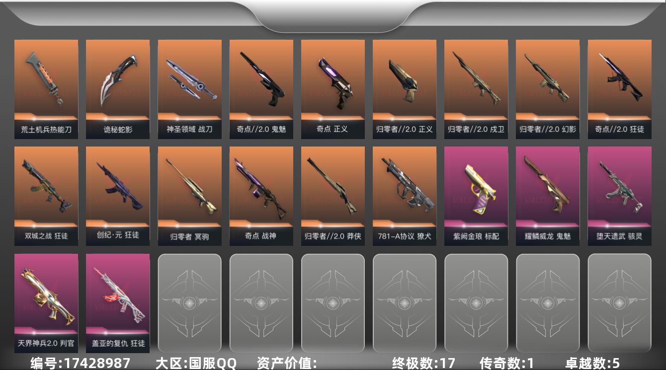 [17428987]【近战武器】:近战武器-荒土机兵 热能刀,近战武器-生物分子解离器,近战武器-夜刃诡镰,近战武器-诡秘蛇影 军刀,近战武器-神圣领域 战刀 【狂徒】:狂徒-奇点//2.0,狂徒-双城之战,狂徒-创·纪元,狂徒-盖亚的复仇,狂徒-荒土机兵,狂徒-诡秘蛇影 【幻影】:幻影-归零者//2.0,幻影-神圣领域,幻影-纳米打击,幻影-末日之翼 【戍卫】:戍卫-归零者//2.0,戍卫-逆冲蛮牛,戍卫-月球哨兵,戍卫-折光棱晶 【獠犬】:獠犬-781-A协议,獠犬-神圣领域,獠犬-逆冲蛮牛 【冥驹】:冥驹-归零者,冥驹-荒土机兵,冥驹-星云暗涌 【飞将】:飞将-末日之翼 【莽侠】:莽侠-归零者//2.0,莽侠-诡秘蛇影,莽侠-月球哨兵 【战神】:战神-奇点,战神-神圣领域 【奥丁】:奥丁-纳米打击,奥丁-末日之翼 【判官】:判官-天界神兵//2.0,判官-诡秘蛇影,判官-纳米打击x 【雄鹿】:雄鹿-逆冲蛮牛,雄鹿-月球哨兵 【骇灵】:骇灵-堕天遗武,骇灵-荒土机兵,骇灵-星云暗涌 【蜂刺】:蜂刺-星云暗涌,蜂刺-折光棱晶 【标配】:标配-紫阙金琅,标配-荒土机兵,标配-折光棱晶 【正义】:正义-归零者//2.0,正义-奇点,正义-超限闪存,正义-纳米打击,正义-月球哨兵 【鬼魅】:鬼魅-奇点//2.0,鬼魅-耀鳞威龙,鬼魅-诡秘蛇影,鬼魅-星云暗涌 【狂怒】:狂怒-神圣领域,狂怒-逆冲蛮牛 【短炮】:短炮-梦魇恶魔,短炮-末日之翼 【卡面】:终章:激斗汉堡 卡面,进入射程 卡面,分崩离析 卡面,纳米打击 卡面,抑制技术 卡面,激斗汉堡 卡面,瓦娃脸雪糕 P2 卡面,从黄昏到黎明 卡面,荒土机兵 卡面,银弹猎手 卡面,逆冲蛮牛 卡面,《双城之战》拥抱 卡面,精灵大战 卡面,欢迎来到底城 卡面,南瓜盛典 卡面,修车达人 卡面,正义的化身 卡面,无畏契约GO!第一卷:芮娜 卡面,无畏契约GO!第一卷:零 卡面,比比看谁快? 卡面,代号红色 卡面,新兵报到 卡面,V契约 卡面,无畏契约 卡面,暗潮 卡面 【喷漆】:小小心意 喷漆,战“素”兔 喷漆,宇宙的指引 喷漆,请求重启 喷漆,逆冲蛮牛 喷漆,纳米打击 喷漆,鼻尖上的蝴蝶 喷漆,简笔画黯兽 喷漆,独守蝰腹 喷漆,他们将落荒而逃 喷漆,通缉:战术企鹅 喷漆,荒土机兵 喷漆,别挡我吃球! 喷漆,嗨宝南瓜灯 喷漆,嘭! 喷漆,都算到了 喷