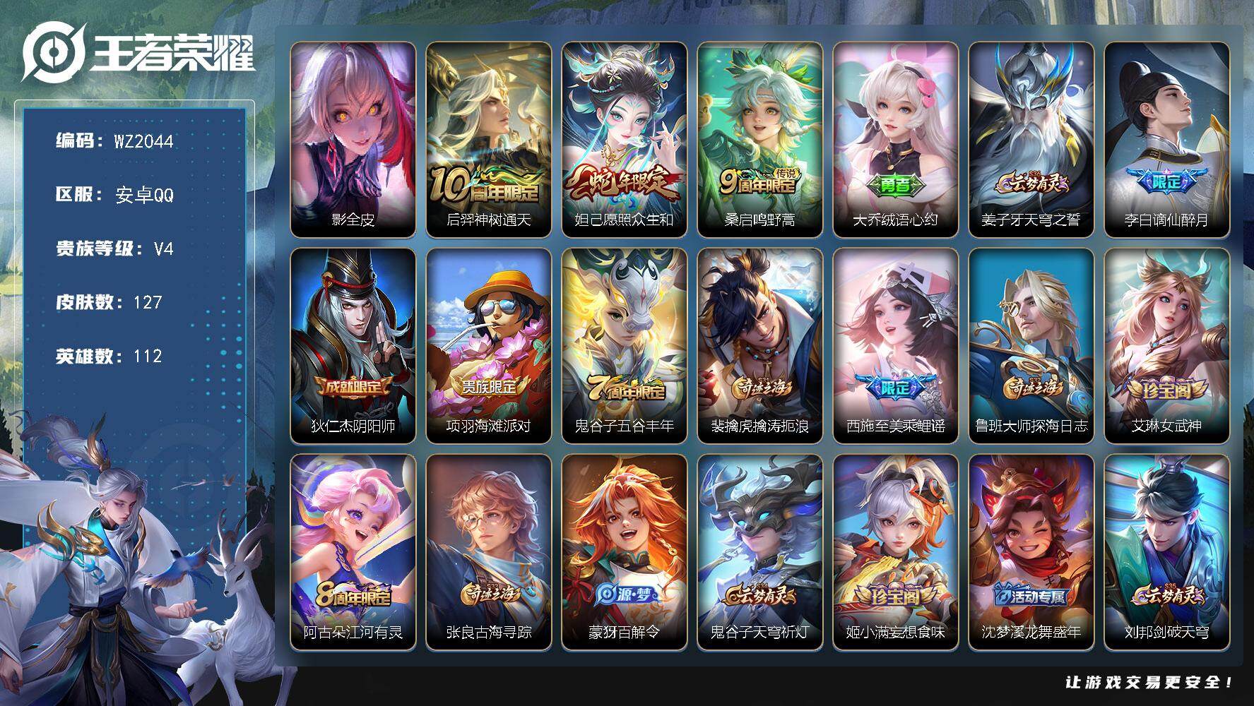 - [16024042]【店主推荐捡漏号!可直接换绑】安卓Q-V9-永恒钻石II段位-128英雄-372皮肤-2典藏皮肤-1珍品无双-1无双-4珍品传说-20传说-110史诗-2星元 【英雄全皮】:刘禅全皮,刘邦全皮,钟馗全皮,戈娅全皮,空空儿全皮 【荣耀典藏】:铠银白咏叹调,伽罗最初的交响 【珍品无双】:貂蝉馥梦繁花 【无双皮肤】:诸葛亮天机白泽 【珍品传说】:马可波罗怪盗基德,鲁班七号江户川柯南,瑶大耳狗之梦,宫本武藏黑崎一护 【传说皮肤】:司马懿九山相柳,公孙离云诺千山,妲己愿照众生和,澜愿照九州拓,虞姬愿照岁时盈,桑启鸣野蒿,典韦战鼓燎原,孙尚香乘龙问璇玑,吕布遇见神鼓,东皇太一灼幽烈阳,诸葛亮鹤羽星尊,孙悟空齐天大圣,李信山海炽霜斩,赵云淬星耀世,诸葛亮时雨天司,虞姬启明星使,张良黄金白羊座,虞姬云霓雀翎,貂蝉仲夏夜之梦,狄仁杰超时空战士 【限定皮肤】:白起狰,大乔绒语心约,狄仁杰阴阳师,虞姬凯尔特女王,廉颇寅虎御盾,赵云皇家上将,墨子降魔,嬴政白昼王子,孙尚香蔷薇恋人,鲁班七号狮舞东方,庄周高山流水,阿轲迷踪丽影,钟无艳超时空战士,扁鹊奇幻香踪,白起夜都怪侠,芈月重明,芈月幻夜卜梦,吕布猎兽之王,吕布遇见神鼓,周瑜赤莲之焰,元歌无心,夏侯惇朔风刀,甄姬游园惊梦,甄姬落雪兰心,曹操烛龙,典韦穷奇,典韦蓝屏警告,马可波罗暗影游猎,狄仁杰魔术师,达摩星际陆战队,达摩沙漠行僧,项羽海滩派对,老夫子醍醐杖,老夫子航海奇遇记,程咬金演武夺筹,刘邦夺宝奇兵,王昭君凤凰于飞,王昭君午后时光,兰陵王驯魔猎人,兰陵王金庭之子,孙悟空美猴王,孙悟空齐天大圣,牛魔御旌,后羿如梦令,后羿圣弓游侠,张飞虎魄,李元芳匿光侦查者,李元芳云中旅人,虞姬启明星使,钟馗神迹守卫,钟馗驱傩正仪,杨玉环遇见飞天,杨戬潮玩骑兵,女娲朔望之晖,干将莫邪真爱魔法,雅典娜单词大作战,蔡文姬繁星吟游,鬼谷子原初探秘者,鬼谷子五谷丰年,诸葛亮时雨天司,诸葛亮鹤羽星尊,黄忠火炮绅士,铠青龙志,苏烈千军破阵,百里玄策原初追逐者,弈星混沌棋,沈梦溪星空之诺,沈梦溪大漠名商,明世隐疑决卦,明世隐吟游魔法,裴擒虎李小龙,裴擒虎擒涛扼浪,狂铁御狮,狂铁电玩高手,米莱狄御霄,云中君纤云弄巧,李信山海炽霜斩,伽罗天狼溯光者,盾山御銮,嫦娥拒霜思,嫦娥暖冬兔眠,西施玲珑珍味,蒙犽狂想玩偶喵,鲁班大师探海日志,桑启海盐诗旅,暃星界游侠,戈娅驭风魔法