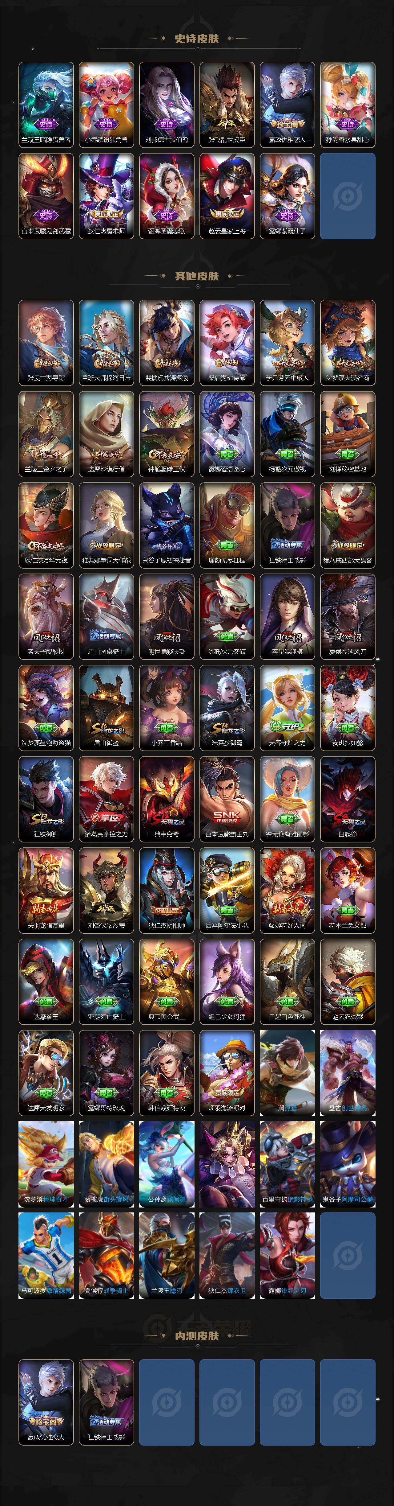 【史诗皮肤】:刘禅电玩爆裂旋风,杨玉环银翎春语,鬼谷子五谷丰年,芈月白晶晶,裴擒虎李小龙,蒙犽狂想玩偶喵,马可波罗暗影游猎,蔡文姬繁星吟游,上官婉儿梁祝,狄仁杰鹰眼统帅,孙悟空大圣娶亲,孙策猫狗日记,白起星夜王子,李元芳逐浪之夏,蔡文姬舞动绿茵,铠曙光守护者,安琪拉心灵骇客,雅典娜冰冠公主,兰陵王暗隐猎兽者,小乔缤纷独角兽,刘邦德古拉伯爵,张飞乱世虎臣,嬴政优雅恋人,孙尚香水果甜心,宫本武藏鬼剑武藏,狄仁杰魔术师,貂蝉圣诞恋歌,赵云皇家上将,露娜紫霞仙子