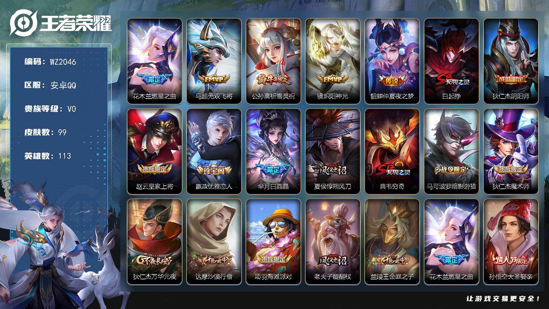 [17429527]安卓Q-99皮肤-5传说-29史诗 【传说皮肤】:花木兰燃星之曲,马超无双飞将,公孙离祈雪灵祝,镜炽阳神光,貂蝉仲夏夜之梦 【限定皮肤】:白起狰,狄仁杰阴阳师,赵云皇家上将,嬴政优雅恋人,芈月白晶晶,夏侯惇朔风刀,典韦穷奇,马可波罗暗影游猎,狄仁杰魔术师,狄仁杰万华元夜,达摩沙漠行僧,项羽海滩派对,老夫子醍醐杖,兰陵王金庭之子,花木兰燃星之曲,孙悟空大圣娶亲,李元芳云中旅人,钟馗驱傩正仪,雅典娜单词大作战,蔡文姬繁星吟游,鬼谷子原初探秘者,鬼谷子五谷丰年,弈星混沌棋,公孙离祈雪灵祝,沈梦溪大漠名商,明世隐疑决卦,裴擒虎李小龙,裴擒虎擒涛扼浪,狂铁御狮,米莱狄御霄,盾山御銮,猪八戒西部大镖客,上官婉儿梁祝,蒙犽狂想玩偶喵,鲁班大师探海日志,桑启海盐诗旅,张良古海寻踪 【年限皮肤】:公孙离祈雪灵祝 【赛季限定】:白起狰,典韦穷奇,狂铁御狮,米莱狄御霄,盾山御銮,夏侯惇朔风刀,弈星混沌棋,明世隐疑决卦,老夫子醍醐杖,鬼谷子原初探秘者,狄仁杰万华元夜,钟馗驱傩正仪,达摩沙漠行僧,兰陵王金庭之子,沈梦溪大漠名商,李元芳云中旅人,桑启海盐诗旅,裴擒虎擒涛扼浪,鲁班大师探海日志,张良古海寻踪 【战令限定】:马可波罗暗影游猎,猪八戒西部大镖客,蒙犽狂想玩偶喵,雅典娜单词大作战 【史诗皮肤】:刘禅电玩爆裂旋风,杨玉环银翎春语,鬼谷子五谷丰年,芈月白晶晶,裴擒虎李小龙,蒙犽狂想玩偶喵,马可波罗暗影游猎,蔡文姬繁星吟游,上官婉儿梁祝,狄仁杰鹰眼统帅,孙悟空大圣娶亲,孙策猫狗日记,白起星夜王子,李元芳逐浪之夏,蔡文姬舞动绿茵,铠曙光守护者,安琪拉心灵骇客,雅典娜冰冠公主,兰陵王暗隐猎兽者,小乔缤纷独角兽,刘邦德古拉伯爵,张飞乱世虎臣,嬴政优雅恋人,孙尚香水果甜心,宫本武藏鬼剑武藏,狄仁杰魔术师,貂蝉圣诞恋歌,赵云皇家上将,露娜紫霞仙子 【其他皮肤】:张良古海寻踪,鲁班大师探海日志,裴擒虎擒涛扼浪,桑启海盐诗旅,李元芳云中旅人,沈梦溪大漠名商,兰陵王金庭之子,达摩沙漠行僧,钟馗驱傩正仪,露娜瓷语鉴心,杨戬次元傲视,刘禅秘密基地,狄仁杰万华元夜,雅典娜单词大作战,鬼谷子原初探秘者,廉颇无尽征程,狂铁特工战影,猪八戒西部大镖客,老夫子醍醐杖,盾山圆桌骑士,明世隐疑决卦,哪吒次元突破,弈星混沌棋,夏侯惇朔风刀,沈梦溪鲨炮海盗猫,盾山御銮,小乔丁香结,米莱狄御霄,大乔守护之力,安琪拉如懿,狂铁御狮