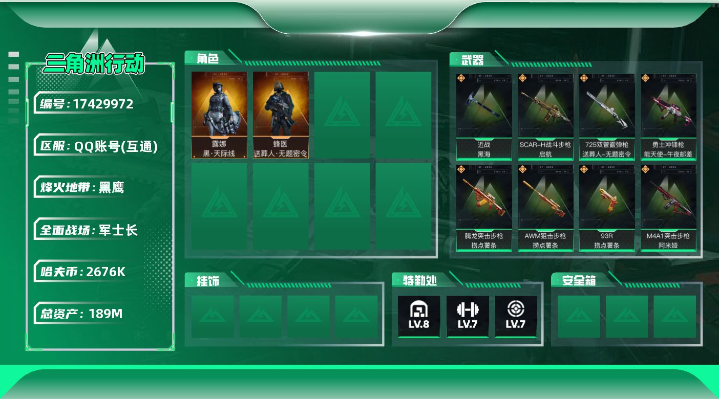 [17429972]【特价出售/店主推荐】189m总资产-2676k哈伏币-60烽火等级-黑鹰-50战场等级-军士长 【干员外观】:露娜-黑·天际线,蜂医-送葬人·无题密令 【近战皮肤】:近战-黑海,近战-黑鹰 【传说外观】:M4A1突击步枪-阿米娅,M7战斗步枪-神秘艺术,SCAR-H战斗步枪-启航,CAR-15突击步枪-黑鹰坠落,CAR-15突击步枪-阿米娅,AS Val突击步枪-蛇年祥瑞,腾龙突击步枪-捞点薯条,MP5冲锋枪-黑海,P90冲锋枪-神秘艺术,SMG-45冲锋枪-骑士,勇士冲锋枪-能天使-午夜邮差,725双管霰弹枪-送葬人-无题密令,QJB201轻机枪-黑海,SR-25射手步枪-水墨云图,AWM狙击步枪-捞点薯条,93R-捞点薯条,复合弓-黑·天际线 【史诗外观】:AKM突击步枪-林中猎手,QBZ95-1突击步枪-曙光,K416突击步枪-竞技风,M16A4突击步枪-竞赛选手,AUG突击步枪-蝮蛇,SG552突击步枪-深海恐惧,SCAR-H战斗步枪-囚徒,G3战斗步枪-战场英杰,AS Val突击步枪-刀锋,腾龙突击步枪-无垢,MP5冲锋枪-深海恐惧,MP5冲锋枪-战术竞备,MP5冲锋枪-竞技风,Vector冲锋枪-阿萨拉文明,Vector冲锋枪-猎鳄行动,SR-3M紧凑突击步枪-英雄,SR-3M紧凑突击步枪-荒野求生,SR-3M紧凑突击步枪-战术竞备,勇士冲锋枪-深海恐惧,勇士冲锋枪-工业狂潮,MP7冲锋枪-无垢,M1014霰弹枪-林中猎手,S12K霰弹枪-曙光,PKM通用机枪-蝮蛇,PKM通用机枪-荒野求生,M250通用机枪-囚徒,SVD狙击步枪-阿萨拉工艺,SVD狙击步枪-暗夜猎手,SVD狙击步枪-荒野求生,PSG-1射手步枪-无垢,SV-98狙击步枪-林中猎手,SV-98狙击步枪-囚徒,SV-98狙击步枪-猎鳄行动,M700狙击步枪-竞技风,M700狙击步枪-蝮蛇,M700狙击步枪-哈夫克警备,QSZ92G-风林火山,.357左轮-幸运时刻,沙漠之鹰-曙光,93R-博士 【稀有外观】:PKM通用机枪-黑潮,M4A1突击步枪-战术小队,M4A1突击步枪-前沿科技,AKM突击步枪-古城,AKM突击步枪-前沿科技,AKM突击步枪-浅鲨小队,AKM突击步枪-肃杀,QBZ95-1突击步枪-公平竞技,AKS-74U突击步枪-前沿科技,ASh-12战斗步枪-星链科技,ASh-