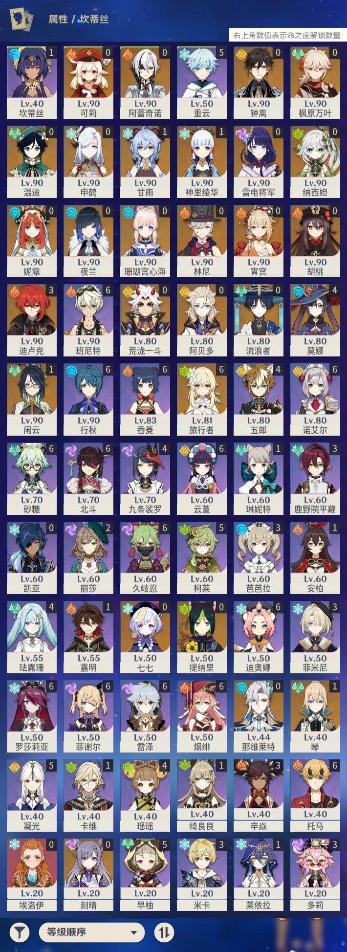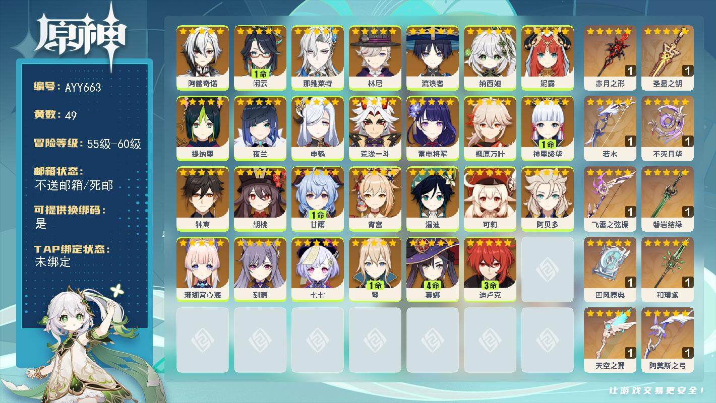 [17431136]60级/49黄/女主/27个五星角色/11个五星武器 0命阿蕾奇诺,1命闲云,0命那维莱特,0命林尼,0命流浪者,0命纳西妲,0命妮露,0命提纳里,0命夜兰,0命申鹤,0命荒泷一斗,0命雷电将军,0命枫原万叶,1命神里绫华,0命钟离,0命胡桃,1命甘雨,0命宵宫,0命温迪,0命可莉,0命阿贝多,0命珊瑚宫心海,0命刻晴,0命七七,1命琴,4命莫娜,3命迪卢克,精1赤月之形,精1圣显之钥,精1若水,精1不灭月华,精1飞雷之弦振,精1磐岩结绿,精1四风原典,精1和璞鸢,精1天空之翼,精1阿莫斯之弓
