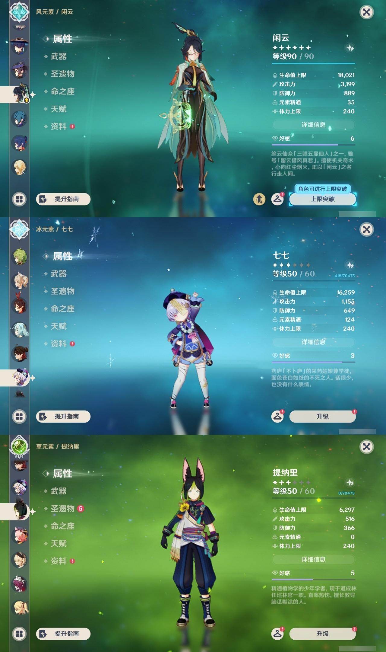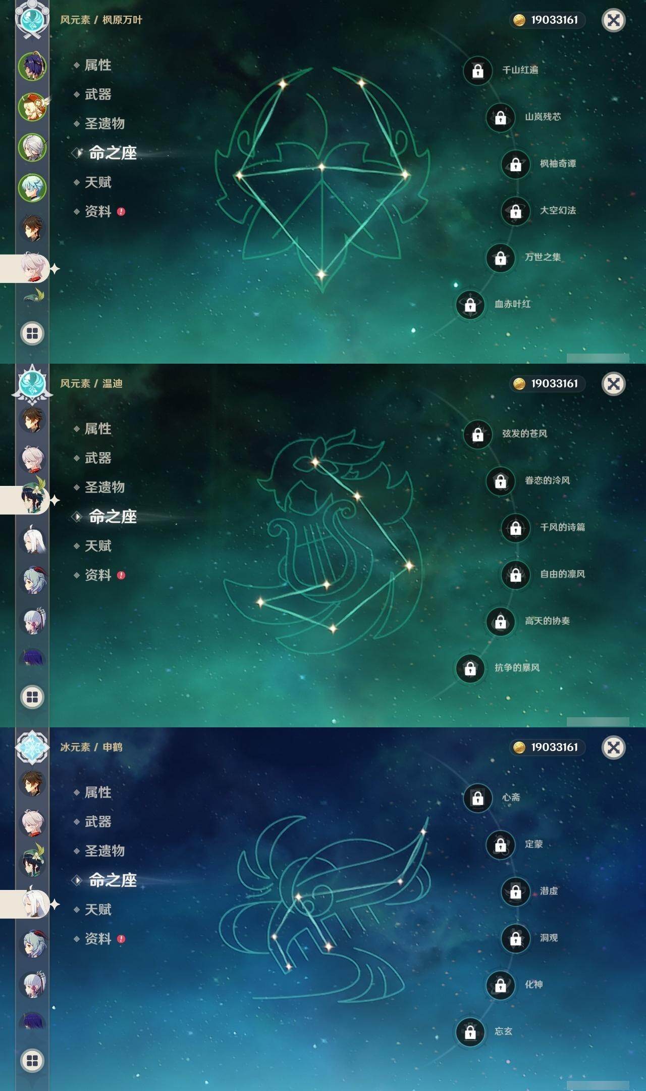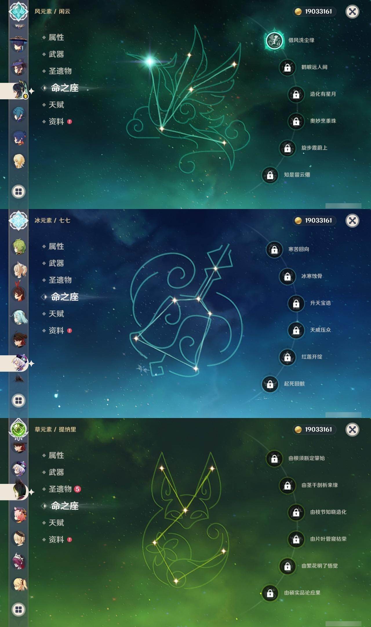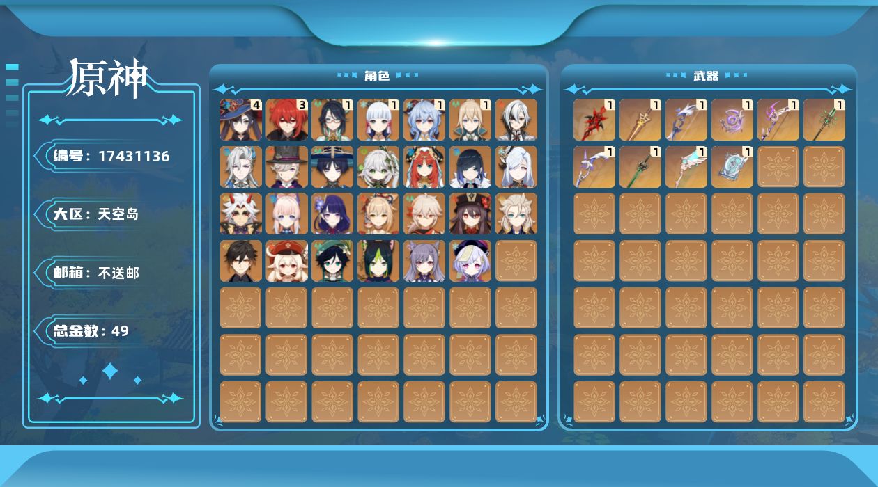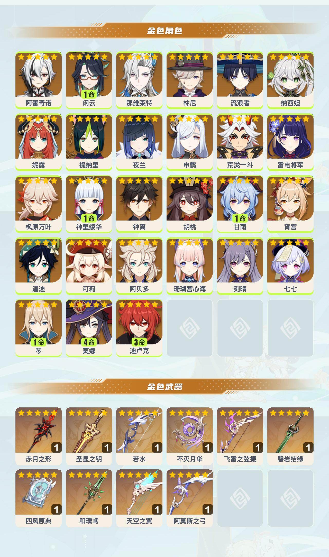 0命阿蕾奇诺,1命闲云,0命那维莱特,0命林尼,0命流浪者,0命纳西妲,0命妮露,0命提纳里,0命夜兰,0命申鹤,0命荒泷一斗,0命雷电将军,0命枫原万叶,1命神里绫华,0命钟离,0命胡桃,1命甘雨,0命宵宫,0命温迪,0命可莉,0命阿贝多,0命珊瑚宫心海,0命刻晴,0命七七,1命琴,4命莫娜,3命迪卢克,精1赤月之形,精1圣显之钥,精1若水,精1不灭月华,精1飞雷之弦振,精1磐岩结绿,精1四风原典,精1和璞鸢,精1天空之翼,精1阿莫斯之弓