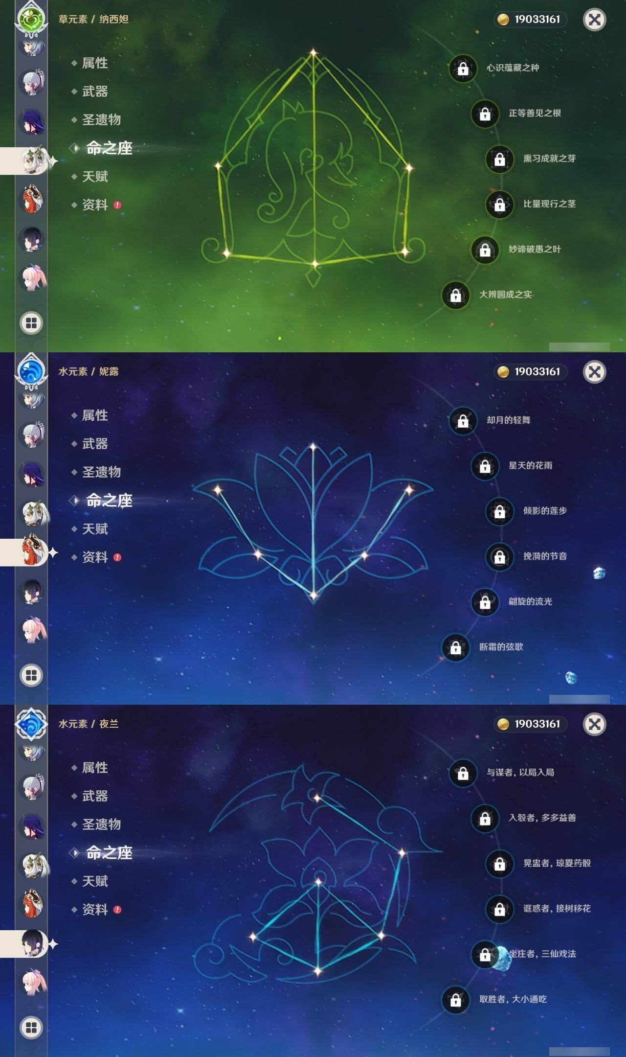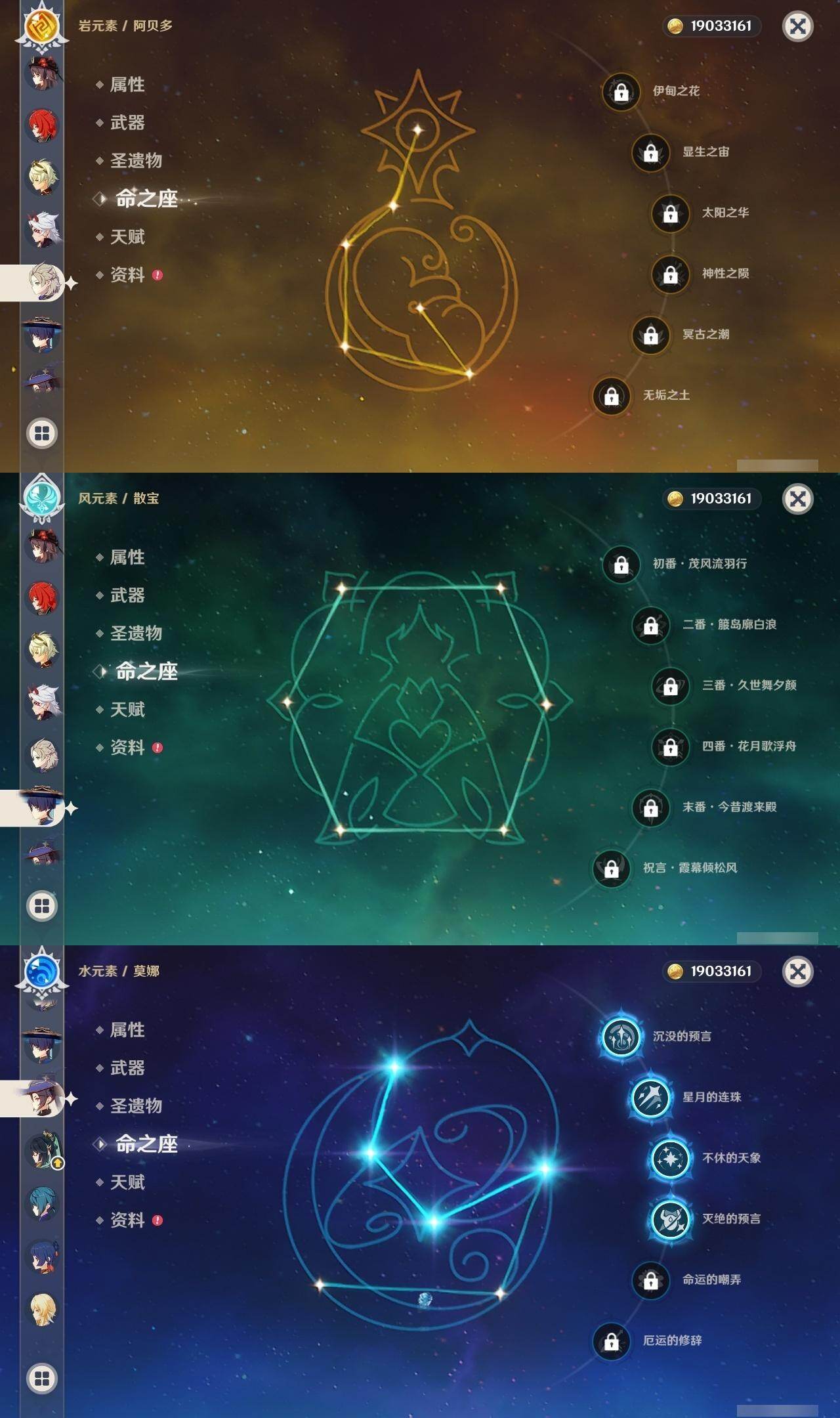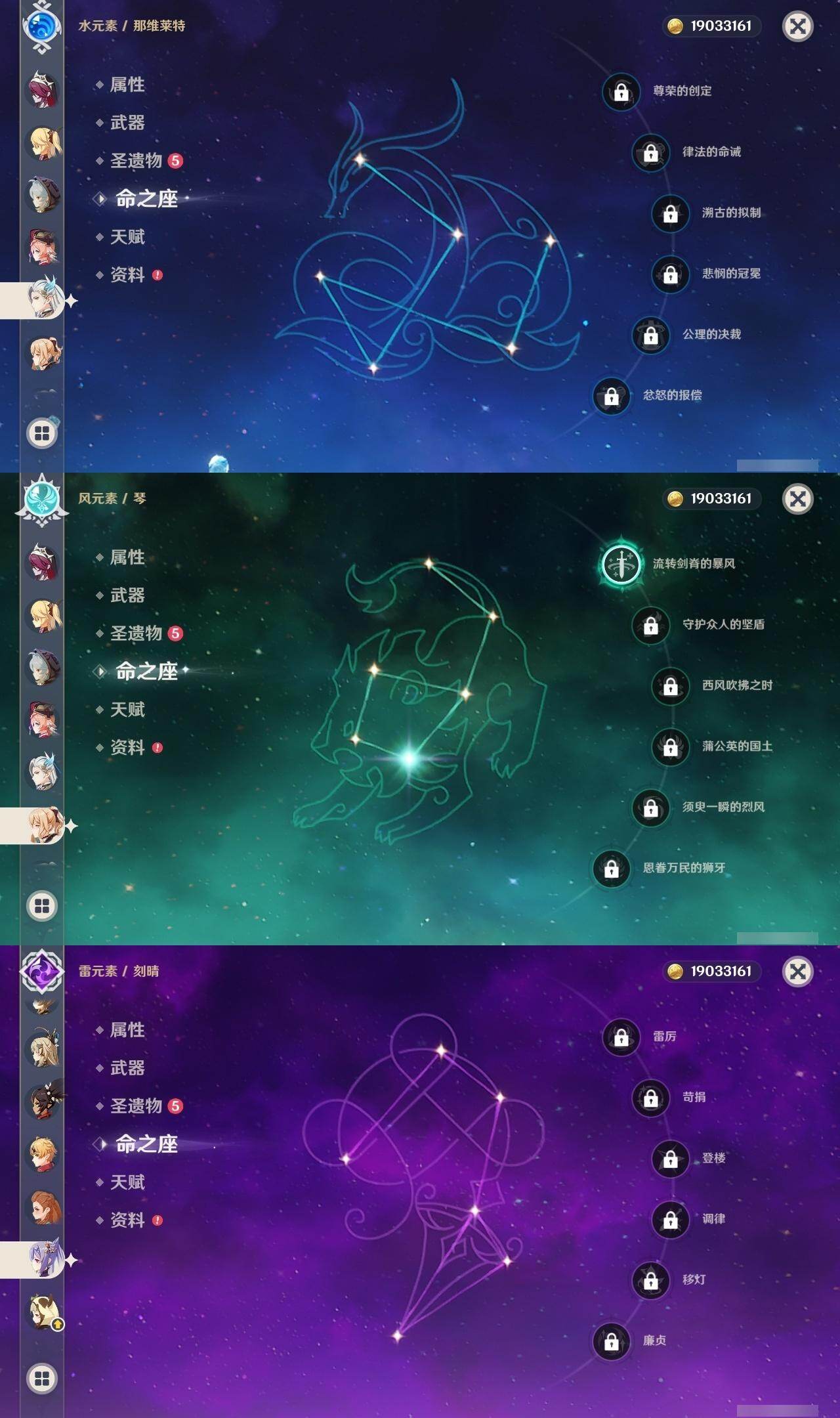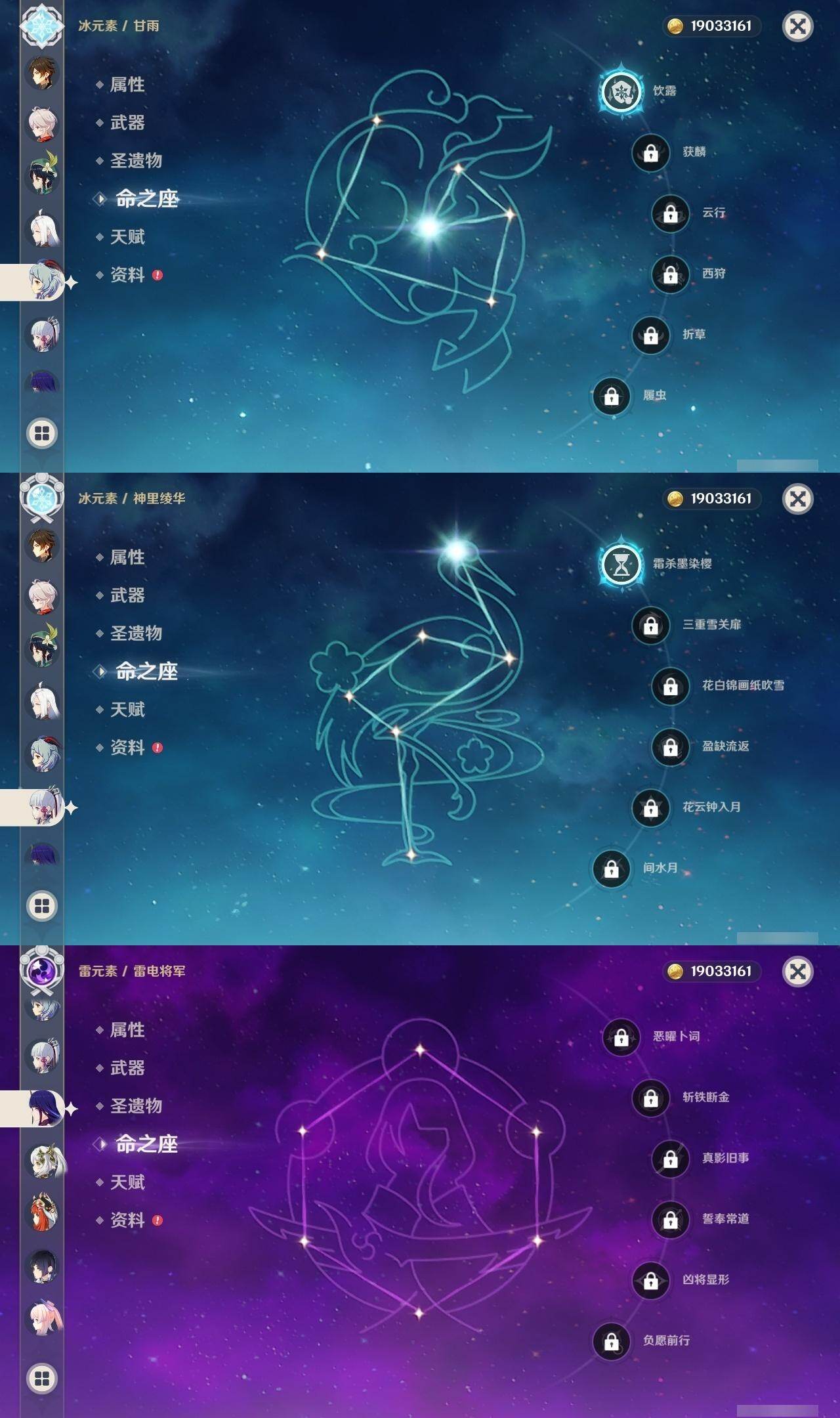 0命阿蕾奇诺,1命闲云,0命那维莱特,0命林尼,0命流浪者,0命纳西妲,0命妮露,0命提纳里,0命夜兰,0命申鹤,0命荒泷一斗,0命雷电将军,0命枫原万叶,1命神里绫华,0命钟离,0命胡桃,1命甘雨,0命宵宫,0命温迪,0命可莉,0命阿贝多,0命珊瑚宫心海,0命刻晴,0命七七,1命琴,4命莫娜,3命迪卢克,精1赤月之形,精1圣显之钥,精1若水,精1不灭月华,精1飞雷之弦振,精1磐岩结绿,精1四风原典,精1和璞鸢,精1天空之翼,精1阿莫斯之弓