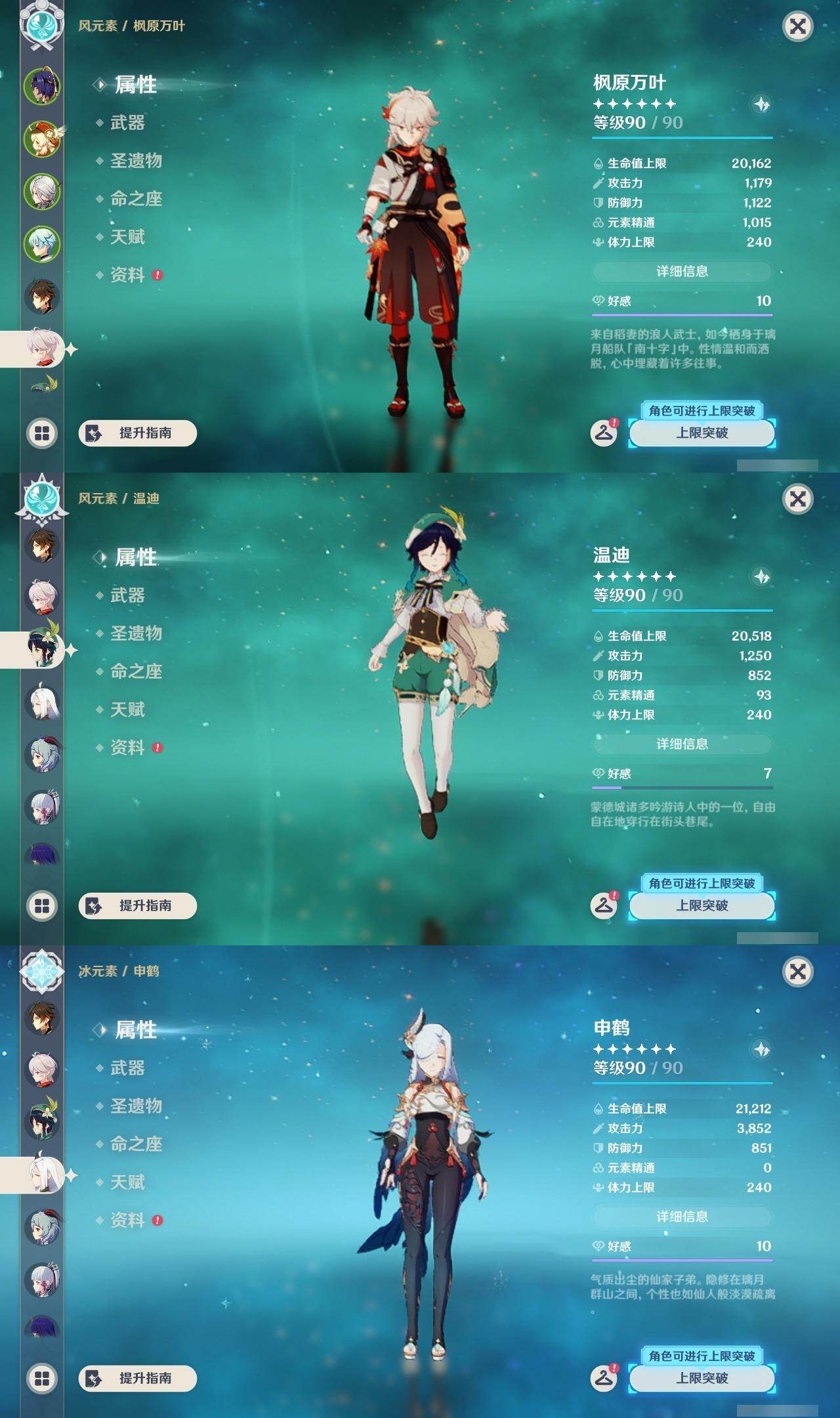可莉,钟离,枫原万叶,温迪,申鹤,甘雨,神里凌华,雷电将军,珊瑚宫心海,宵宫,胡桃,迪卢克,荒泷一斗,阿贝多,莫娜,七七,琴,刻晴