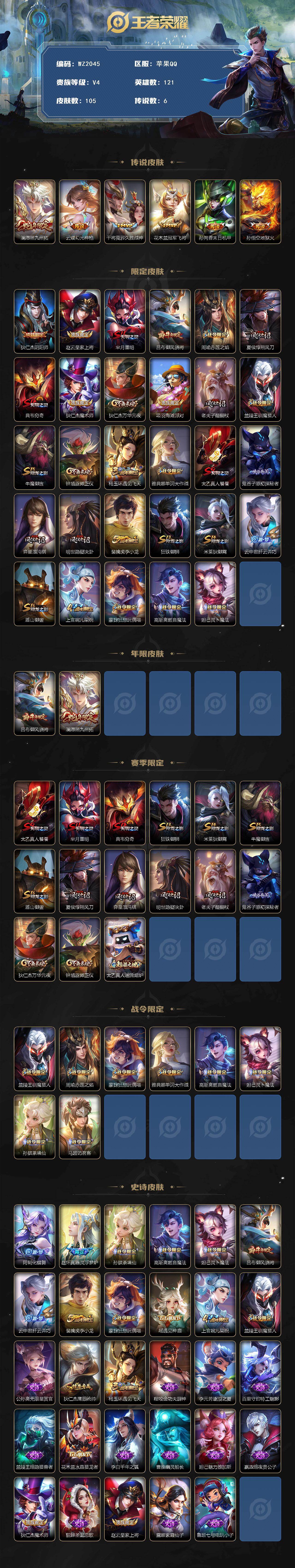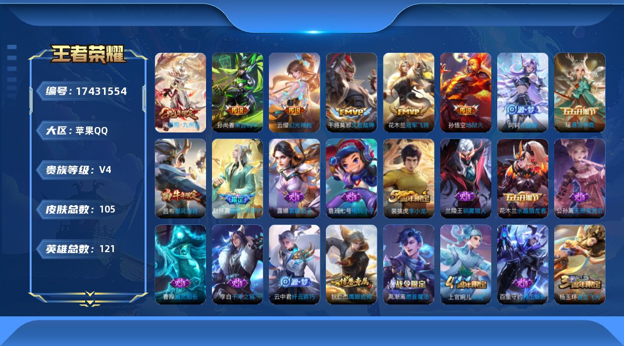 [17431554]苹果Q-V4-永恒钻石I段位-121英雄-105皮肤-6传说-28史诗