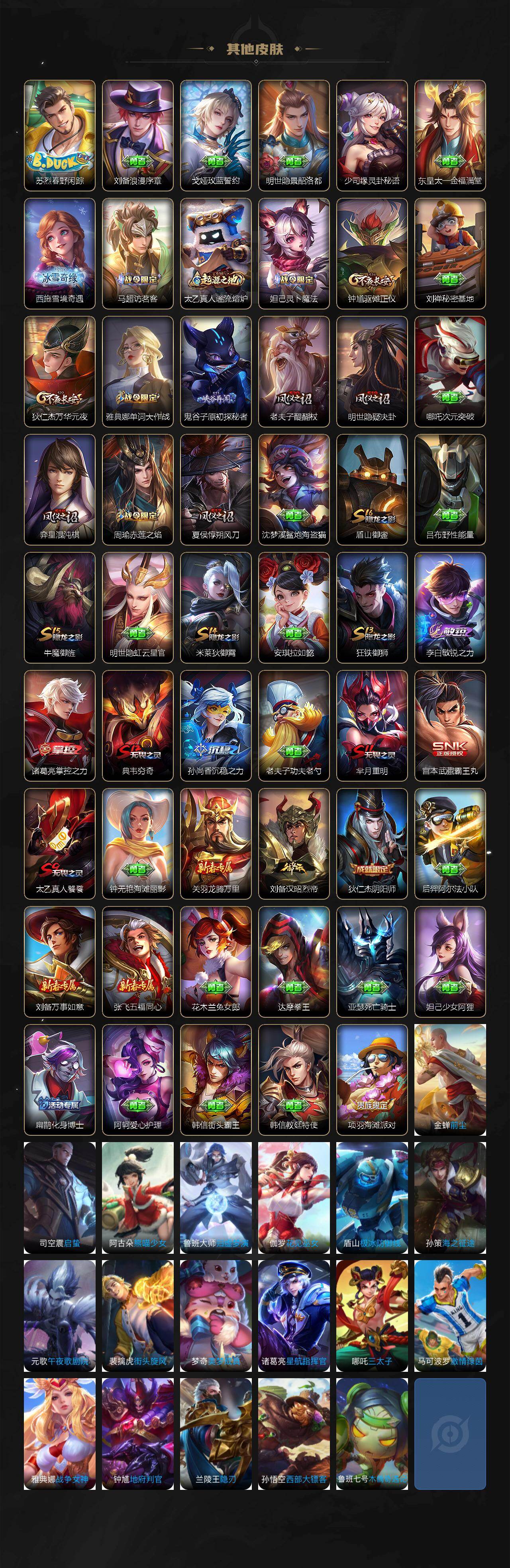 【其他皮肤】:苏烈春野闲踪,刘备浪漫序章,戈娅玫蓝誓约,明世隐景韶洛都,少司缘灵卦秘语,东皇太一金福满堂,西施雪境奇遇,马超访茗客,太乙真人谧流熔炉,妲己灵卜魔法,钟馗驱傩正仪,刘禅秘密基地,狄仁杰万华元夜,雅典娜单词大作战,鬼谷子原初探秘者,老夫子醍醐杖,明世隐疑决卦,哪吒次元突破,弈星混沌棋,周瑜赤莲之焰,夏侯惇朔风刀,沈梦溪鲨炮海盗猫,盾山御銮,吕布野性能量,牛魔御旌,明世隐虹云星官,米莱狄御霄,安琪拉如懿,狂铁御狮,李白敏锐之力,诸葛亮掌控之力,典韦穷奇,孙尚香沉稳之力,老夫子功夫老勺,芈月重明,宫本武藏霸王丸,太乙真人饕餮,钟无艳海滩丽影,关羽龙