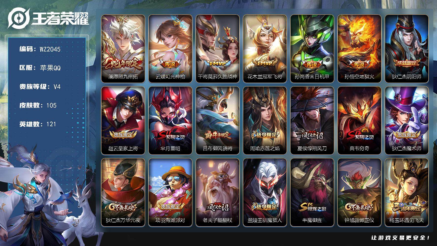 [17431554]苹果Q-V4-永恒钻石I段位-121英雄-105皮肤-6传说-28史诗 【传说皮肤】:澜愿照九州拓,云缨幻光神枪,干将莫邪久胜战神,花木兰冠军飞将,孙尚香末日机甲,孙悟空地狱火 【限定皮肤】:狄仁杰阴阳师,赵云皇家上将,芈月重明,吕布御风骁将,周瑜赤莲之焰,夏侯惇朔风刀,典韦穷奇,狄仁杰魔术师,狄仁杰万华元夜,项羽海滩派对,老夫子醍醐杖,兰陵王驯魔猎人,牛魔御旌,钟馗驱傩正仪,杨玉环遇见飞天,雅典娜单词大作战,太乙真人饕餮,鬼谷子原初探秘者,弈星混沌棋,明世隐疑决卦,裴擒虎李小龙,狂铁御狮,米莱狄御霄,云中君纤云弄巧,盾山御銮,上官婉儿梁祝,蒙犽狂想玩偶喵,高渐离燃音魔法,妲己灵卜魔法 【年限皮肤】:吕布御风骁将,澜愿照九州拓 【赛季限定】:太乙真人饕餮,芈月重明,典韦穷奇,狂铁御狮,米莱狄御霄,牛魔御旌,盾山御銮,夏侯惇朔风刀,弈星混沌棋,明世隐疑决卦,老夫子醍醐杖,鬼谷子原初探秘者,狄仁杰万华元夜,钟馗驱傩正仪,太乙真人谧流熔炉 【战令限定】:兰陵王驯魔猎人,周瑜赤莲之焰,蒙犽狂想玩偶喵,雅典娜单词大作战,高渐离燃音魔法,妲己灵卜魔法,孙膑茶境仙,马超访茗客 【史诗皮肤】:阿轲化蝶舞,赵怀真器灵浮梦炉,孙膑茶境仙,高渐离燃音魔法,妲己灵卜魔法,吕布御风骁将,云中君纤云弄巧,裴擒虎李小龙,蒙犽狂想玩偶喵,瑶遇见神鹿,上官婉儿梁祝,兰陵王驯魔猎人,公孙离无限星赏官,狄仁杰鹰眼统帅,杨玉环遇见飞天,程咬金功夫厨神,李元芳逐浪之夏,百里守约特工魅影,兰陵王暗隐猎兽者,花木兰水晶猎龙者,李白千年之狐,曹操幽灵船长,妲己魅力维加斯,嬴政暗夜贵公子,狄仁杰魔术师,貂蝉圣诞恋歌,赵云皇家上将,露娜紫霞仙子,鲁班七号电玩小子 【其他皮肤】:苏烈春野闲踪,刘备浪漫序章,戈娅玫蓝誓约,明世隐景韶洛都,少司缘灵卦秘语,东皇太一金福满堂,西施雪境奇遇,马超访茗客,太乙真人谧流熔炉,妲己灵卜魔法,钟馗驱傩正仪,刘禅秘密基地,狄仁杰万华元夜,雅典娜单词大作战,鬼谷子原初探秘者,老夫子醍醐杖,明世隐疑决卦,哪吒次元突破,弈星混沌棋,周瑜赤莲之焰,夏侯惇朔风刀,沈梦溪鲨炮海盗猫,盾山御銮,吕布野性能量,牛魔御旌,明世隐虹云星官,米莱狄御霄,安琪拉如懿,狂铁御狮,李白敏锐之力,诸葛亮掌控之力,典韦穷奇,孙尚香沉稳之力,老夫子功夫老勺,芈月重明,宫本武藏霸王丸,太乙真人饕餮,钟无艳海滩丽影,关羽龙