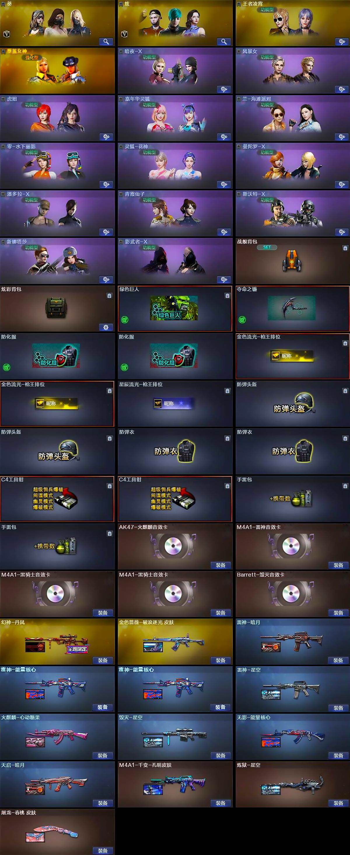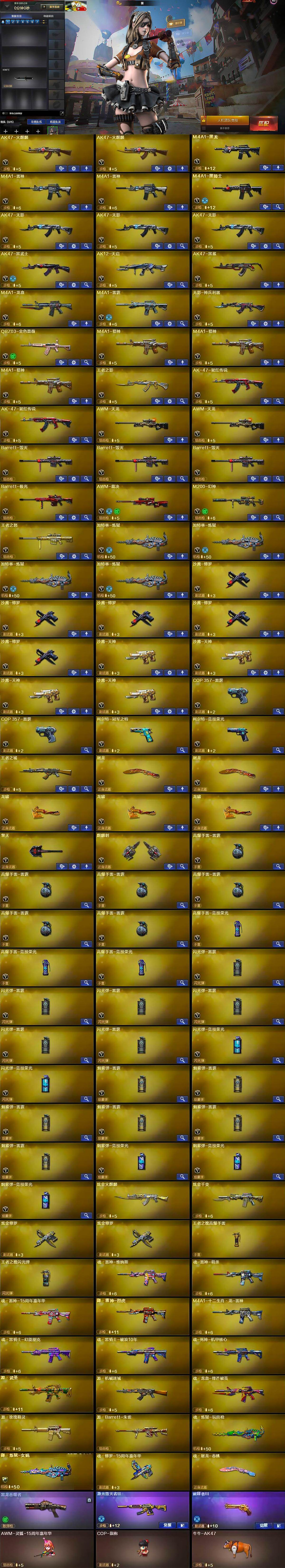 【英雄级武器】:AK47-火麒麟*2,M4A1-黑龙,M4A1-雷神*2,M4A1-黑骑士,AK47-无影*3,AK47-黑武士,AK12-天启,AK47-黑鲨,M4A1-龙血,M4A1-雷霆,无影-神兵利器,QBZ03-金色蔷薇,M4A1-猎神*3,9A91-烈火,王者之影-觉醒版,AK-47-猩红传说*2,AWM-天龙*2,Barrett-毁灭*3,Barrett-极光,AWM-裁决,M200-幻神,王者之怒-觉醒版,加特林-炼狱*4,沙鹰-修罗*5,沙鹰-天神*4,COP-雷霆*2,柯尔特-冠军之特,柯尔特-竞技荣光,屠龙*2,龙啸*3,擎天,麒麟刺,高爆手雷-雷霆*6,高爆手雷-竞技荣光*3,闪光弹-雷霆*6,闪光弹-竞技荣光*2,烟雾弹-雷霆*6,烟雾弹-竞技荣光*3
