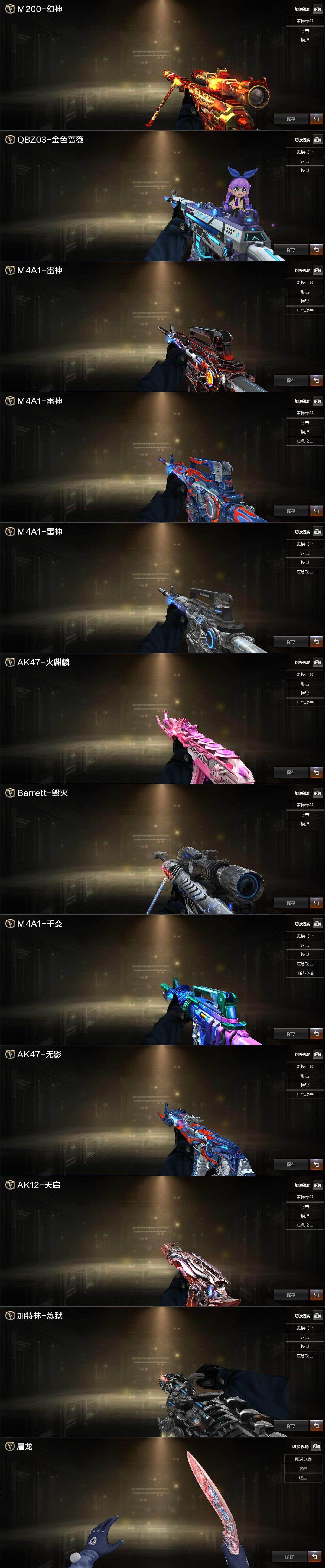 【热门武器】:QBZ03-金色蔷薇,M200-幻神,柯尔特-冠军之特,牛牛-AK47,M4A1-黑骑士,加特林-炼狱*4,沙鹰-修罗*5
