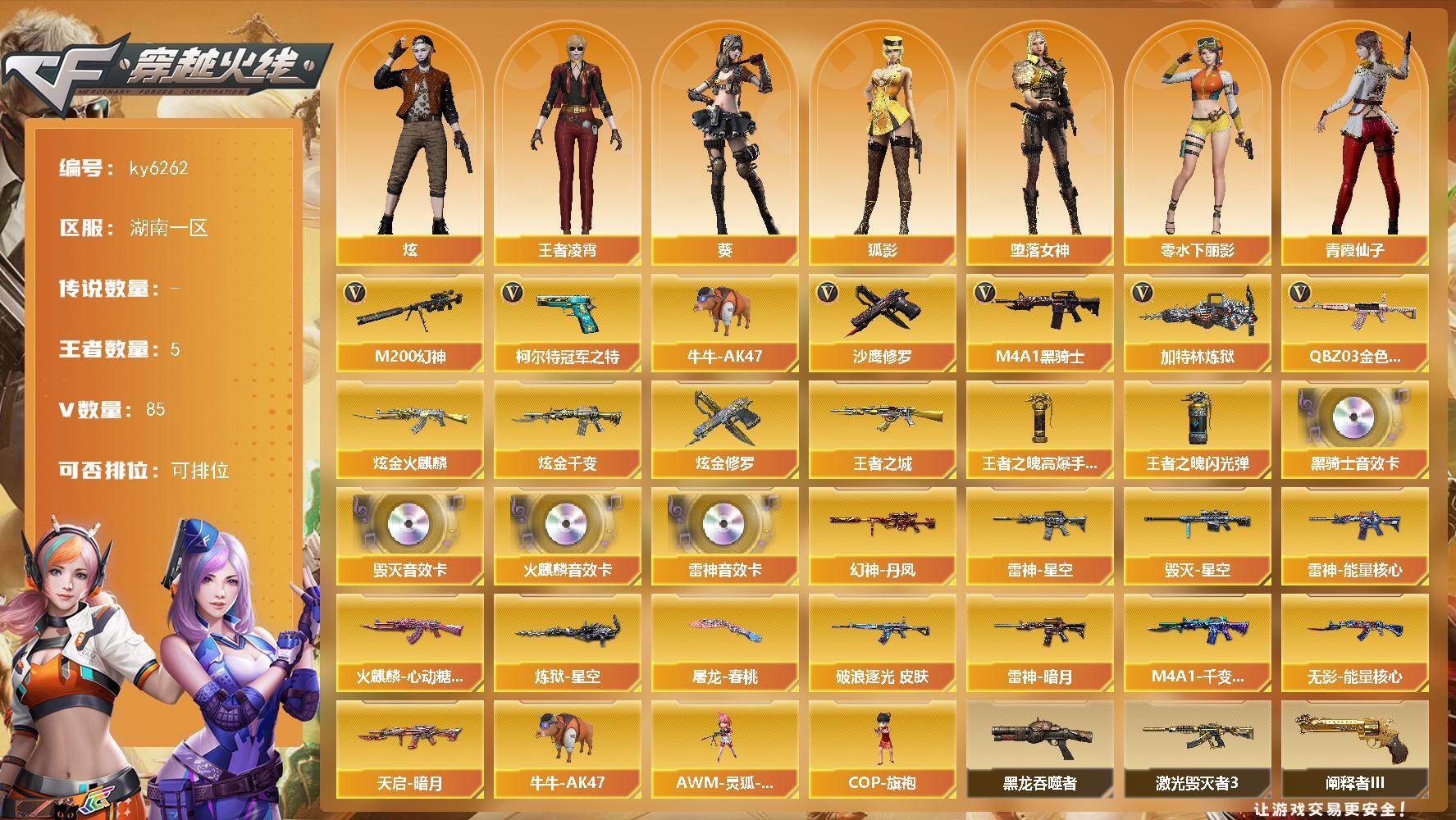 [17432743]【ky6262】湖南一区-87V-5王者武器数-4炫金武器数 【热门武器】:QBZ03-金色蔷薇,M200-幻神,柯尔特-冠军之特,牛牛-AK47,M4A1-黑骑士,加特林-炼狱*4,沙鹰-修罗*5 【王者炫金武器】:王者之城,炫金火麒麟,炫金千变,炫金修罗*2,王者之魄高爆手雷,王者之魄闪光弹 【音效卡】:AK47-火麒麟音效卡,M4A1-雷神音效卡,M4A1-黑骑士音效卡*2,Barrett-毁灭音效卡 【皮肤】:幻神-丹凤,金色蔷薇-破浪逐光 皮肤,雷神-暗月,雷神-能量核心*2,雷神-星空,火麒麟-心动糖果,毁灭-星空,M4A1-千变-孔明皮肤,无影-能量核心,天启-暗月,炼狱-星空,屠龙-春桃 皮肤 【角色】:葵,炫,王者凌霄,堕落女神,狐影,暗夜-X,风暴女,虎妞,嘉年华灵狐,兰-海滩派对,零-水下丽影,灵狐-花神,曼陀罗-X,潘多拉-X,青霞仙子,斯沃特-X,新娜塔莎,影武者-X 【人偶武器】:AWM-灵狐-15周年嘉年华,COP-旗袍,牛牛-AK47 【暴走生化】:黑龙吞噬者 【挑战大师】:激光毁灭者III,阐释者III 【英雄级武器】:AK47-火麒麟*2,M4A1-黑龙,M4A1-雷神*2,M4A1-黑骑士,AK47-无影*3,AK47-黑武士,AK12-天启,AK47-黑鲨,M4A1-龙血,M4A1-雷霆,无影-神兵利器,QBZ03-金色蔷薇,M4A1-猎神*3,9A91-烈火,王者之影-觉醒版,AK-47-猩红传说*2,AWM-天龙*2,Barrett-毁灭*3,Barrett-极光,AWM-裁决,M200-幻神,王者之怒-觉醒版,加特林-炼狱*4,沙鹰-修罗*5,沙鹰-天神*4,COP-雷霆*2,柯尔特-冠军之特,柯尔特-竞技荣光,屠龙*2,龙啸*3,擎天,麒麟刺,高爆手雷-雷霆*6,高爆手雷-竞技荣光*3,闪光弹-雷霆*6,闪光弹-竞技荣光*2,烟雾弹-雷霆*6,烟雾弹-竞技荣光*3 【道具】:战舰背包,炫彩背包,绿色巨人,夺命之镰,防化服*2,金色流光-枪王排位*2,星辰流光-枪王排位,防弹头盔*2,防弹衣*2,C4工具钳*2,手雷包*2 【特殊枪械】:1黑骑士,4炼狱