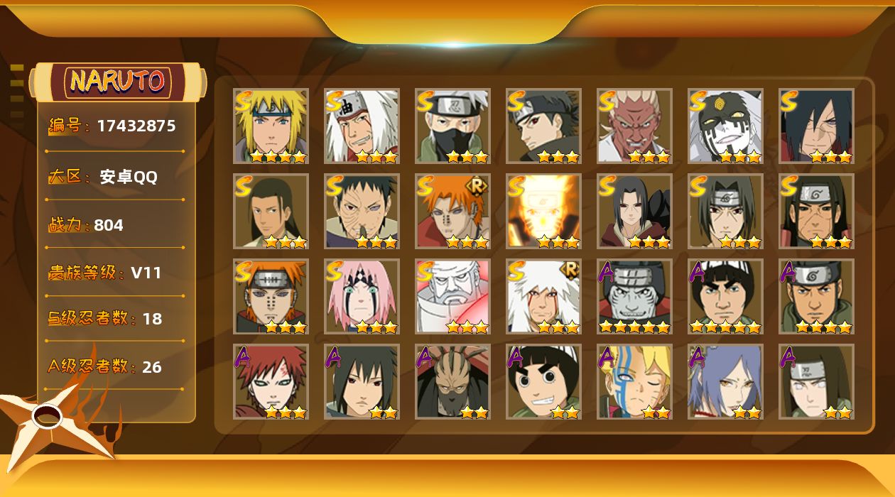 【S级忍者】:千手柱间「秽土转生」(3星),宇智波鼬「秽土转生」(3星),宇智波斑「秽土转生·解」(3星),春野樱「忍界大战」(3星),宇智波带土「忍界大战」(3星),艾「忍界大战」(3星),宇智波鼬「须佐能乎」(3星),宇智波止水「须佐能乎」(3星),旗木卡卡西「须佐能乎」(3星),千手柱间「木叶创立」(3星),自来也「舞之豪杰」(3星),自来也「传说中的三忍」(3星),波风水门(4星),漩涡鸣人「九喇嘛连结」(3星),佩恩「天道」(3星),佩恩·天道「超」(3星),大筒木金式(3星),大筒木桃式(3星)