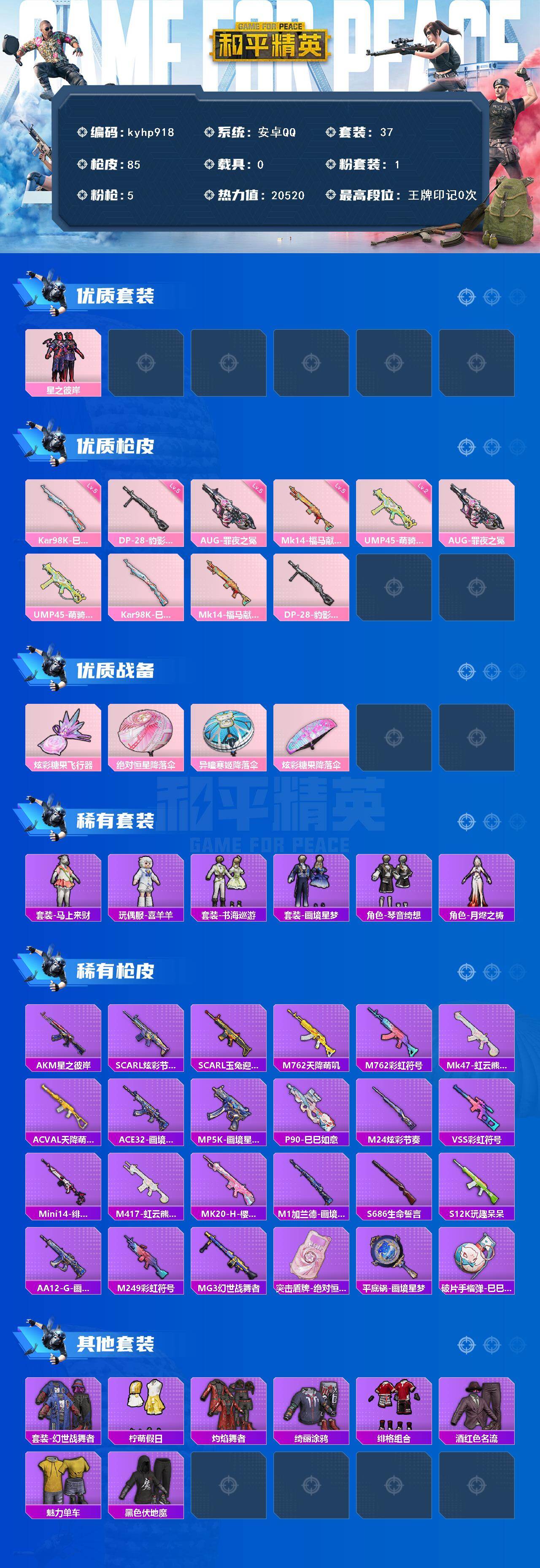 [17432838]安卓 手Q-1粉装-5特效枪-0载具-1粉色飞行器-20520热力值-0王牌印记-37套装-85枪皮 【粉色套装】:粉装-星之彼岸 【粉色枪皮等级】:AUG-罪夜之冕(五级),UMP45-萌骑冒险(二级),Kar98K-巳巳如意(五级),Mk14-福马献瑞(五级),DP-28-豹影疾电(五级) 【粉色枪皮】:AUG-罪夜之冕,UMP45-萌骑冒险,Kar98K-巳巳如意,Mk14-福马献瑞,DP-28-豹影疾电 【粉色飞行器】:炫彩糖果飞行器 【粉色降落伞】:绝对恒星降落伞,异瞳寒姬降落伞,炫彩糖果降落伞 【稀有套装】:套装-雪国风尚,套装-炫彩糖果,套装-马上来财,玩偶服-喜羊羊,套装-书海巡游,套装-画境星梦,套装-琴音绮想,角色-月烬之祷 【稀有枪皮】:AUG-冰晶雪宝,AKM-星之彼岸,SCAR-L-炫彩节奏,SCAR-L-玉兔迎春,M762-天降萌叽,M762-彩虹符号,Mk47-虹云熊熊,AC-VAL-天降萌叽,ACE32-画境星梦,MP5K-画境星梦,P90-巳巳如意,M24-炫彩节奏,VSS-彩虹符号,Mini14-绯穹魔姬,M417-虹云熊熊,MK20-H-樱桃泡泡,M1加兰德-画境星梦,S686-生命誓言,S12K-玩趣呆呆,AA12-G-画境星梦,M249-彩虹符号,MG3-幻世战舞者,突击盾牌-绝对恒星,平底锅-画境星梦,破片手榴弹-巳巳如意 【其他套装】:套装-幻世战舞者,套装-柠萌假日,套装-灼焰舞者,套装-绮丽涂鸦,套装-绯格组合,套装-酒红色名流,套装-魅力单车,套装-黑色伏地魔 【营地ID】:1001301636