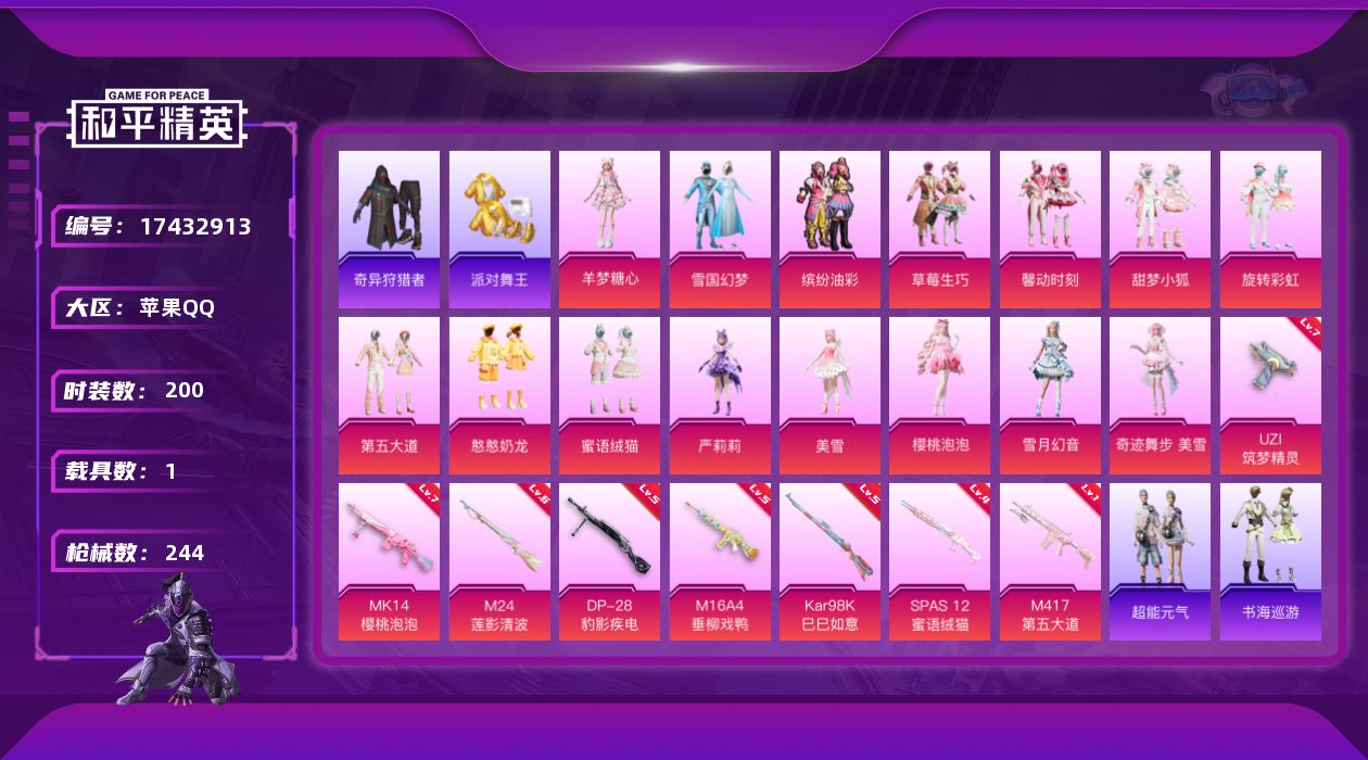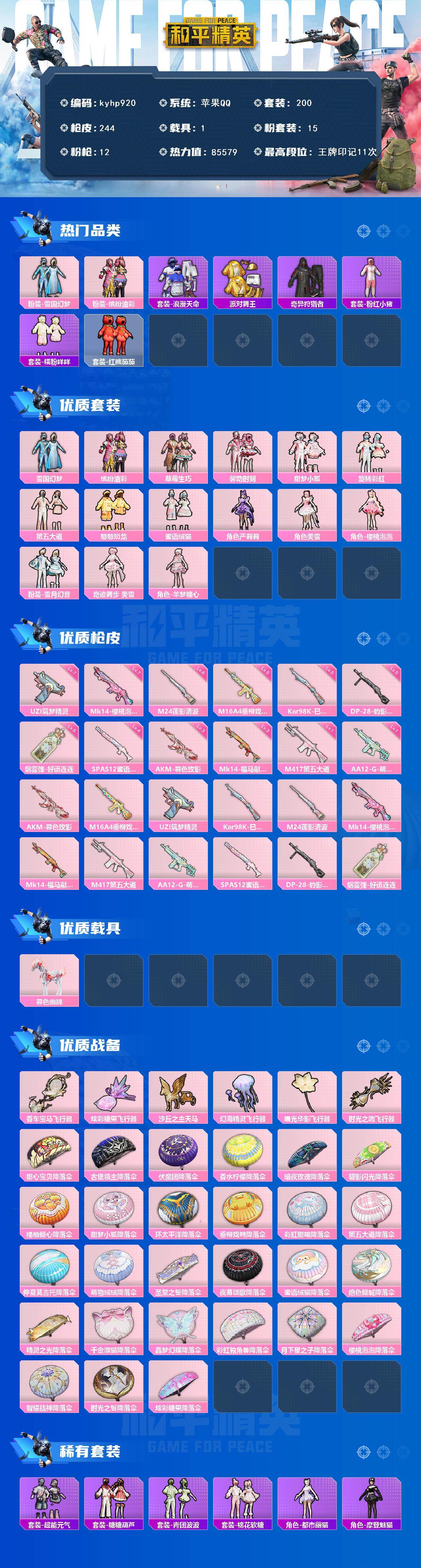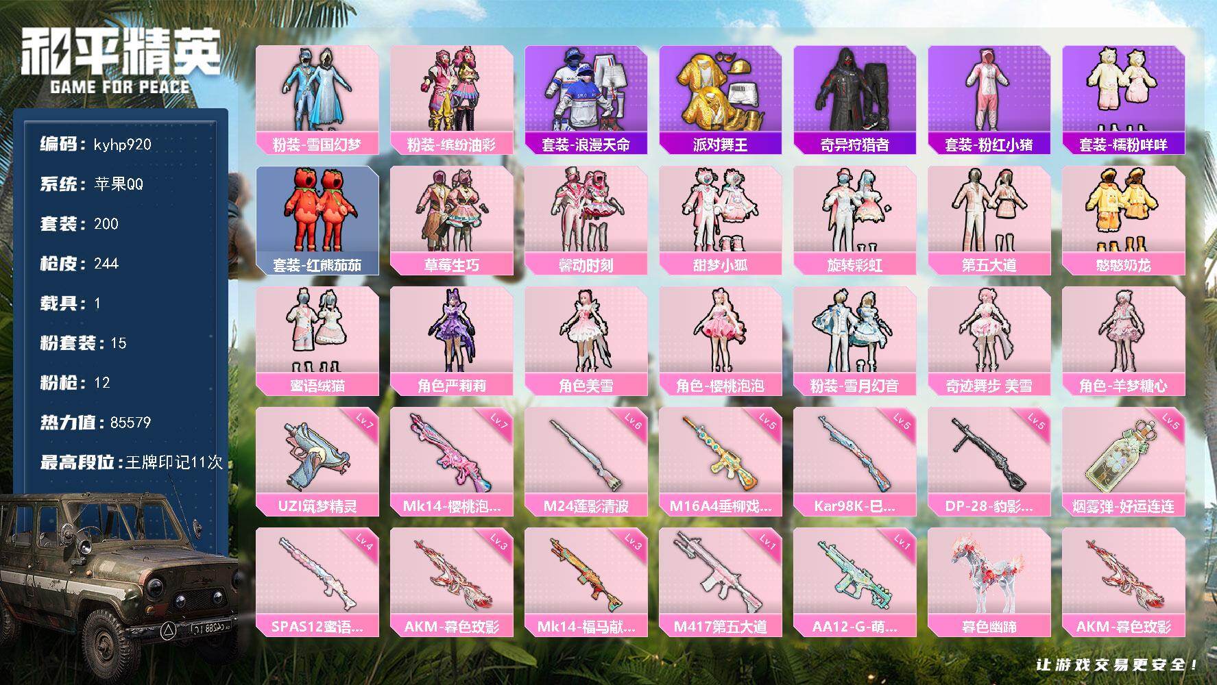 [17432913]苹果 手Q-15粉装-12特效枪-1载具-6粉色飞行器-85579热力值-11王牌印记-200套装-244枪皮