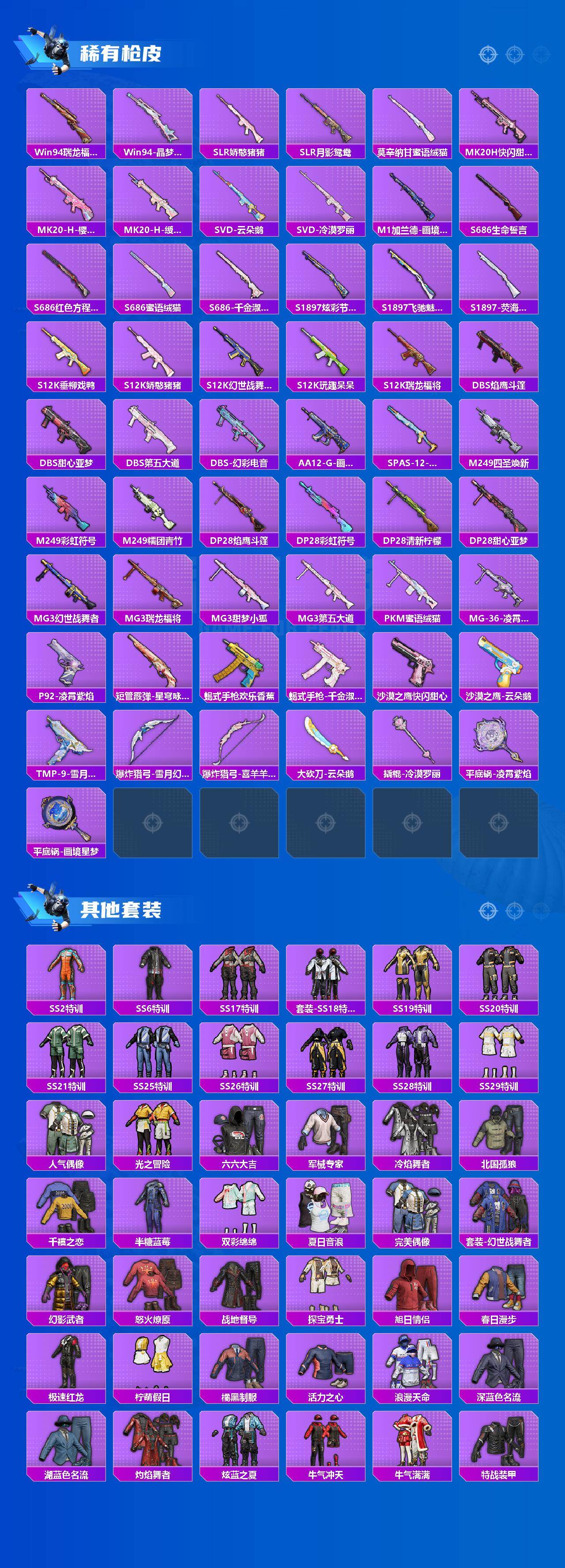 - [17425951]【10435783】16m总资产-281k哈伏币-60烽火等级-钻石-19战场等级-列兵 【干员外观】:威龙-凌霄戍卫,红狼-电锯惊魂 【近战皮肤】:近战-处刑者1级,近战-黑鹰 【传说外观】:M4A1突击步枪-阿米娅,AKM突击步枪-锦绣,QBZ95-1突击步枪-凌霄戍卫,ASh-12战斗步枪-鹅鸭杀,M16A4突击步枪-狩猎时刻,AK-12突击步枪-特斯拉线圈,SCAR-H战斗步枪-启航,G3战斗步枪-狩猎时刻,G3战斗步枪-骑士,CAR-15突击步枪-阿米娅,腾龙突击步枪-马年祥瑞,腾龙突击步枪-万金泪冠,K437突击步枪-锦绣,KC17突击步枪-电锯惊魂,MK47突击步枪-暗星,Vector冲锋枪-狩猎时刻,UZI冲锋枪-特斯拉线圈,SMG-45冲锋枪-锦绣,SR-3M紧凑突击步枪-特斯拉线圈,勇士冲锋枪-能天使-午夜邮差,勇士冲锋枪-万金泪冠,QCQ171冲锋枪-鹅鸭杀,QJB201轻机枪-鹅鸭杀,M14射手步枪-缄花,SR-25射手步枪-缄花,AWM狙击步枪-万金泪冠,.357左轮-缄花,G18-马年祥瑞,复合弓-黑·天际线 【史诗外观】:K416突击步枪-冬日风情,SG552突击步枪-哈夫克警备,G3战斗步枪-哈夫克警备,腾龙突击步枪-猎鳄行动,MP5冲锋枪-战术竞备,MP5冲锋枪-竞技风,P90冲锋枪-紧急戒备,Vector冲锋枪-阿萨拉文明,Vector冲锋枪-猎鳄行动,SMG-45冲锋枪-阿萨拉特攻,SR-3M紧凑突击步枪-战术竞备,勇士冲锋枪-深海恐惧,勇士冲锋枪-工业狂潮,MP7冲锋枪-六套之力,S12K霰弹枪-曙光,PKM通用机枪-蝮蛇,M250通用机枪-囚徒,QJB201轻机枪-炽焰,QJB201轻机枪-Old Habits,M14射手步枪-工业狂潮,SV-98狙击步枪-林中猎手,SV-98狙击步枪-囚徒,SV-98狙击步枪-猎鳄行动,M700狙击步枪-竞技风 【稀有外观】:M4A1突击步枪-银灰金属,Vector冲锋枪-银灰金属,AKM突击步枪-青纹,AK-12突击步枪-青纹,K416突击步枪-星之彩,MP5冲锋枪-星之彩,P90冲锋枪-星之彩,MP7冲锋枪-黑潮,M700狙击步枪-极地勘察队,M4A1突击步枪-街头艺术,AKM突击步枪-肃杀,QBZ95-1突击步枪-公平竞技,K416突击步枪-一帆风顺,M7战斗步枪-捣蛋鬼,SG55
