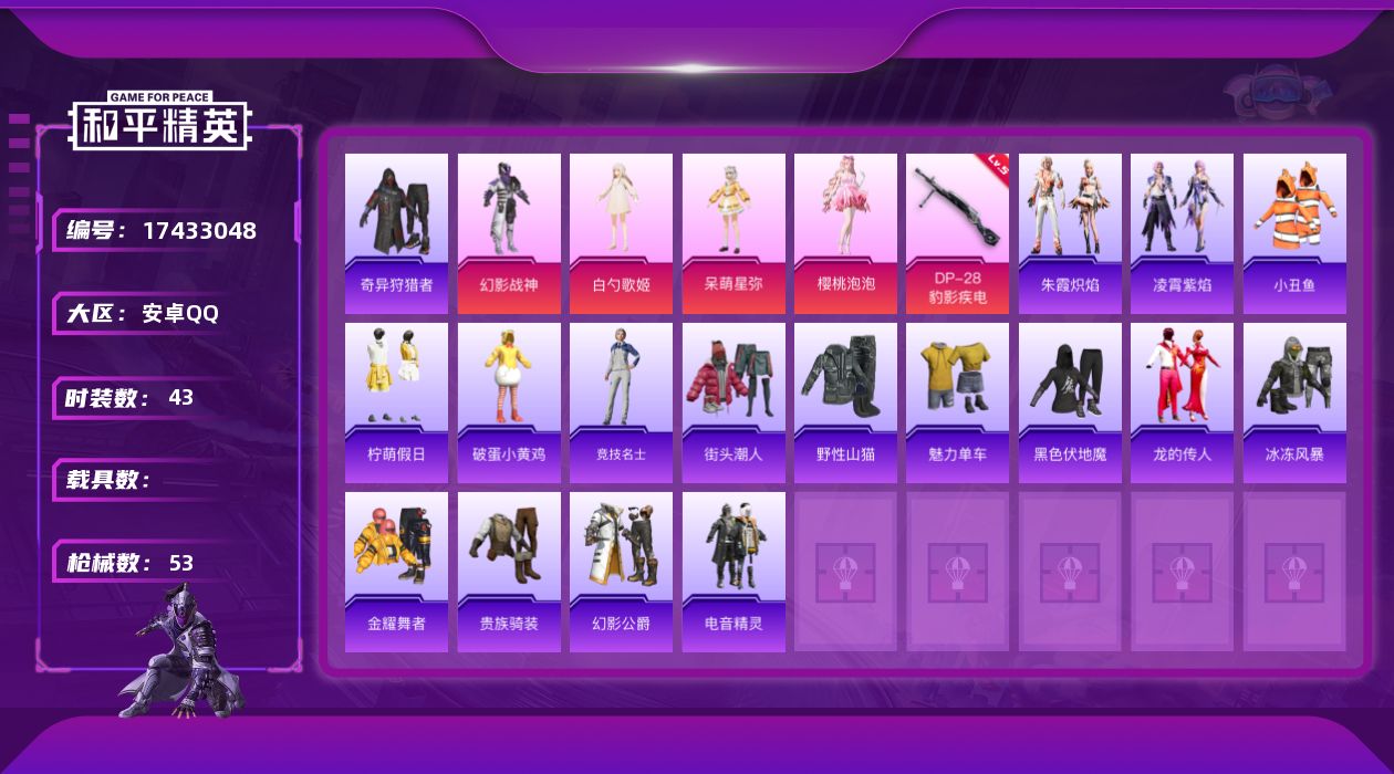 [17433048]安卓 手Q-5粉装-4特效枪-0载具-0粉色飞行器-14232热力值-1王牌印记-43套装-53枪皮 【热门品类】:套装-小丑鱼,套装-奇异狩猎者 【粉色套装】:角色-女王,粉装-幻影战神,角色-白勺歌姬,角色-呆萌星弥,角色-樱桃泡泡 【粉色枪皮等级】:UMP45-萌骑冒险(五级),AKS-74U-森灵之息(五级),Mk14-福马献瑞(二级),DP-28-豹影疾电(五级) 【粉色枪皮】:UMP45-萌骑冒险,AKS-74U-森灵之息,Mk14-福马献瑞,DP-28-豹影疾电 【粉色降落伞】:幻影战神降落伞,白勺歌姬降落伞,荧海星豚降落伞 【稀有套装】:套装-绿野诗集,角色-奈斯,角色-罗莉,角色-幸运青,角色-X,角色-阿虎,套装-马上来财,套装-朱霞炽焰,套装-凌霄紫焰,套装-雨过天青,套装-红釉青花,玩偶服-会说话的汤姆猫,角色-绯影武装 【稀有枪皮】:M16A4-绒绒猫尾,GROZA-影袭,AUG-幻影战神,ARX-凌霄紫焰,UZI-幻影战神,汤姆逊-幻影战神,汤姆逊-绒绒猫尾,汤姆逊-像素花束,JS9-凌霄紫焰,P90-绯影武装,Kar98K-幻影战神,SKS-炫彩节奏,AMR-白勺歌姬,SVD-绯影武装,S686-白勺歌姬,S12K-幻影战神,SPAS-12-钛晶裂爪,M249-星之彼岸,M249-绒绒猫尾,MG-36-凌霄紫焰,P92-凌霄紫焰,蝎式手枪-千金淑猫,F57-绯影武装,平底锅-凌霄紫焰 【其他套装】:套装-NV战队服,套装-柠萌假日,套装-破蛋小黄鸡,套装-竞技名士,套装-街头潮人,套装-野性山猫,套装-魅力单车,套装-黑色伏地魔,套装-龙的传人,套装-冰冻风暴,套装-奇异狩猎者,套装-金耀舞者,套装-贵族骑装,套装-幻影公爵,套装-电音精灵 【稀有头盔】:幻影战神头盔(3级),幻影战神头盔(2级),幻影战神头盔(1级),深海小丑鱼头盔(1级) 【稀有背包】:幻影战神背包(3级),幻影战神背包(2级),幻影战神背包(1级) 【营地ID】:1027468058